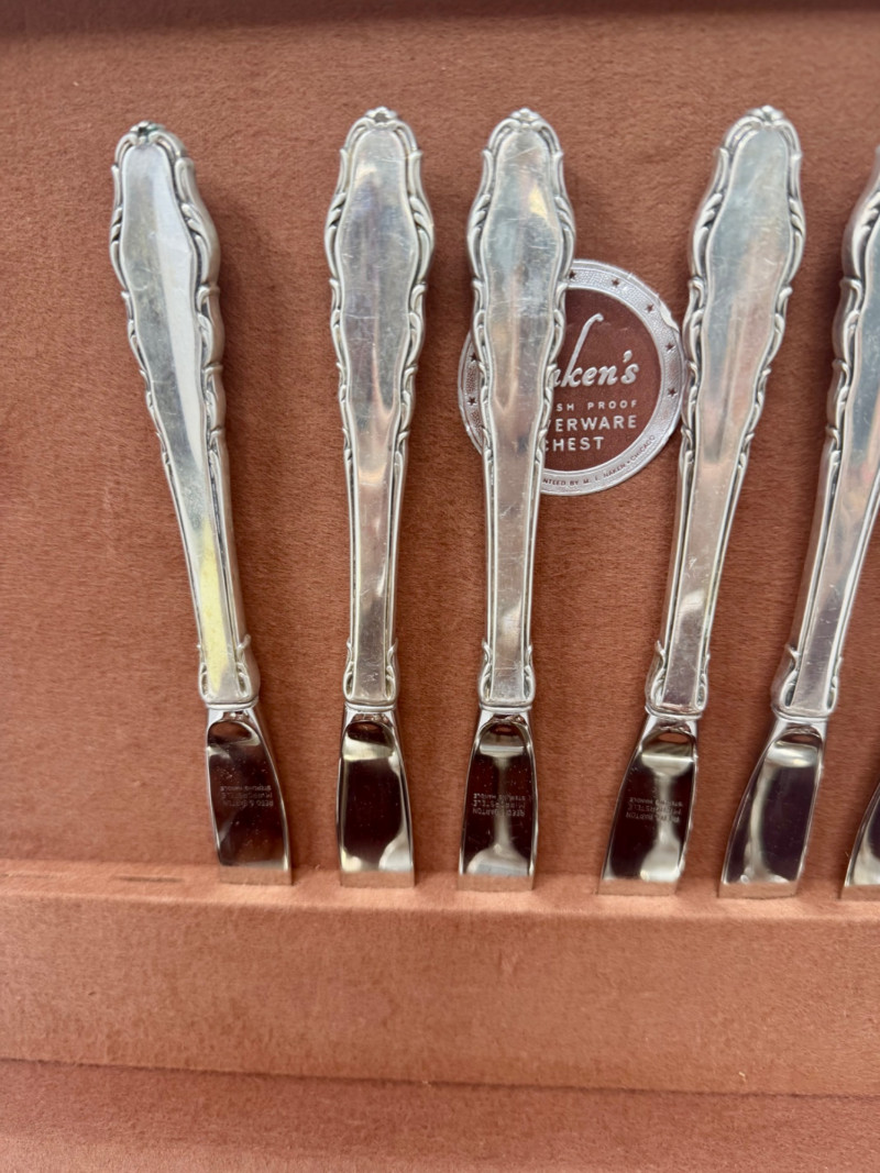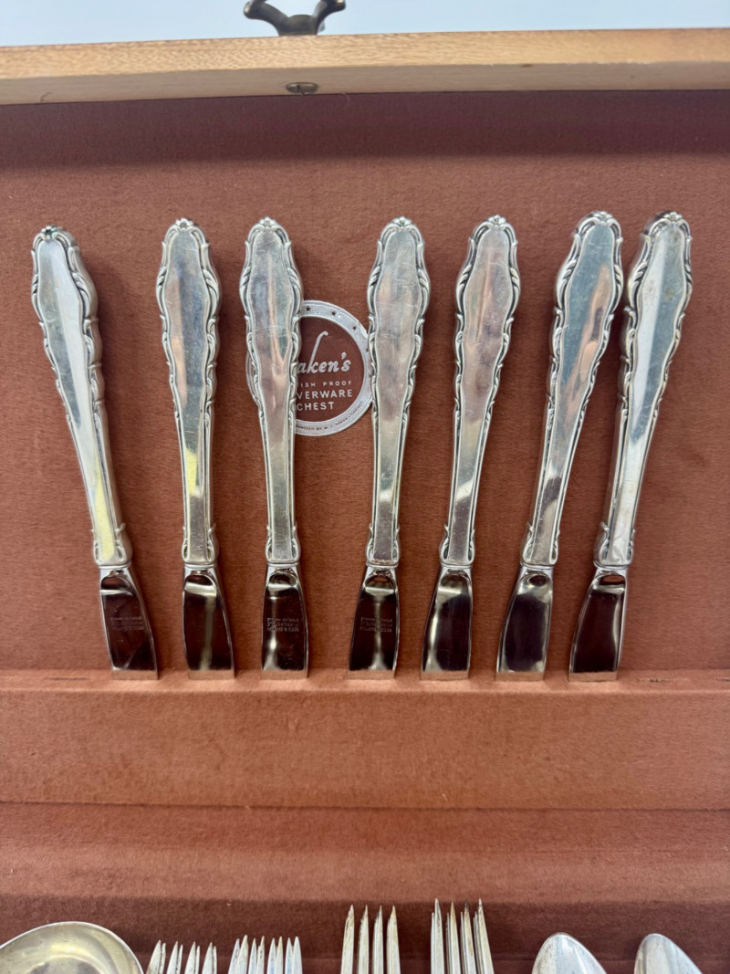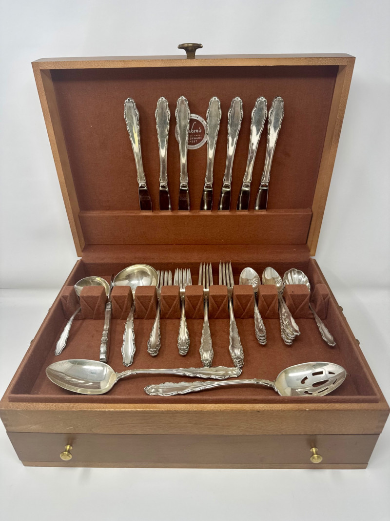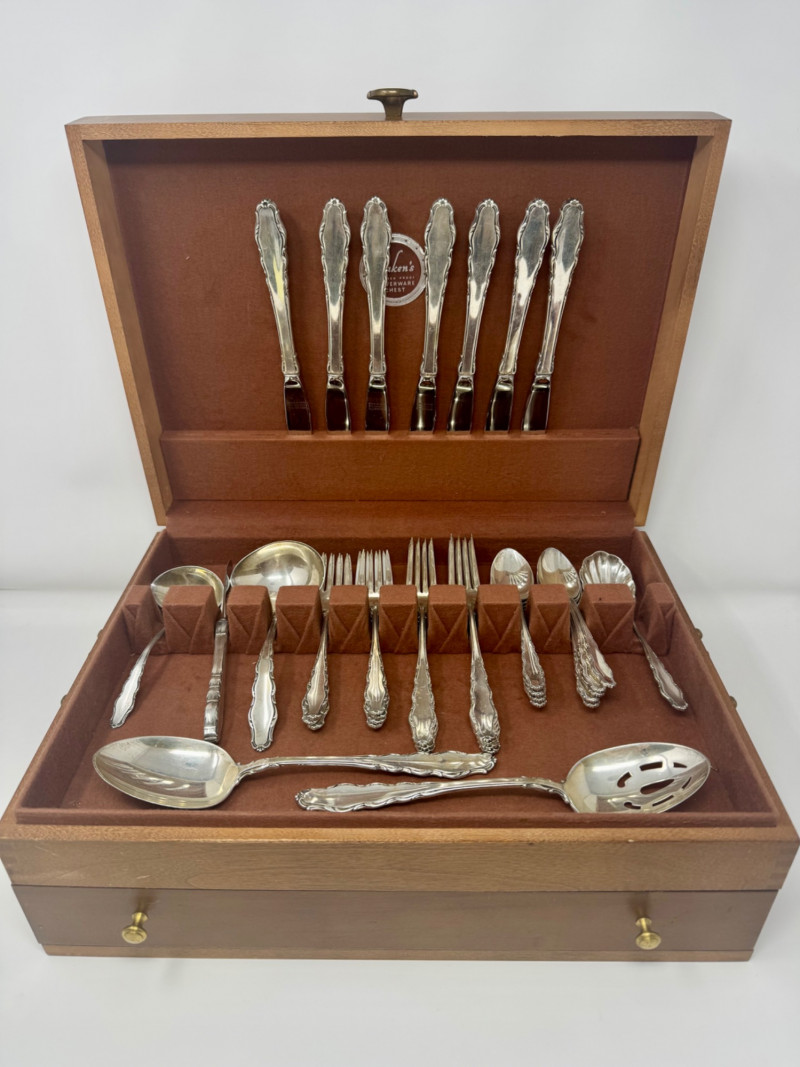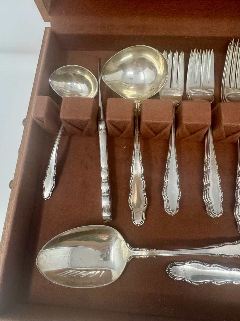 Reed & Barton Sterling Silver Flatware Set in Wooden Case - 34 Pieces. 7 dinner knives (sterling handles) 7 large forks 7 small forks 9 teaspoons 1 butter knife 2 large serving spoons 2 soup-style serving ladles 1 shell-shaped spoon