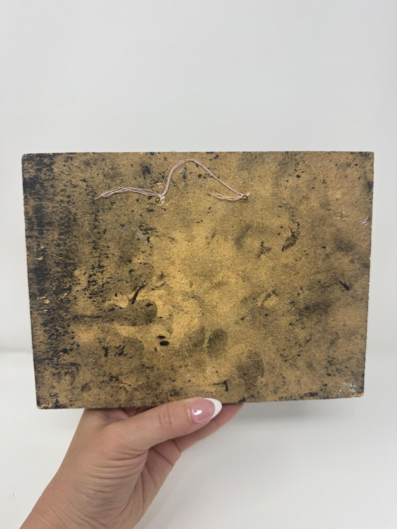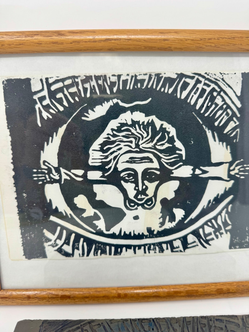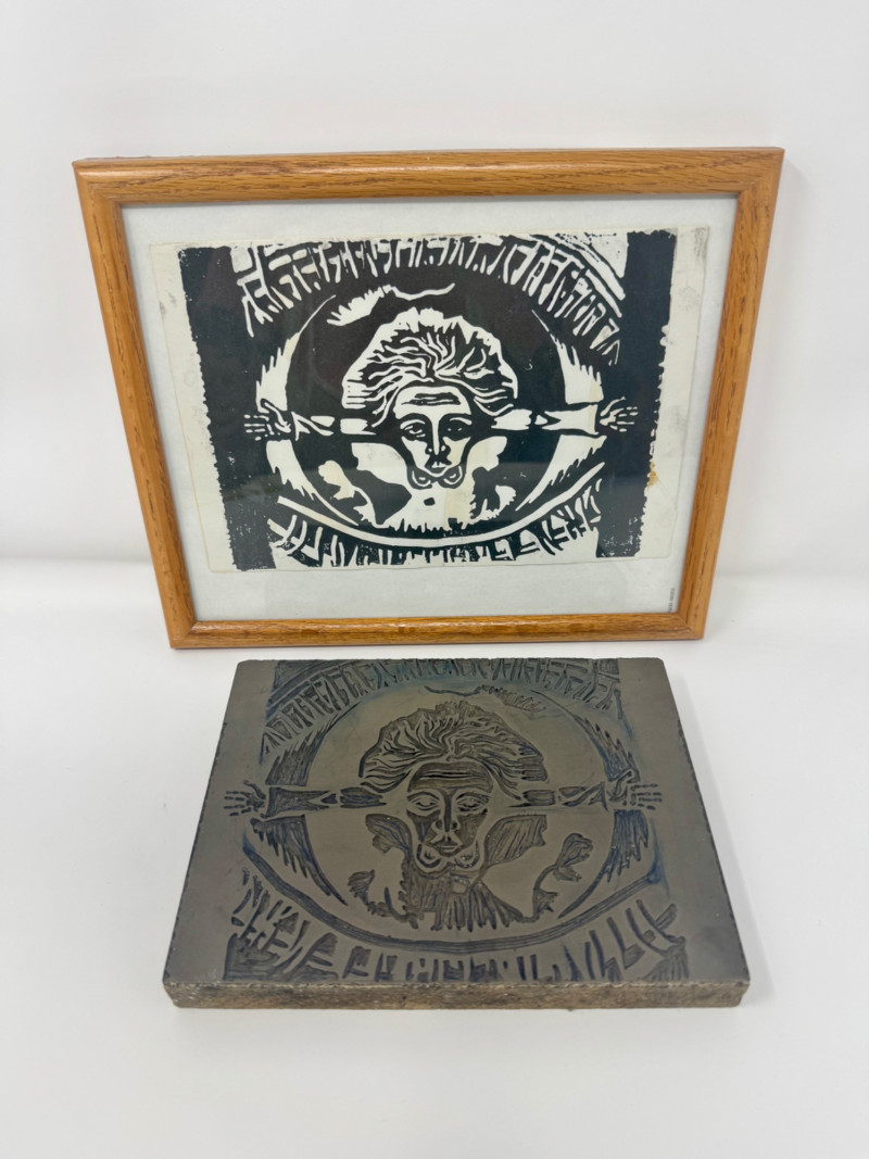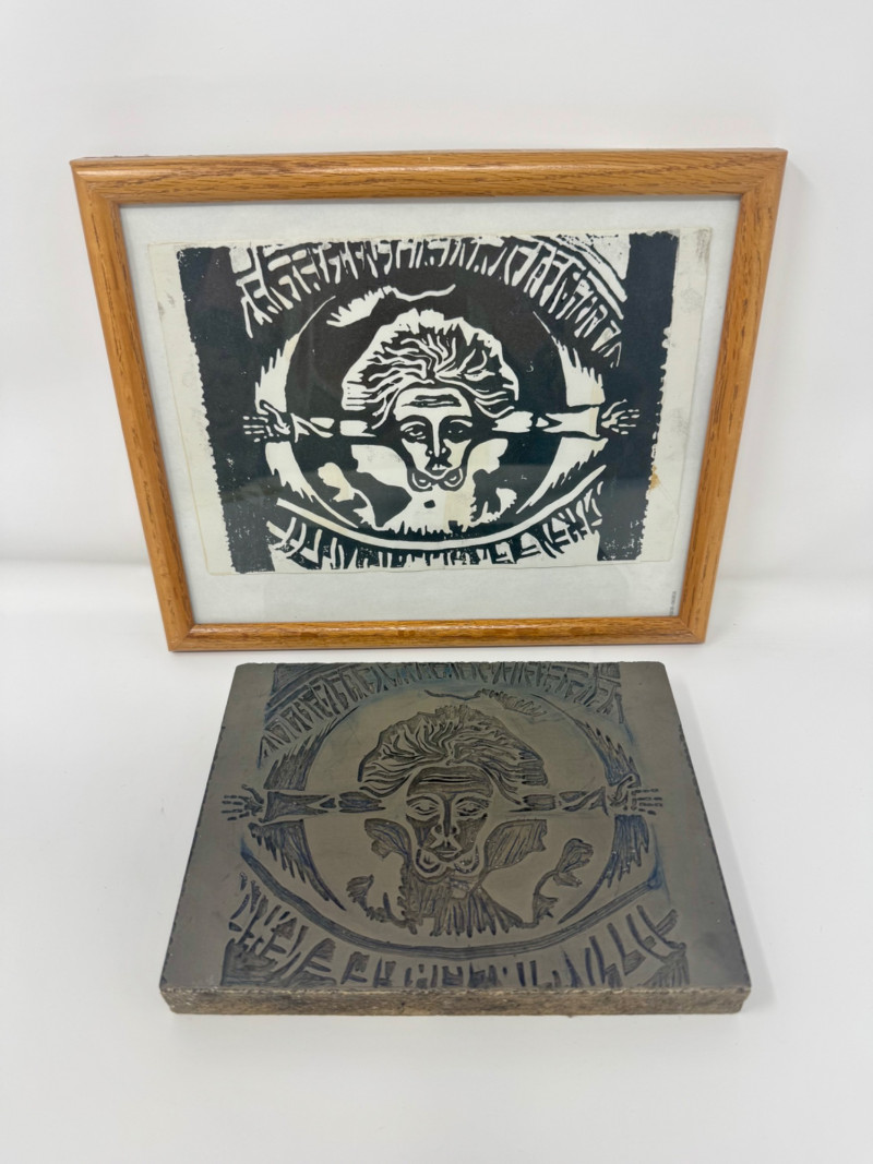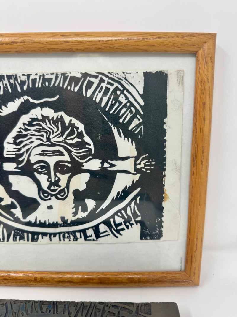 Woodblock Print & Carved Stamp – Expressive Face Design. Framed Art Is 11 X 9” Woodblock Stamp 8 X 6”