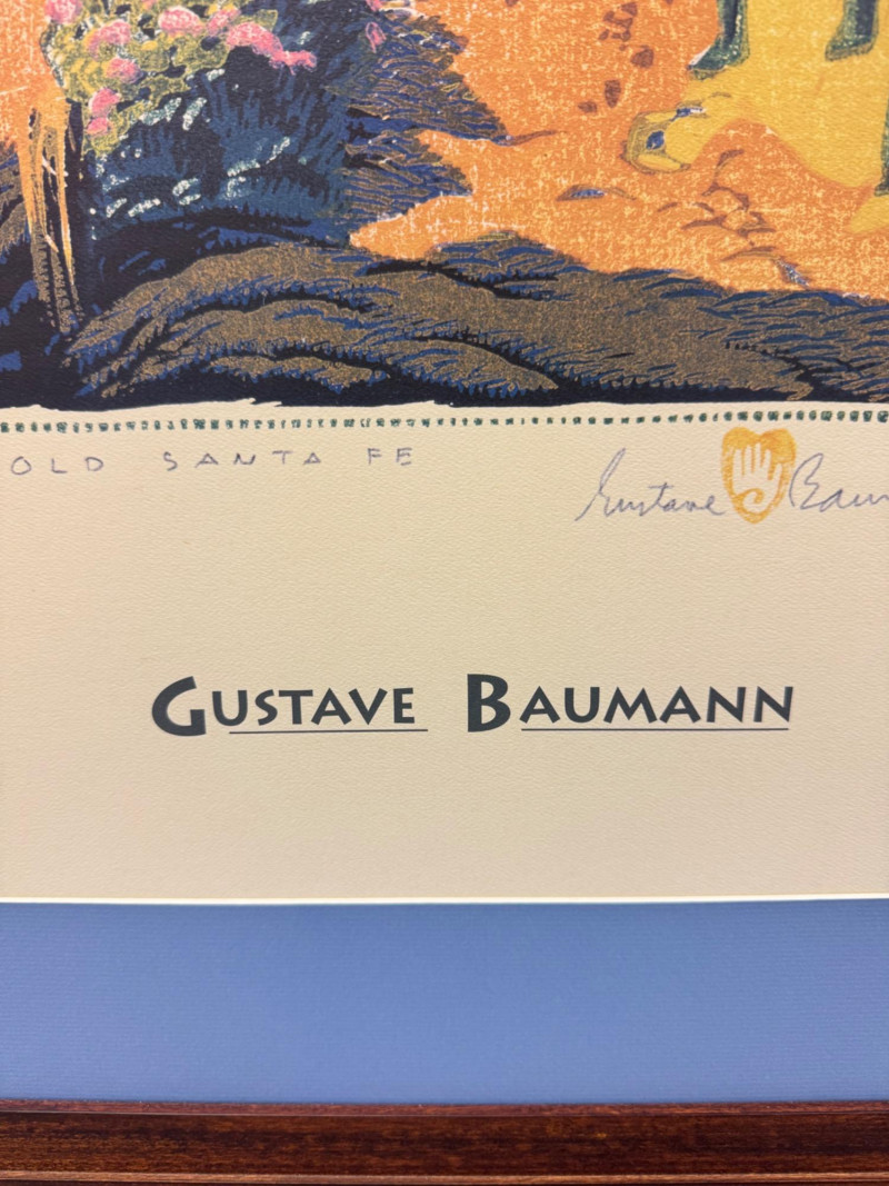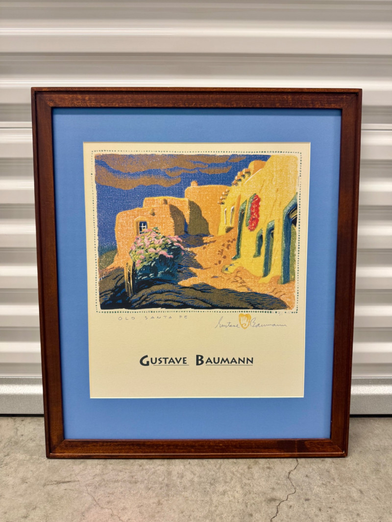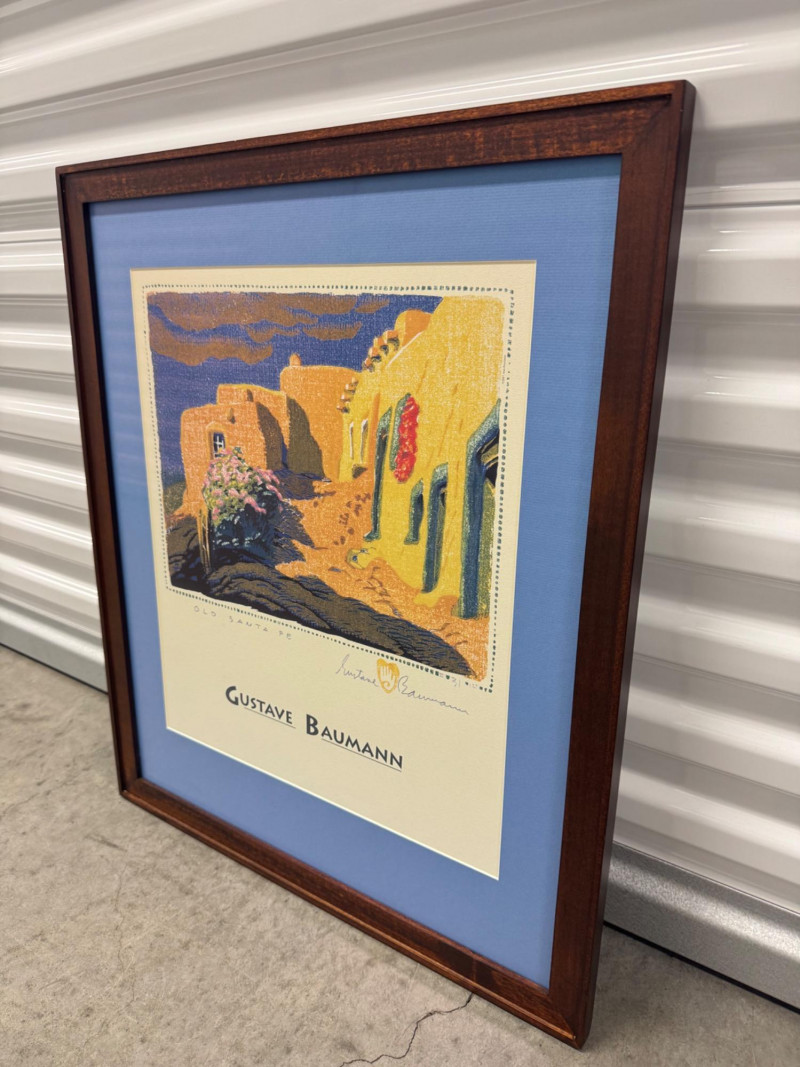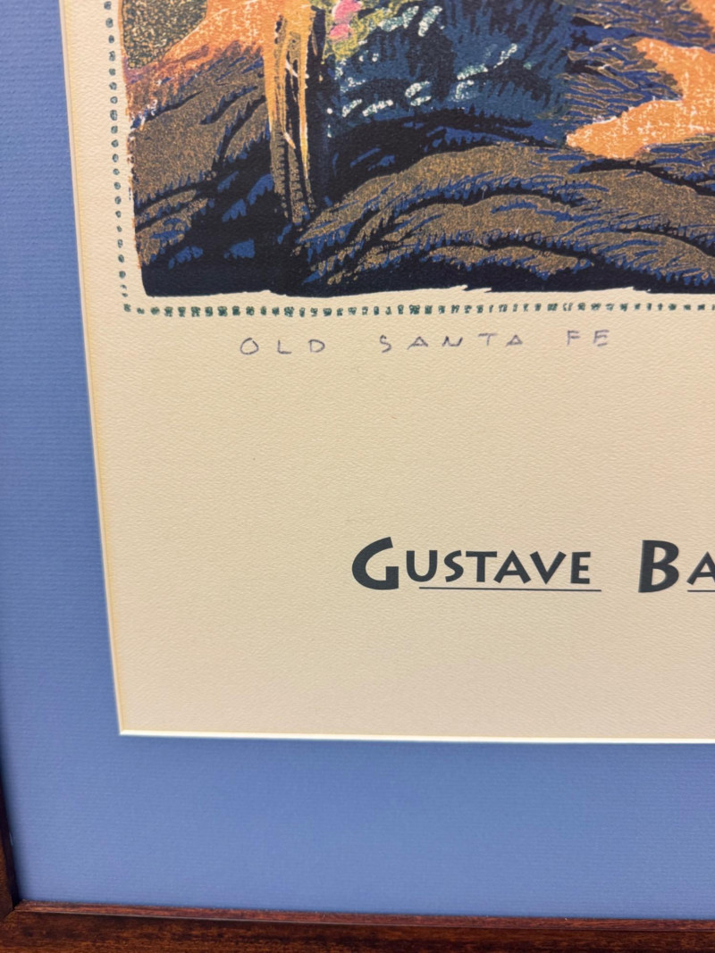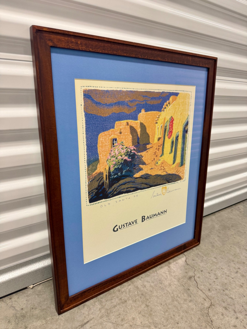Gustave Baumann “Old Santa Fe” Signed Framed Poster, 2007 Print. Professionally Framed 2007 Reproduction. 22 x 26.5” Gustave Baumann (1881–1971) was a preeminent German-American printmaker known for his mastery of the color woodcut. After studying at the Art Institute of Chicago, he gained widespread recognition, including a gold medal at the 1915 Panama-Pacific Exposition. Baumann moved to Santa Fe, New Mexico, in 1918, where he lived the rest of his life. His work is featured in major collections, including The Metropolitan Museum of Art and the Art Institute of Chicago.
