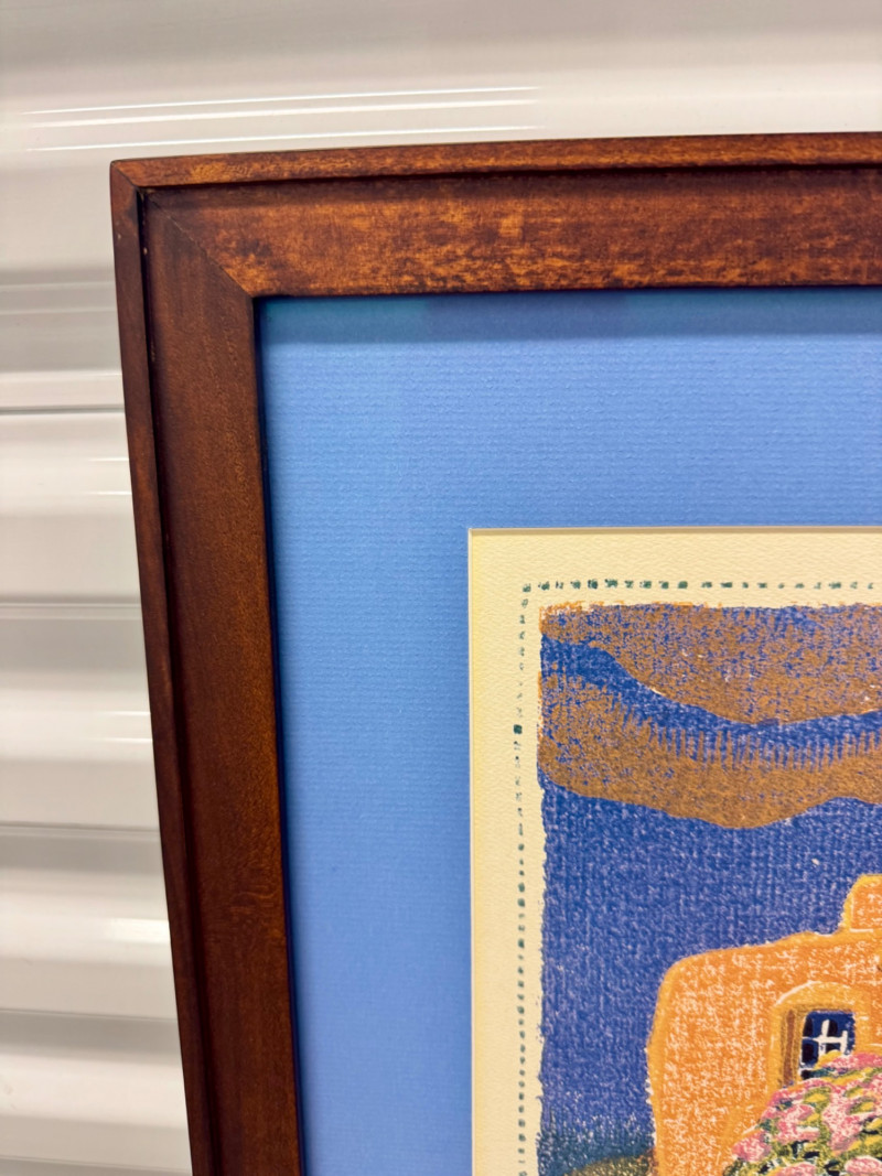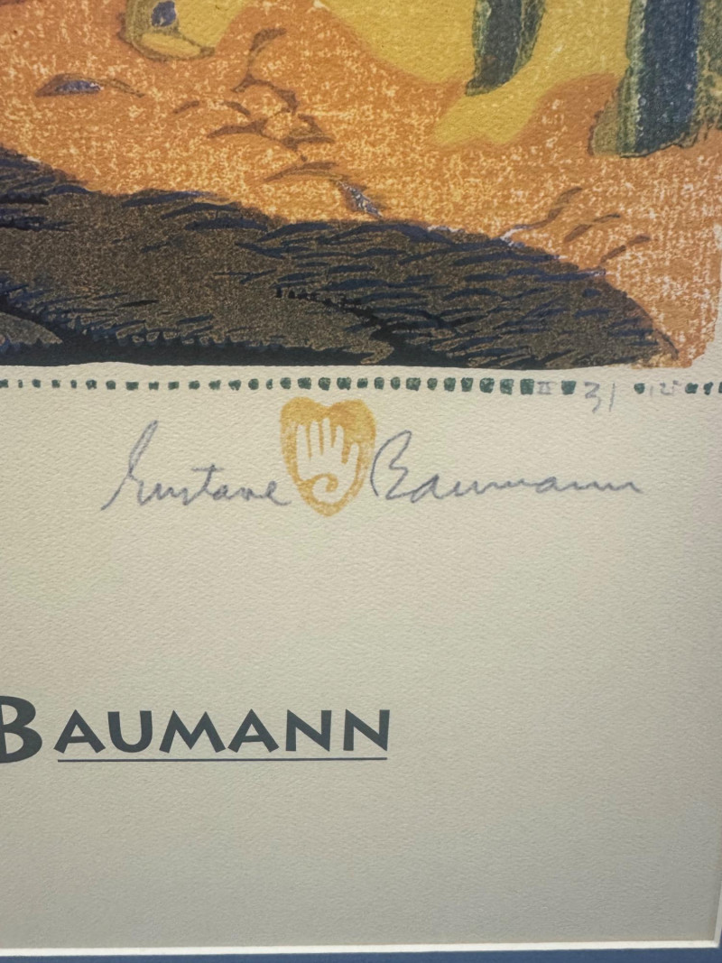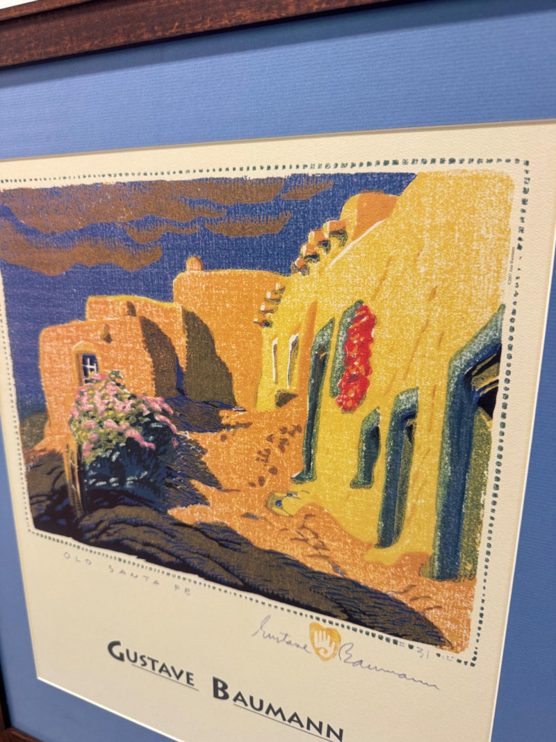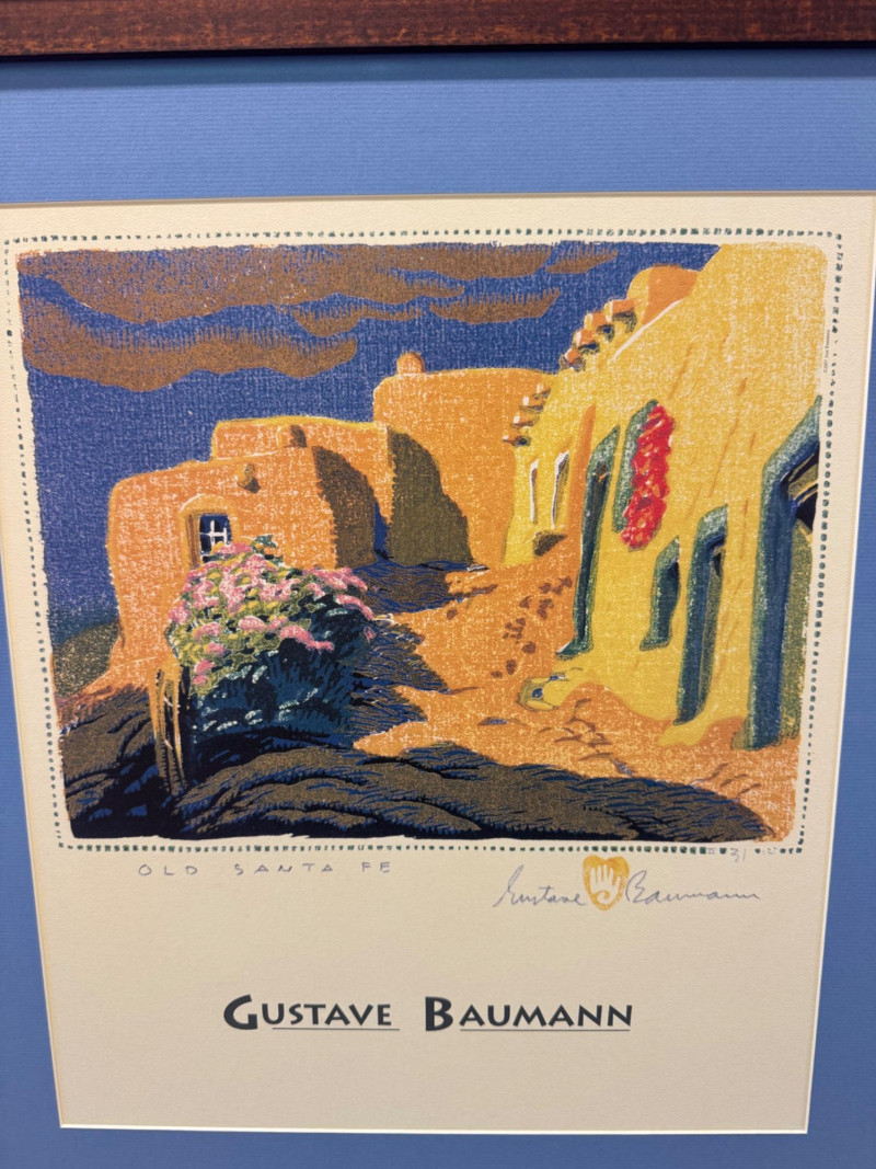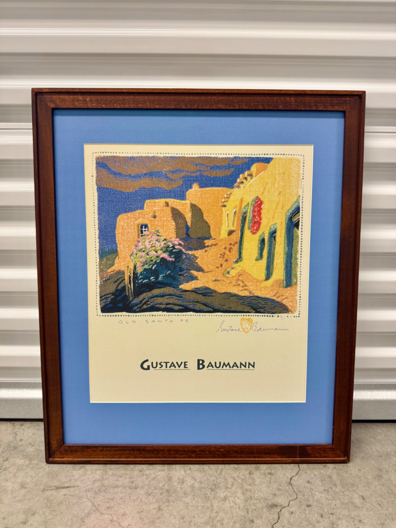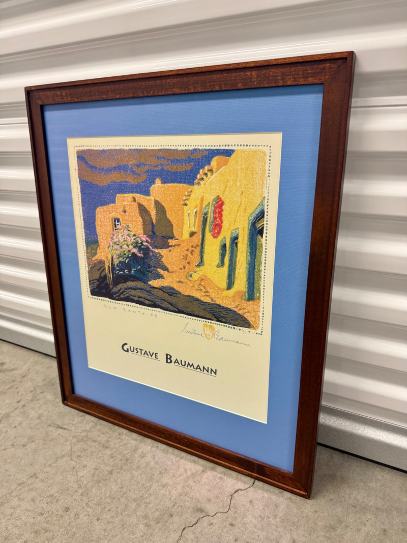 Gustave Baumann “Old Santa Fe” Signed Framed Poster, 2007 Print. Professionally Framed 2007 Reproduction. 22 x 26.5” Gustave Baumann (1881–1971) was a preeminent German-American printmaker known for his mastery of the color woodcut. After studying at the Art Institute of Chicago, he gained widespread recognition, including a gold medal at the 1915 Panama-Pacific Exposition. Baumann moved to Santa Fe, New Mexico, in 1918, where he lived the rest of his life. His work is featured in major collections, including The Metropolitan Museum of Art and the Art Institute of Chicago.