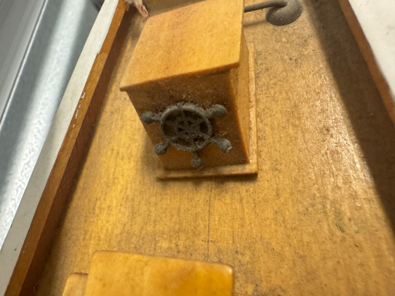 Handcrafted Wooden Sailboat Model w/ Canvas Sails. 30” Tall 28” Wide Note: One mast/sail has a broken wooden piece and will need repair.