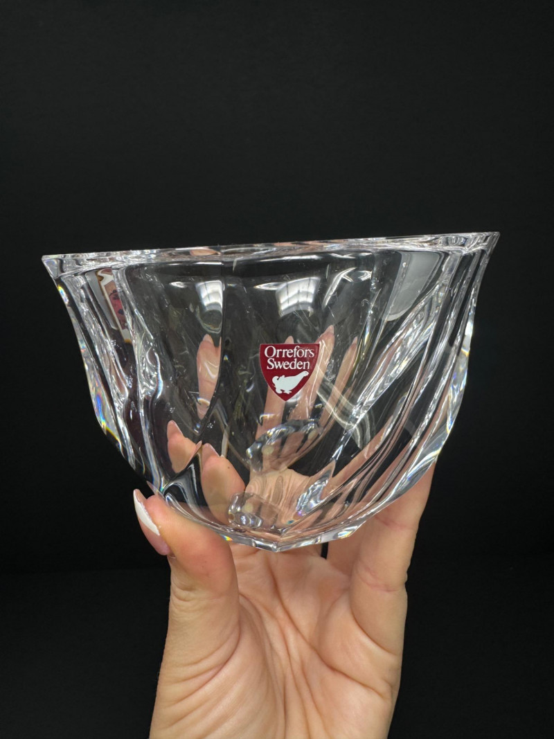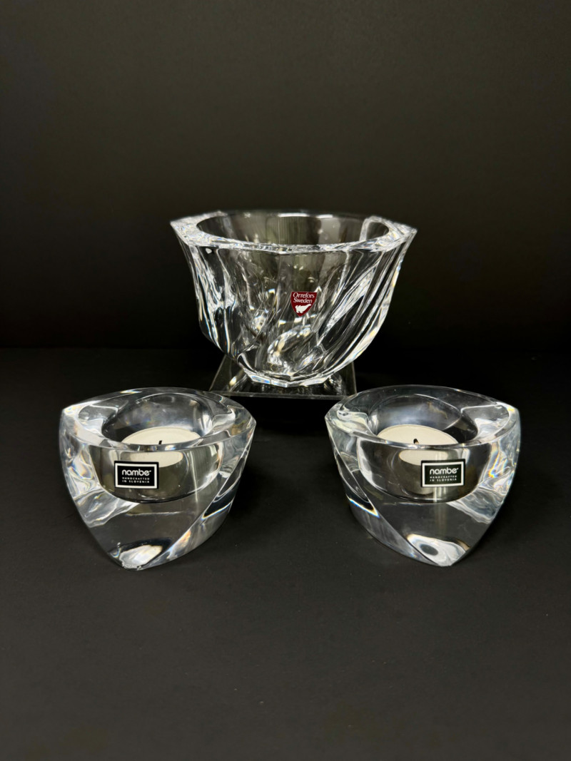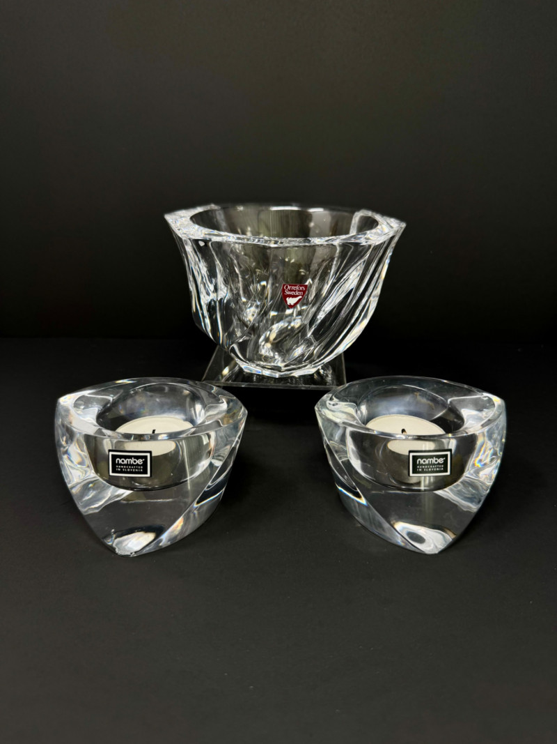 Nambe Crystal Votive Candle Holders & Signed Orrefors "Residence" Bowl. Orrefors 3” Tall Nambe 5” Wide
