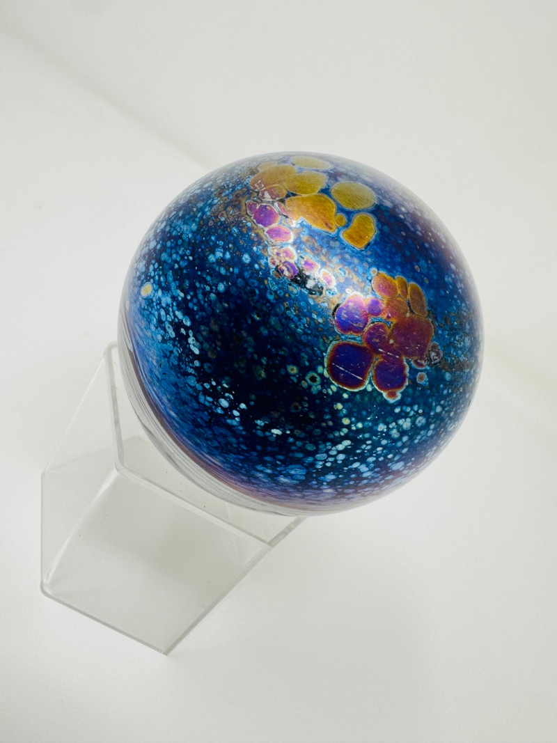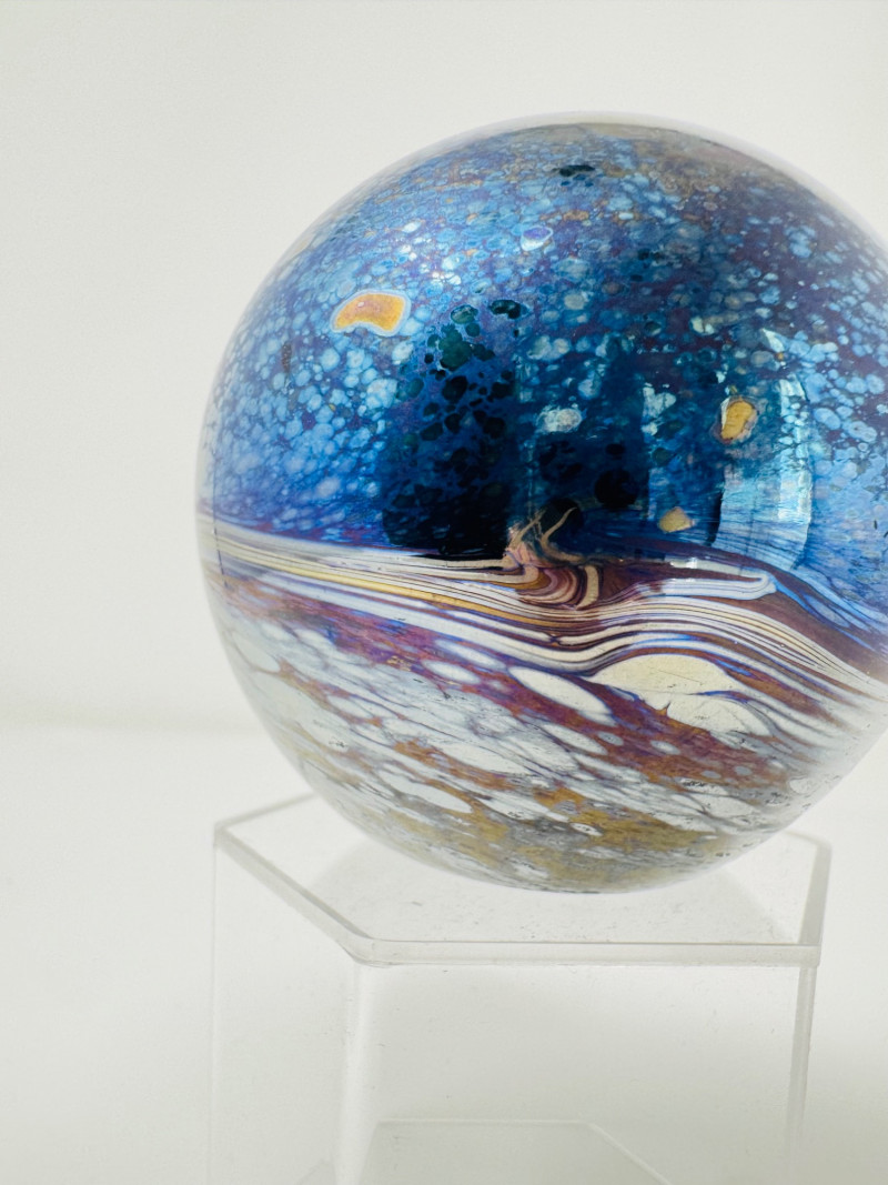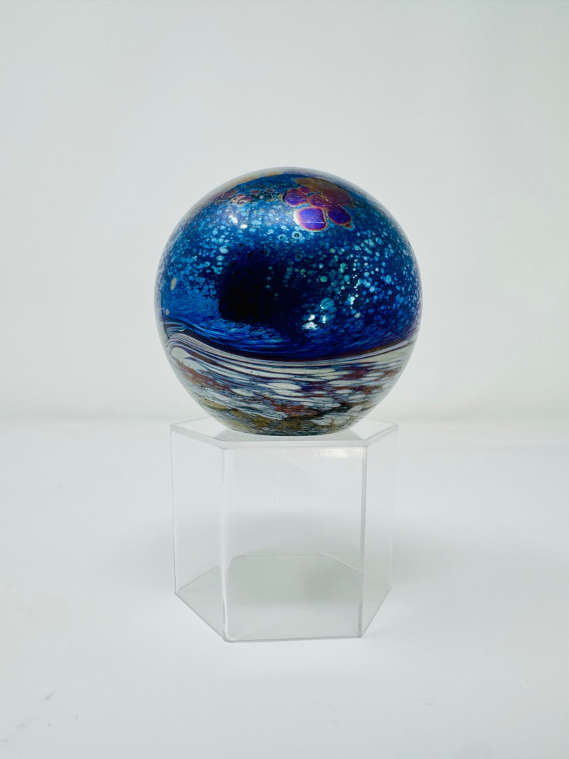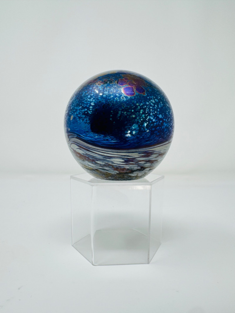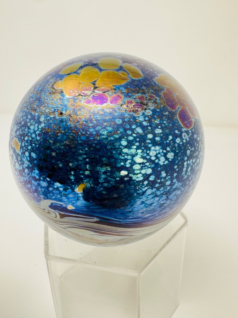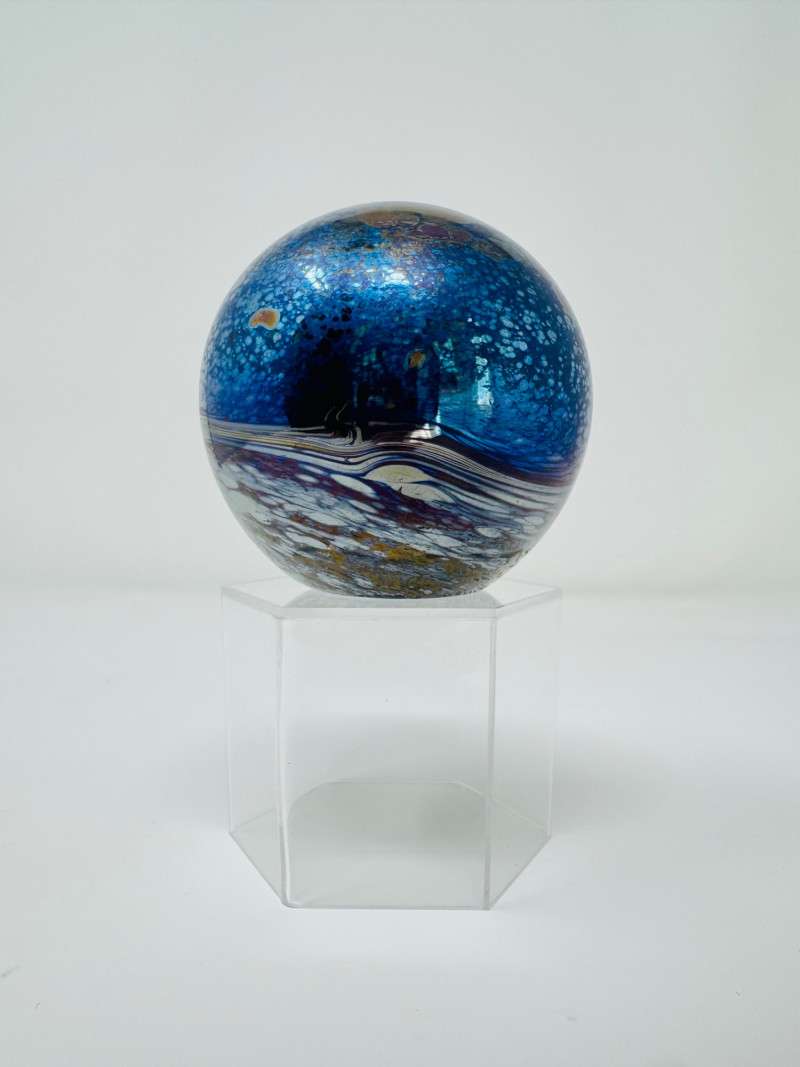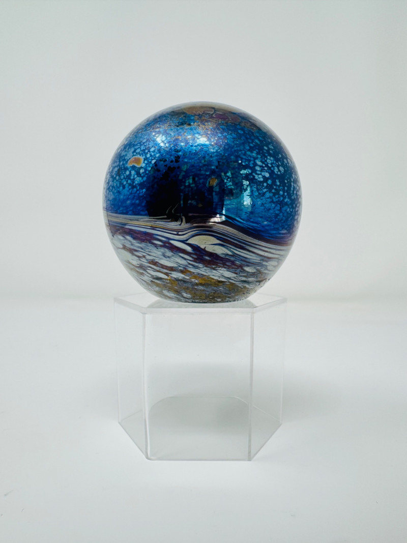 Iridescent Blue & Metallic Art Glass Sphere – Signed “Glasform”