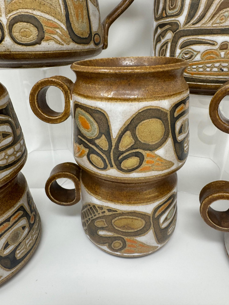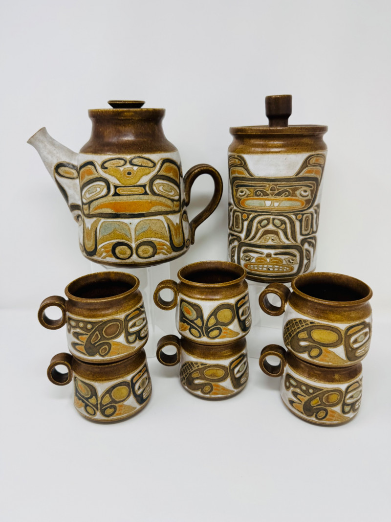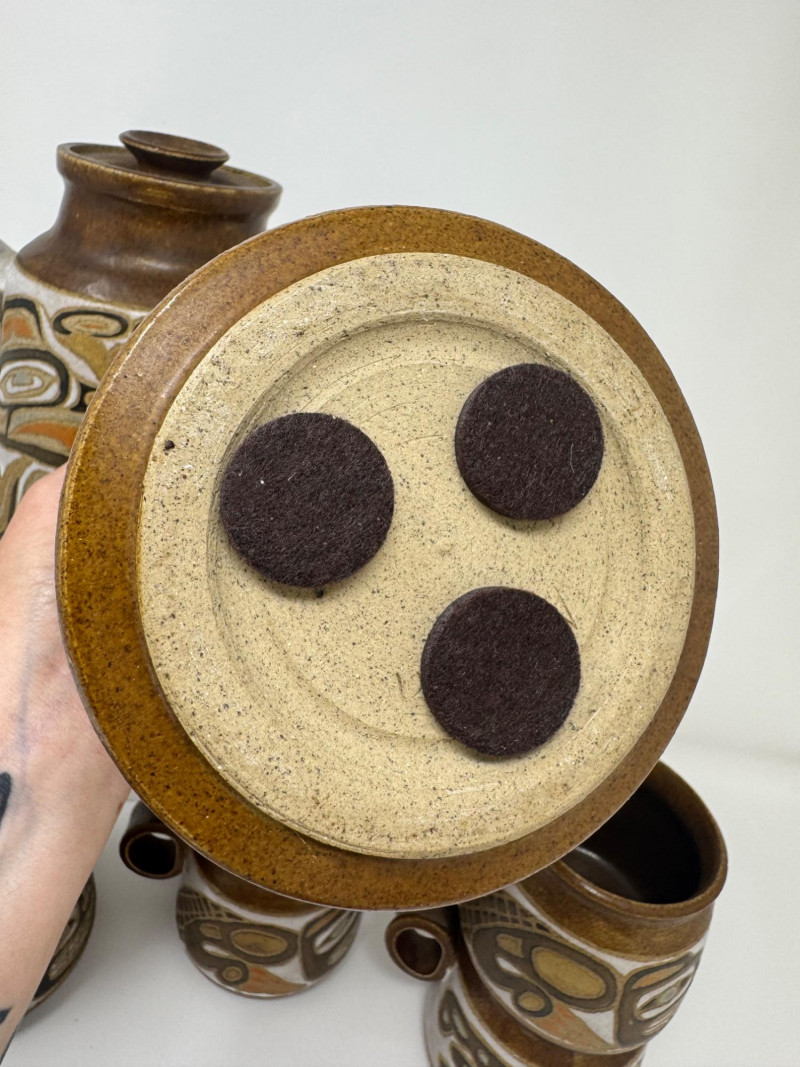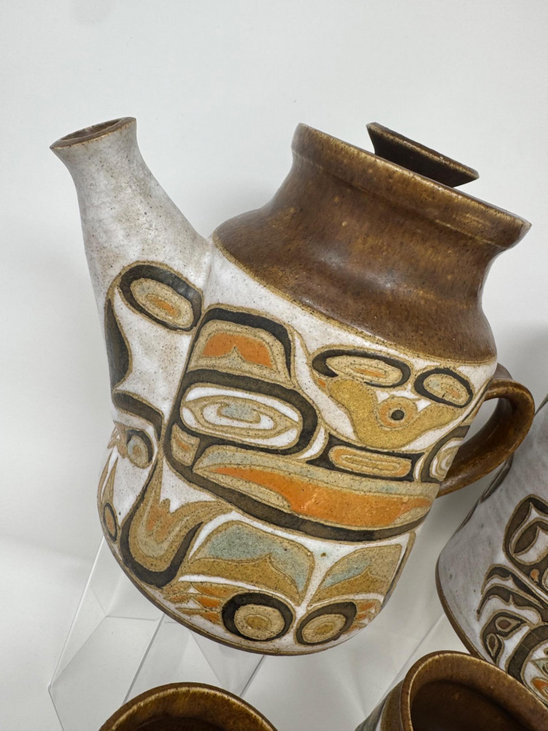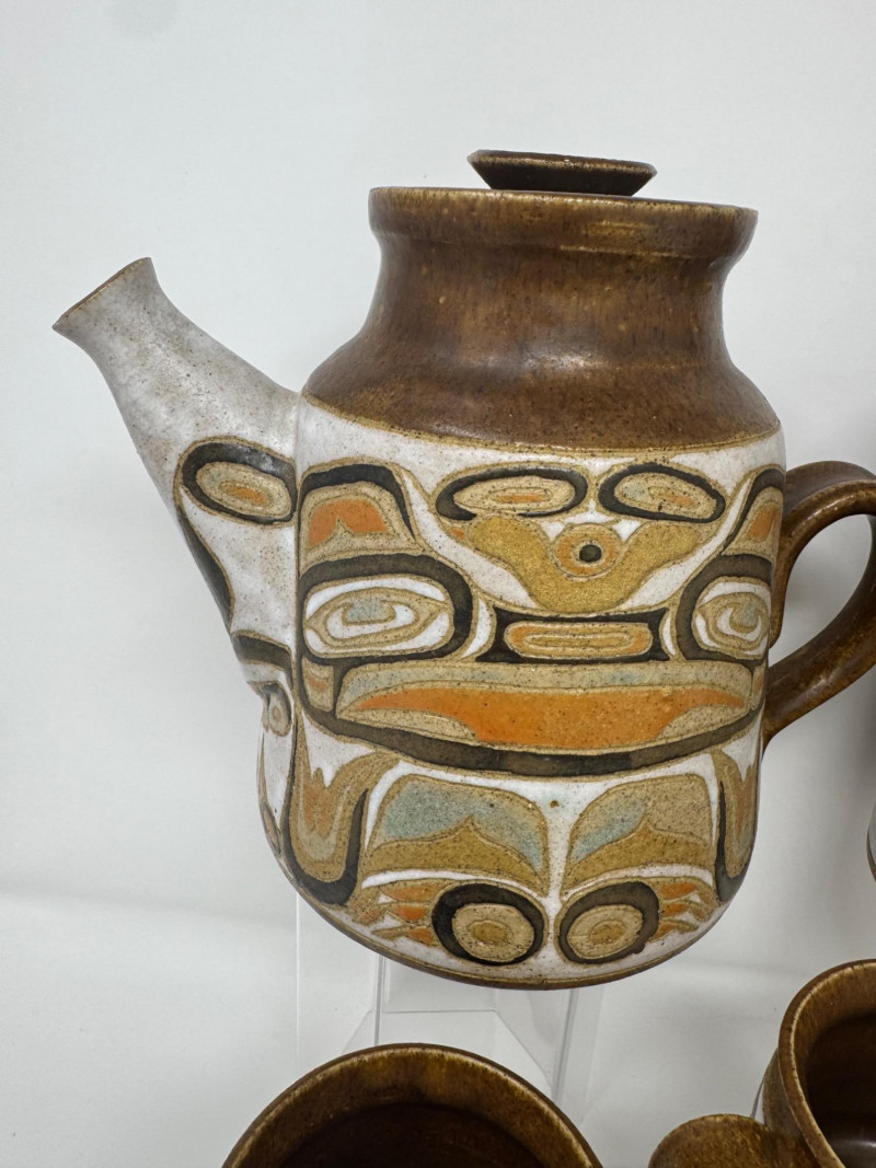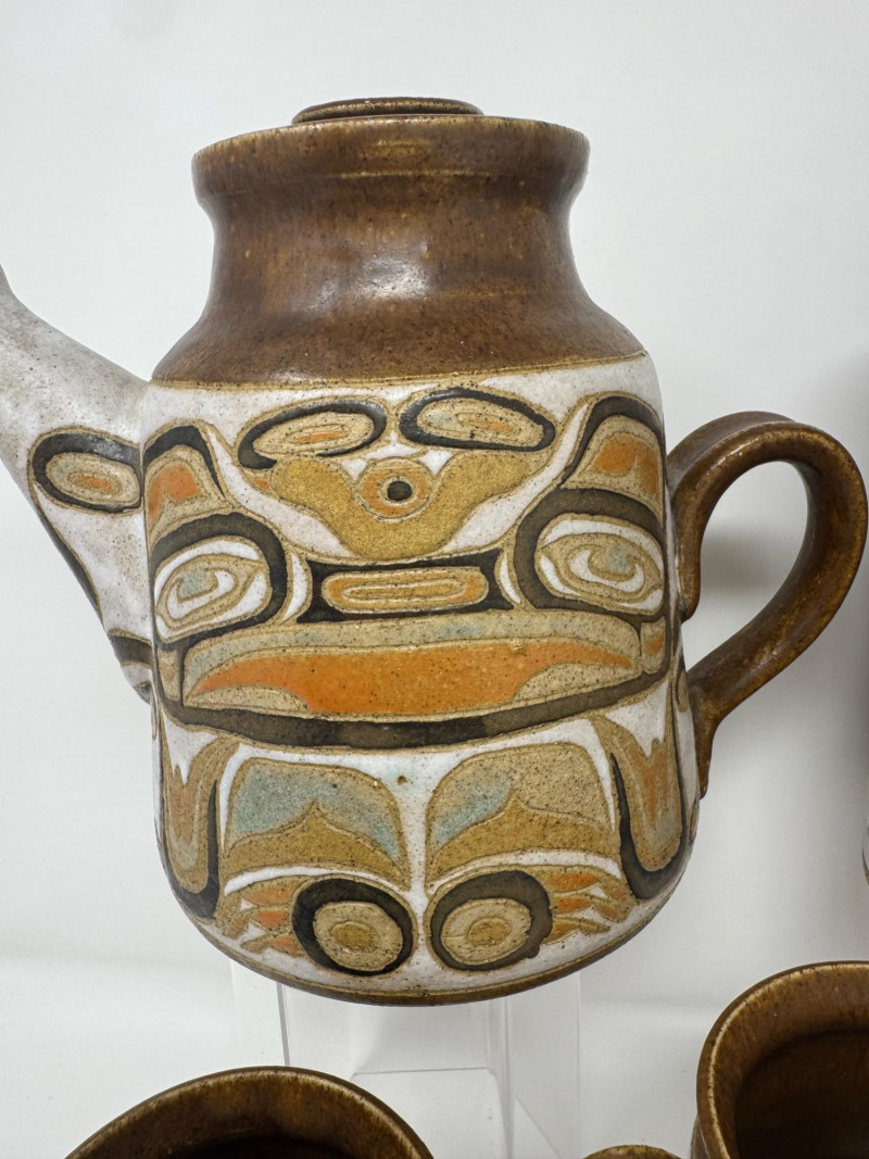 Arlene Mickelson Studio Pottery Teapot, Canister & 6 Mugs Set. Note: Teapot is 7.5” tall and has a chip on the spout. Lidded Canister 8.5” Tall