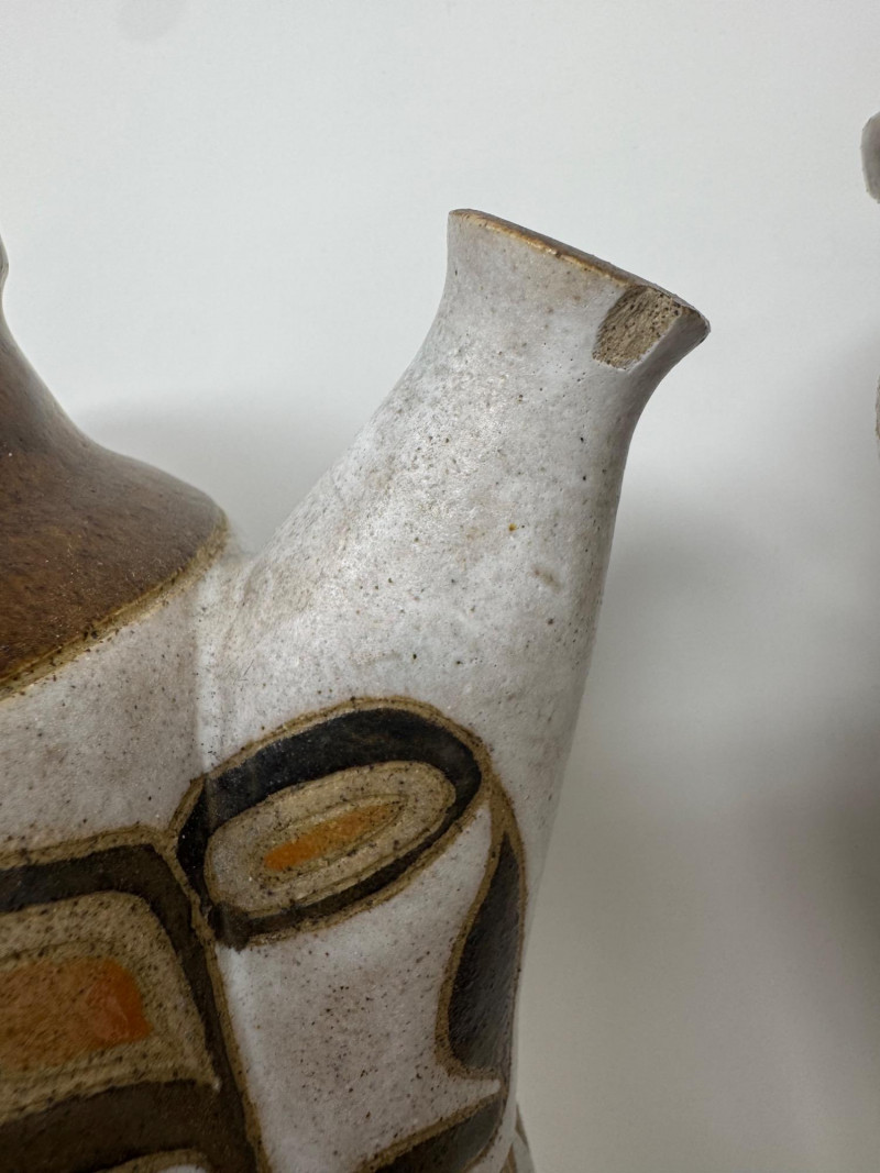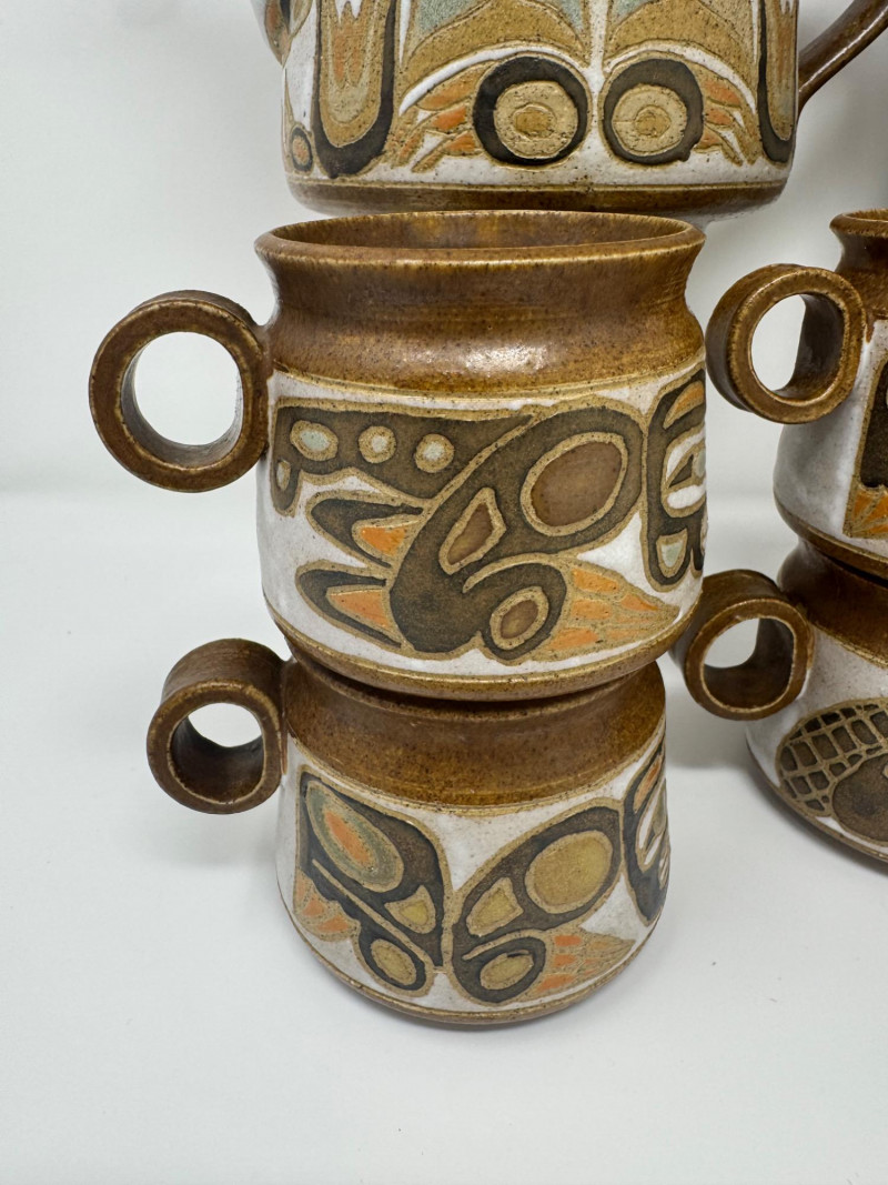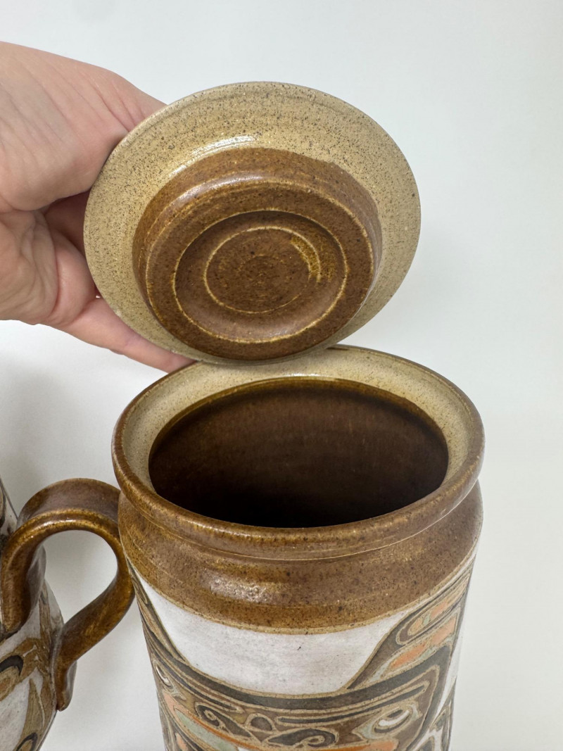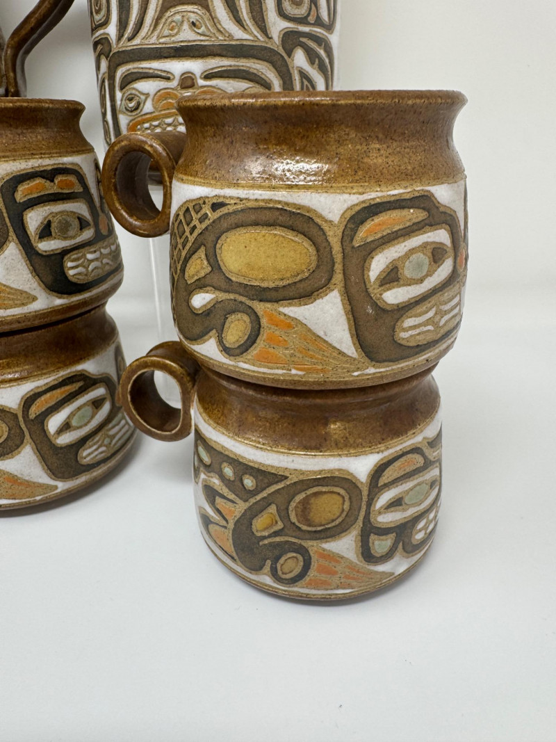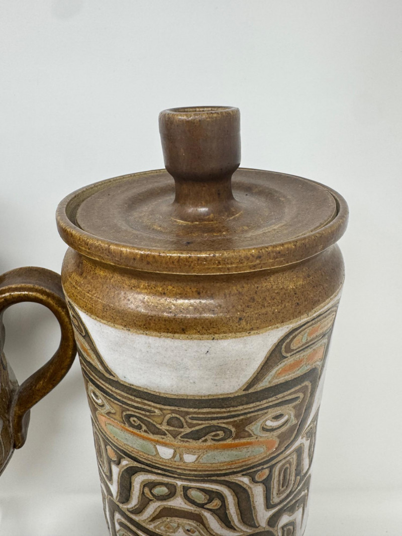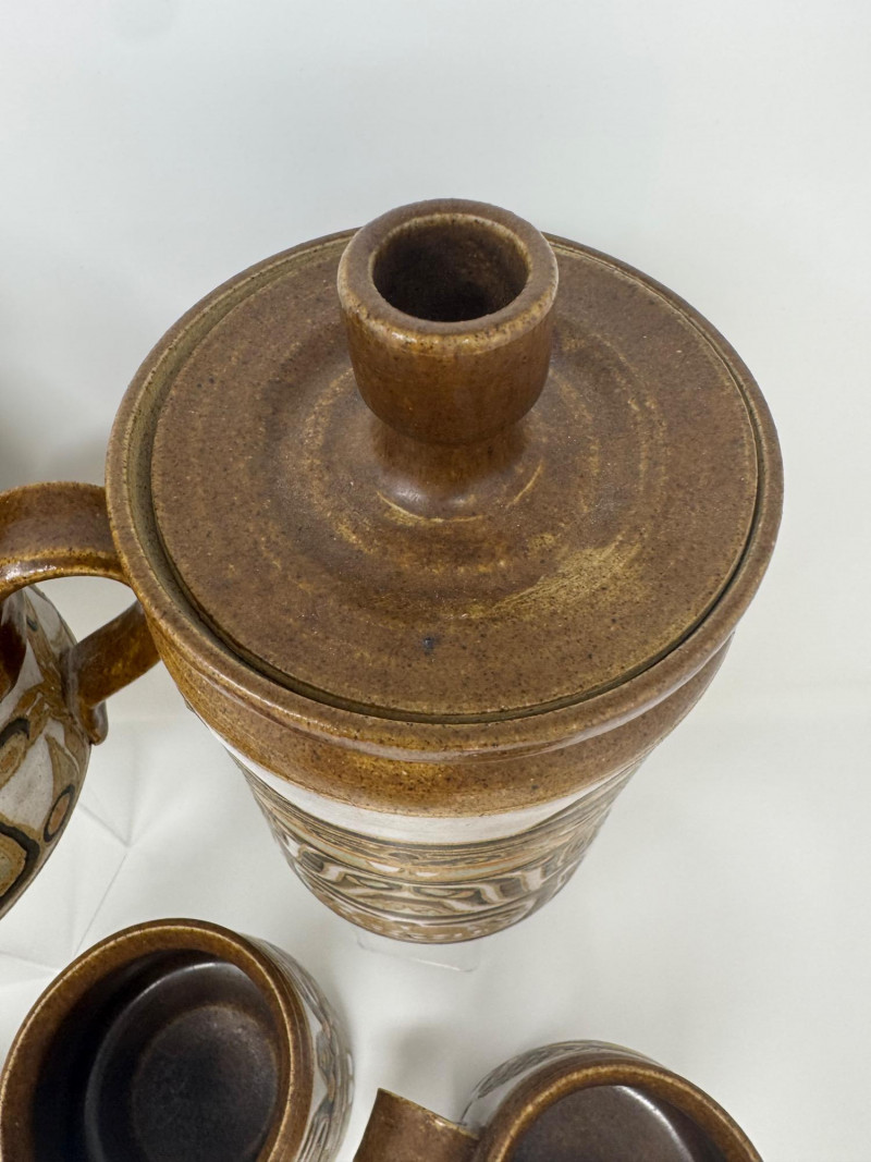 Arlene Mickelson Studio Pottery Teapot, Canister & 6 Mugs Set. Note: Teapot is 7.5” tall and has a chip on the spout. Lidded Canister 8.5” Tall