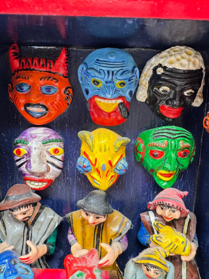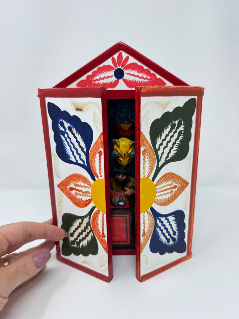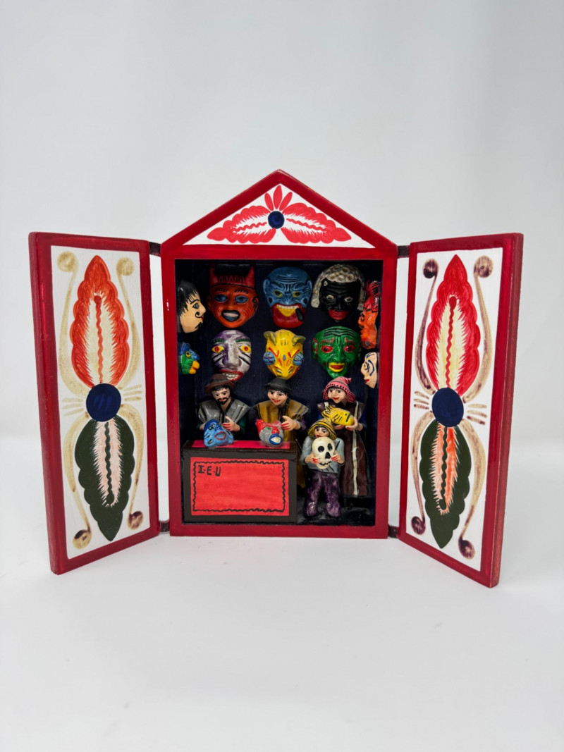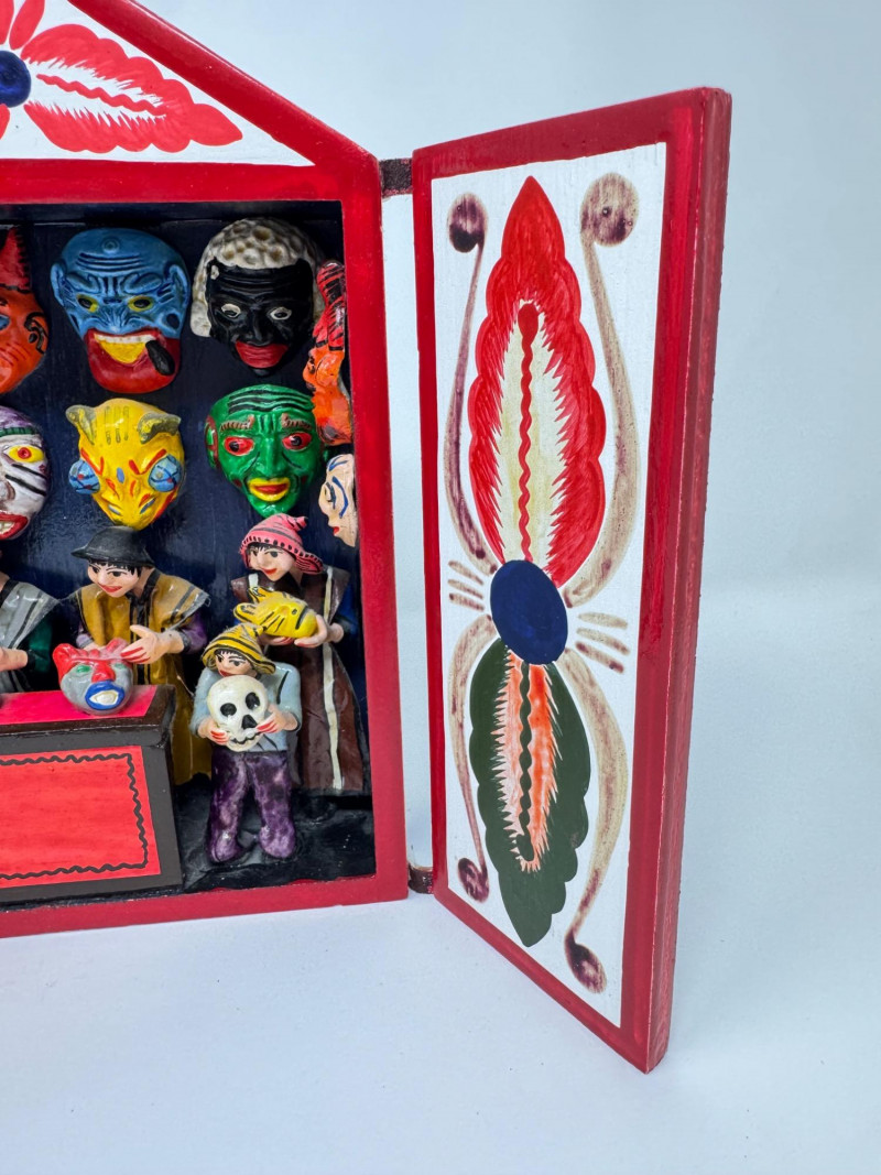 Handcrafted Peruvian Retablo Folk Art w/ Festival Masks & Figures. 9.5” Tall 6” Wide