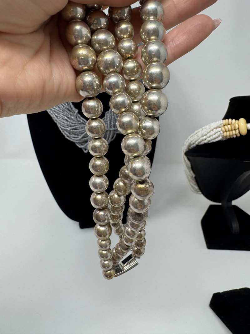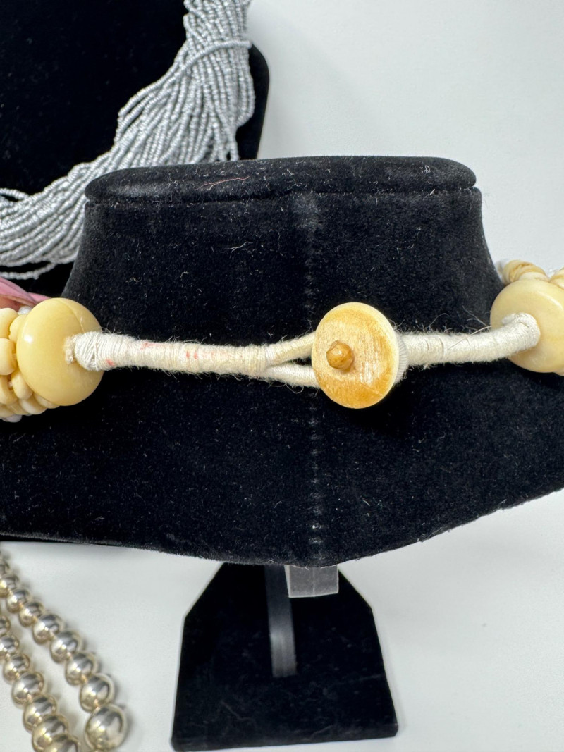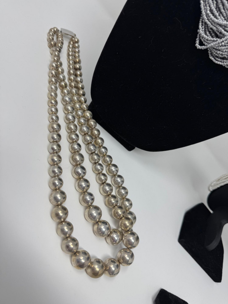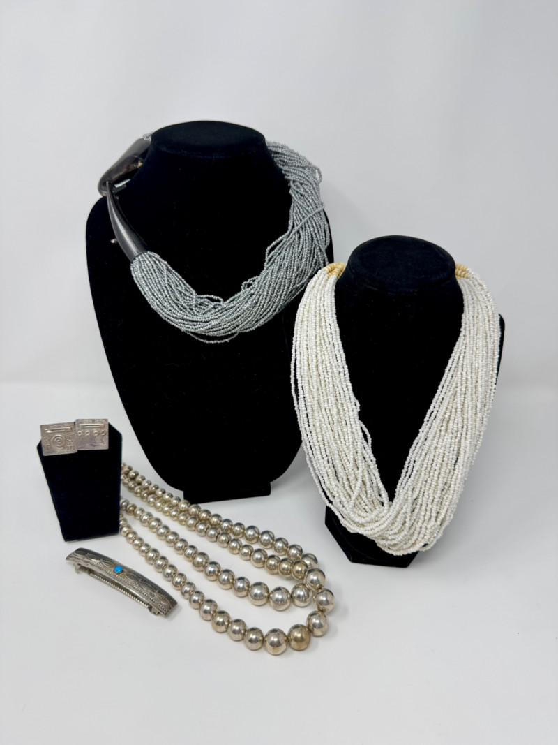 Sterling Pieces & Beaded Necklaces w/ Bone, Turquoise & More. Disclaimer: We do not test all metals. We have only tested if specifically states so. By placing a bid, you acknowledge and agree that you are purchasing the item "as is" and without any guarantee of metal quality. We do not offer refunds based on metal content or purity.