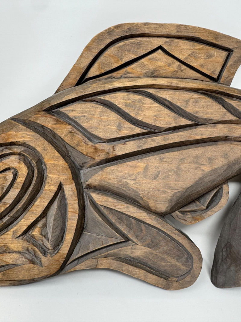 Tlingit Tribe Diving Salmon Hand-Carved Wood Art by Alex Jackson. 18” Wide 9.5” Tall Diving Salmon Hand Carving by Alex Jackson (1935-2016), a member of the Tlingit tribe. Alex was the face of contemporary native art in Seattle's Pike Place Market for more than four decades.