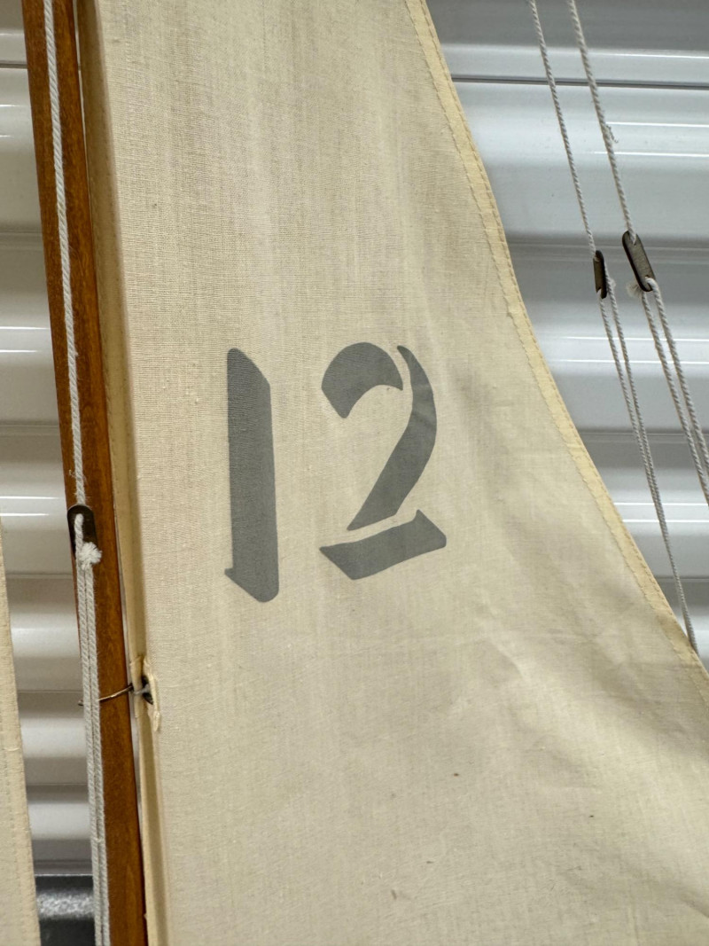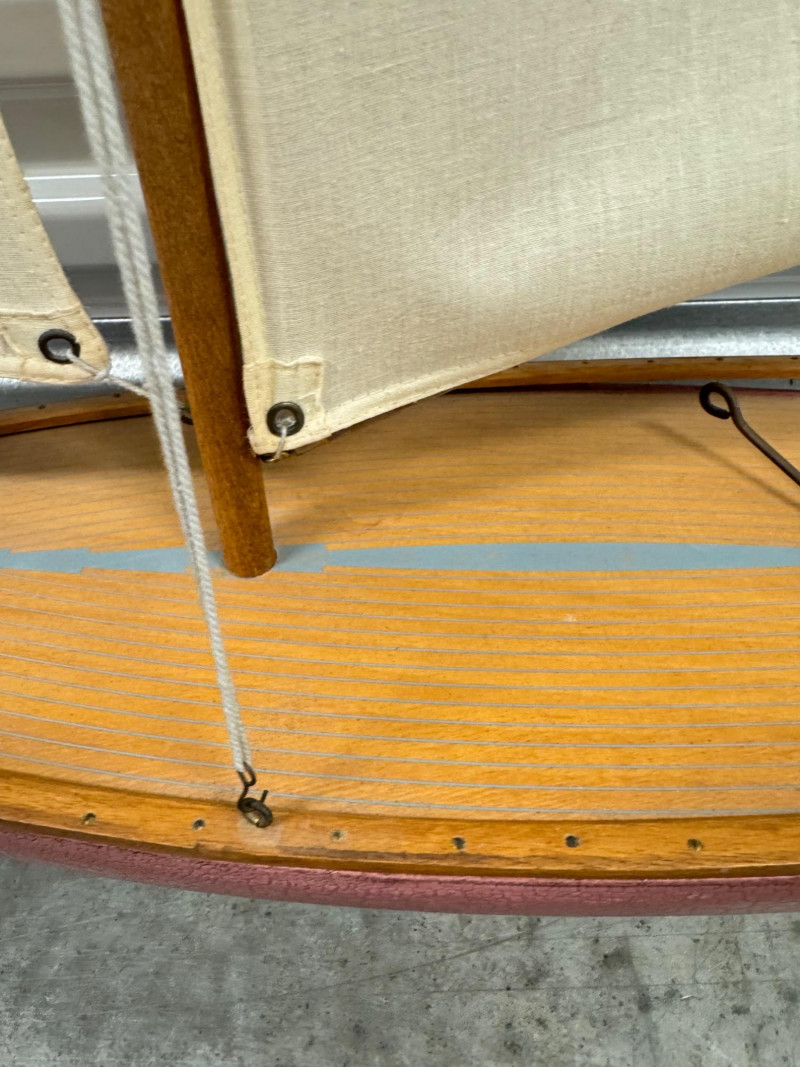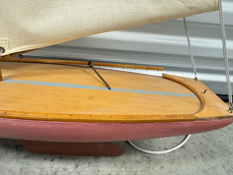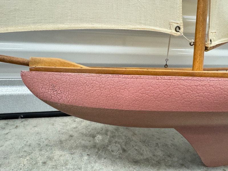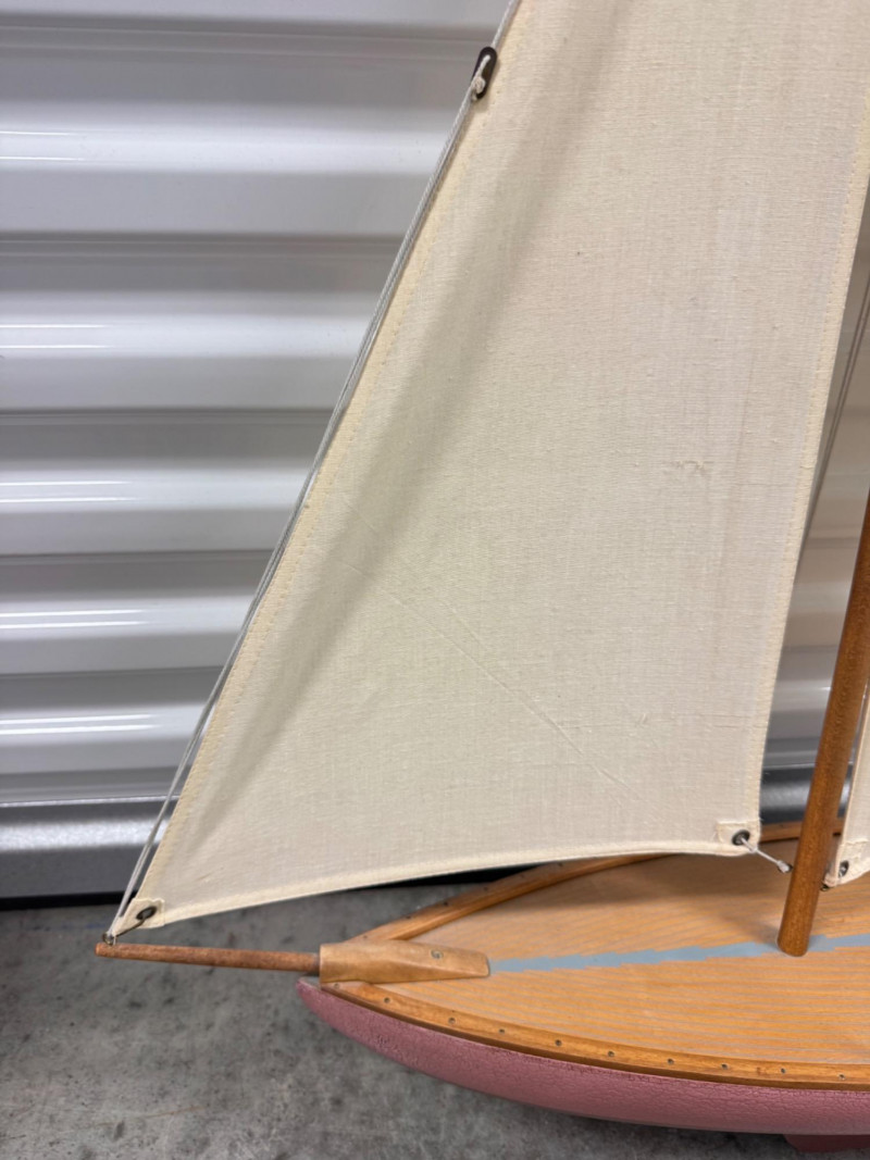 Classic Model Pond Yacht Sailboat w/ Cloth Sail. 28” Wide 38” Tall Note: The item may need light repair as shown in the images.
