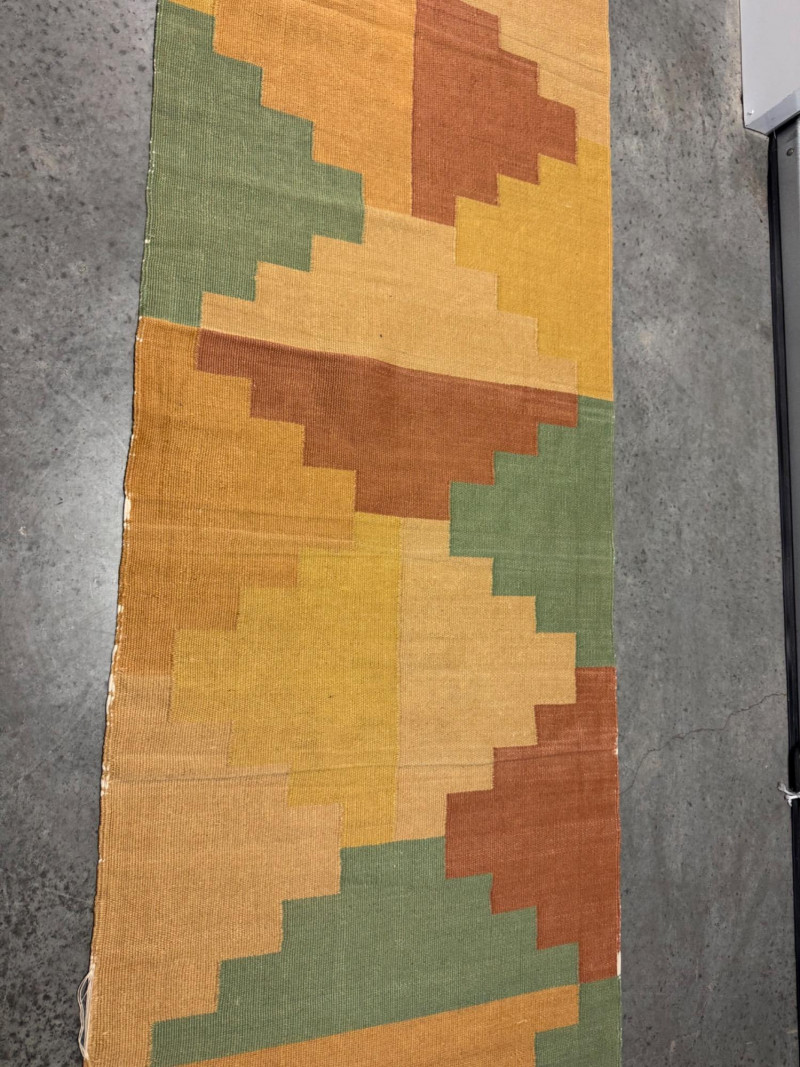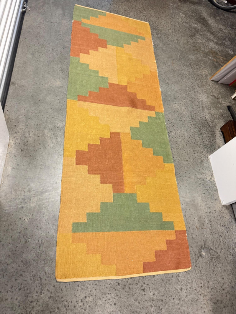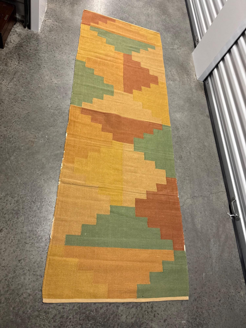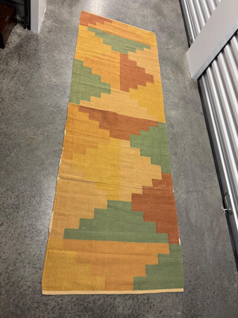 Flatweave Southwestern-Style Runner Rug – Earth Tones. 32 x 96” Condition: Some minor stains on one side and edge wear along the backside; see photos.
