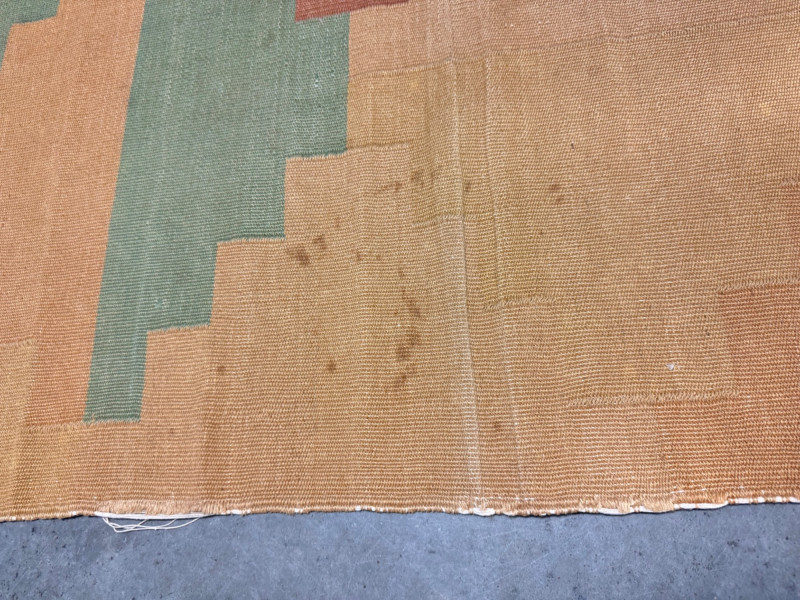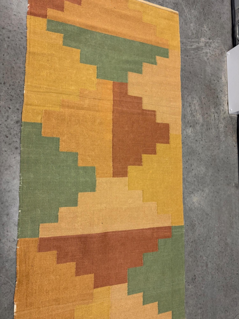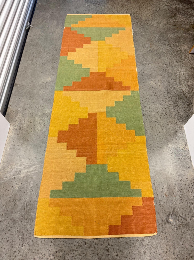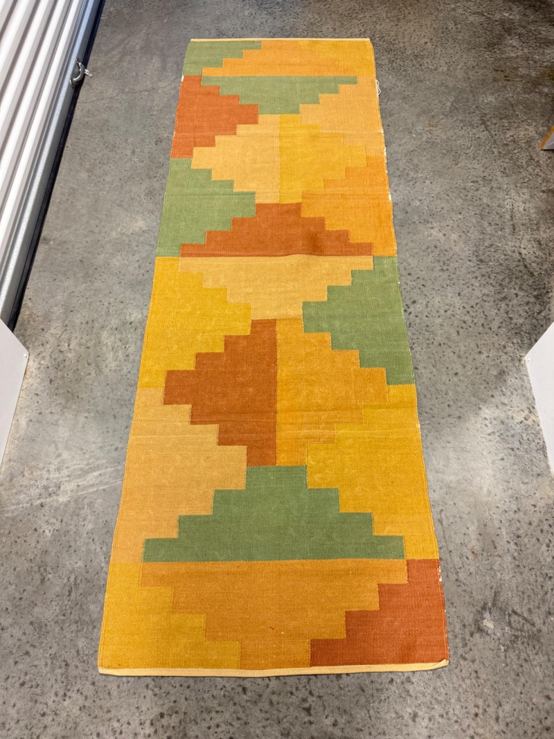 Flatweave Southwestern-Style Runner Rug – Earth Tones. 32 x 96” Condition: Some minor stains on one side and edge wear along the backside; see photos.