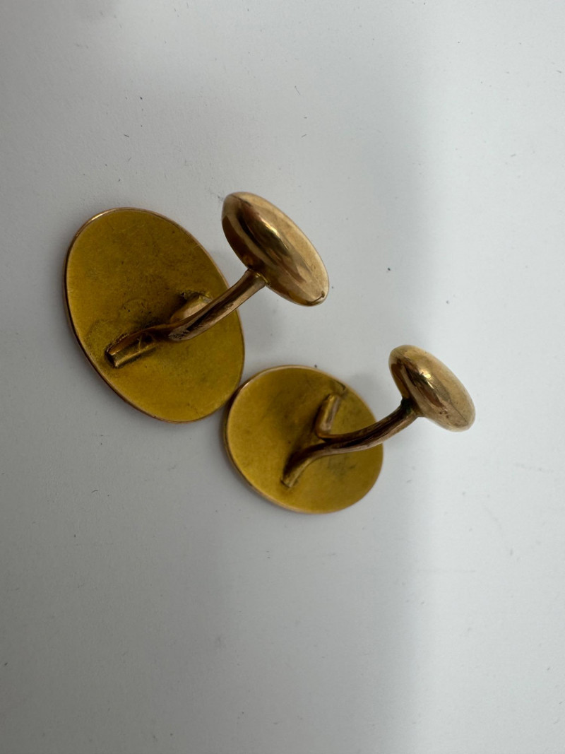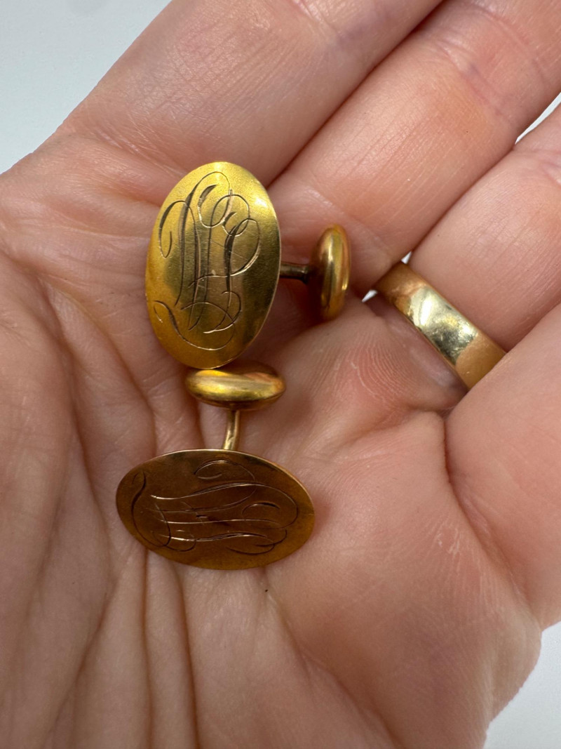 The pair of engraved gold-toned cufflink pins appear to be gold based on look and feel, and they passed the magnet test. However, they are unmarked and have not been formally tested for gold content. By placing a bid, you acknowledge and agree that you are purchasing these items "as is" and without any guarantee of metal quality. We do not offer refunds based on metal content or purity.