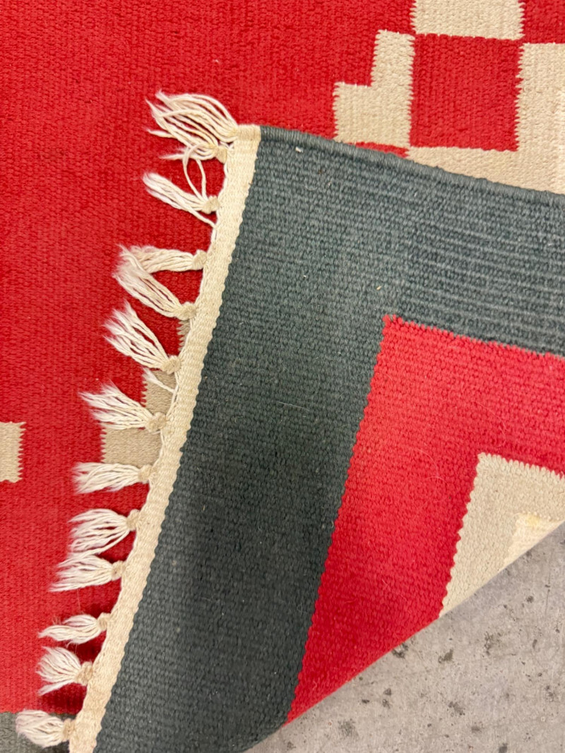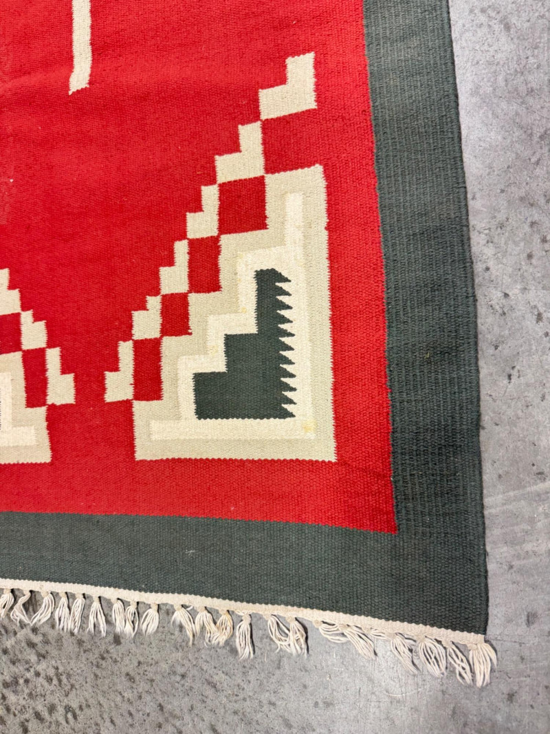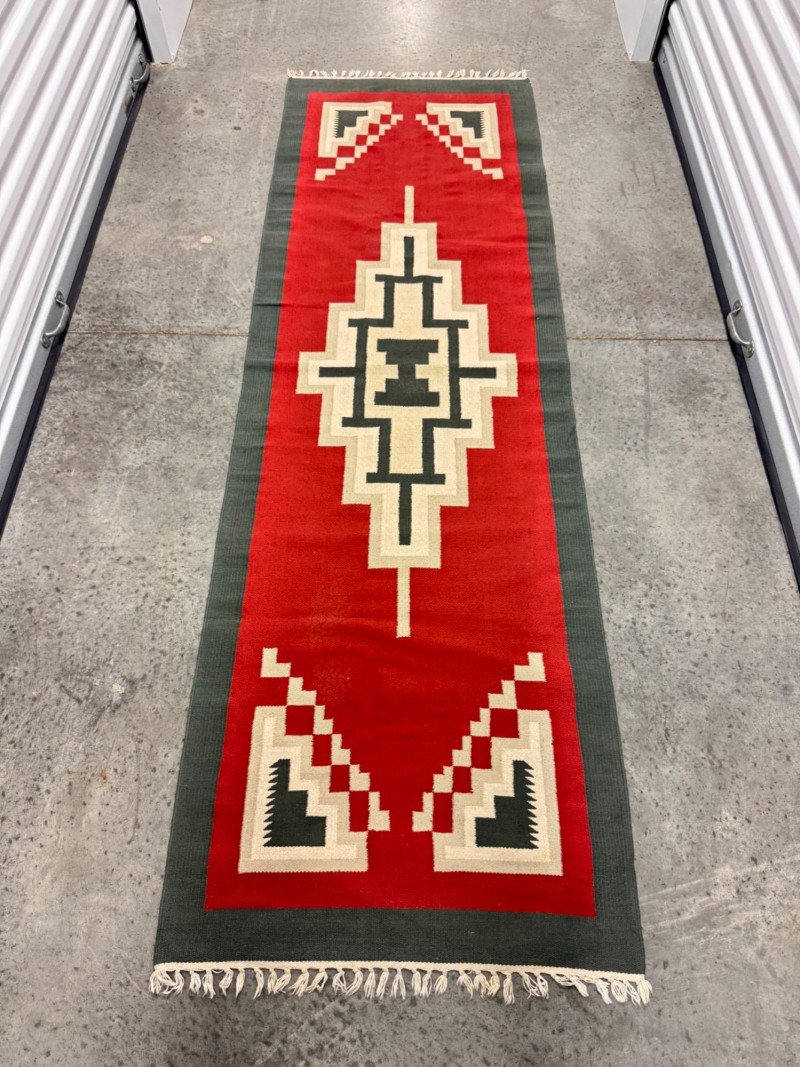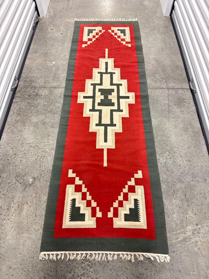 Southwestern Style Geometric Flat Weave Runner Rug - Red & Grey. 30 x 98” Needs Cleaning, Stains Noted.
