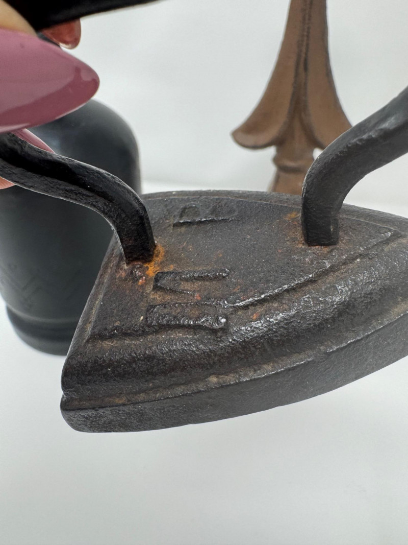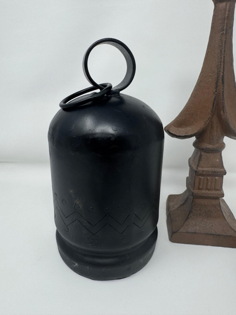 Cast Iron Decor Lot – Bell, Mini Sad Iron & 10” Architectural Finial.