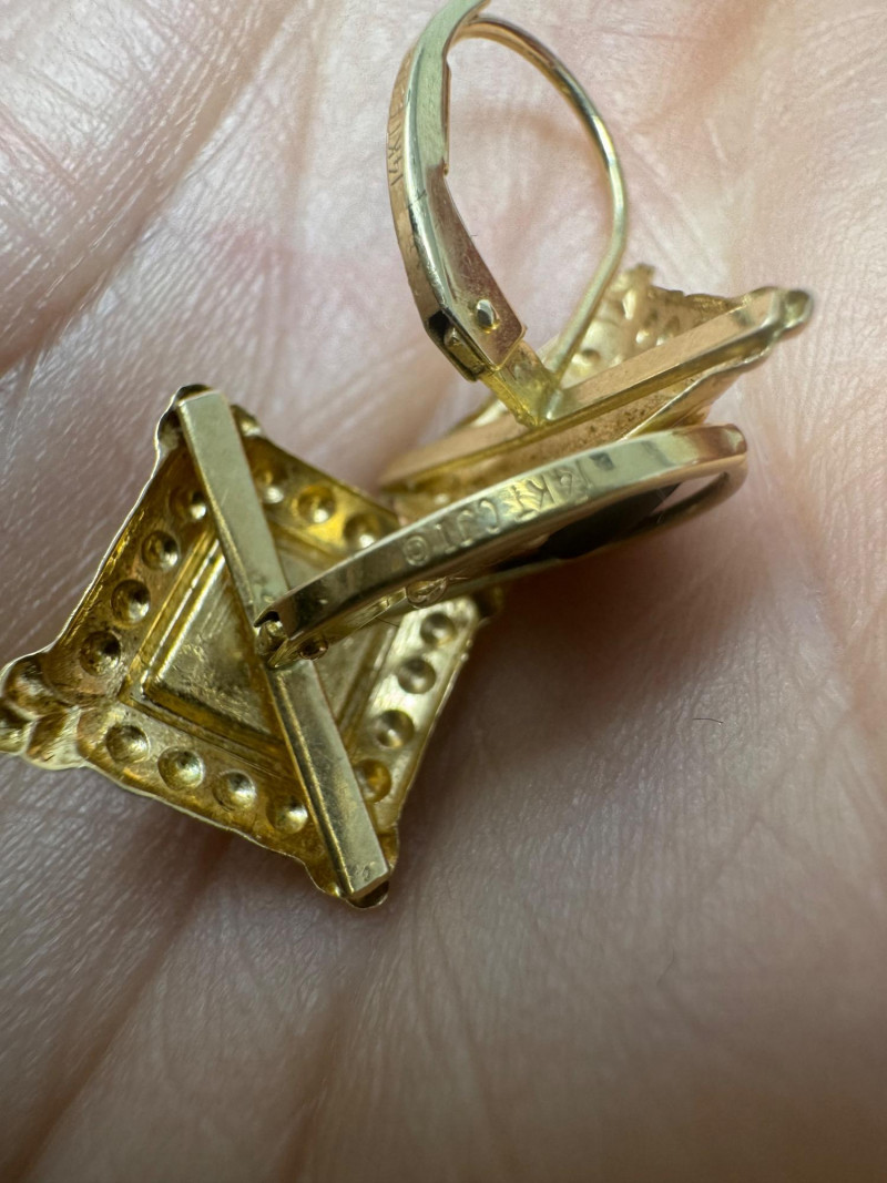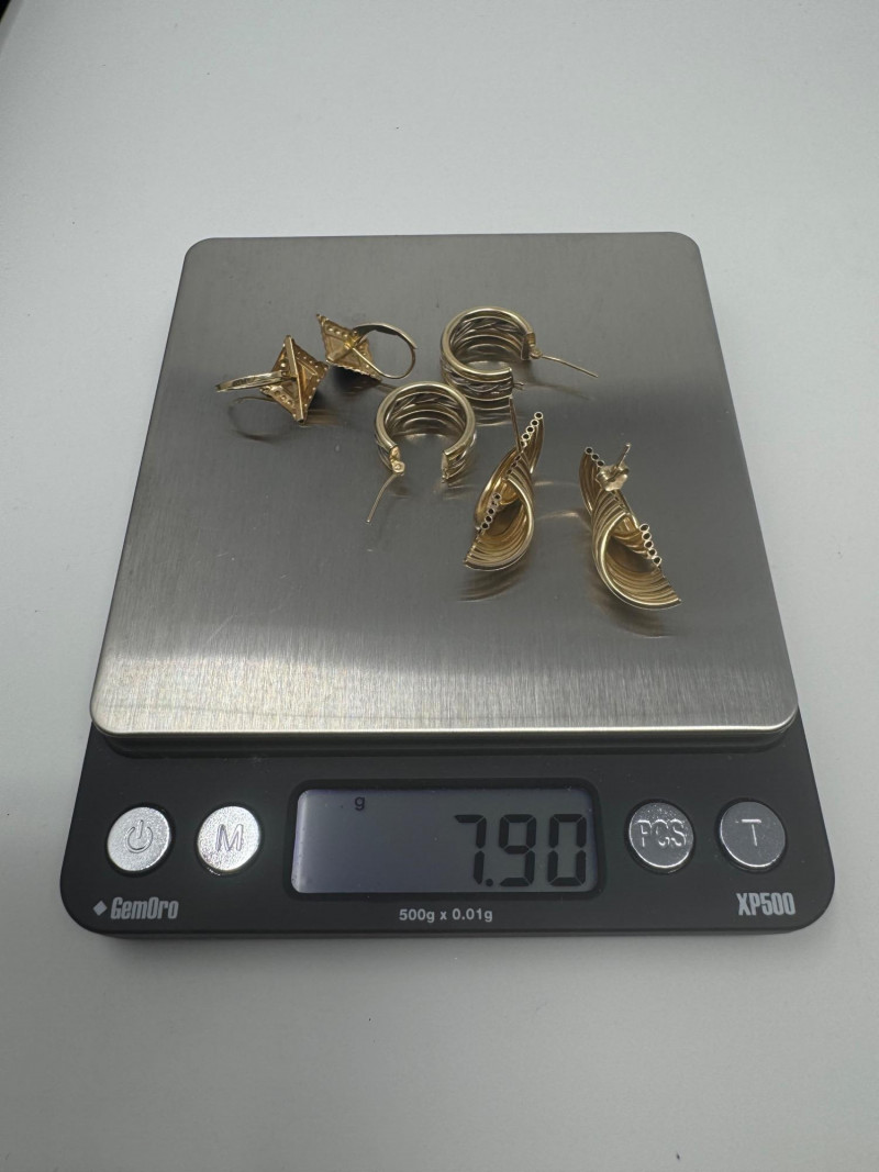 3 Pairs 14K Gold Earrings – Mixed Styles, 7.90g Total Weight. Disclaimer: The jewelry included in this auction lot has not been tested by jewelers. By placing a bid, you acknowledge and agree to purchase the item "as is" without any guarantees regarding metal quality, content, or purity. Refunds will not be issued based on these factors.