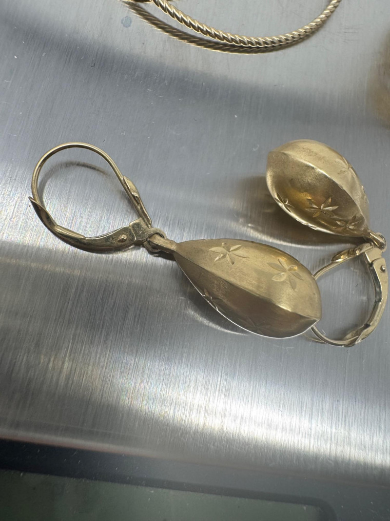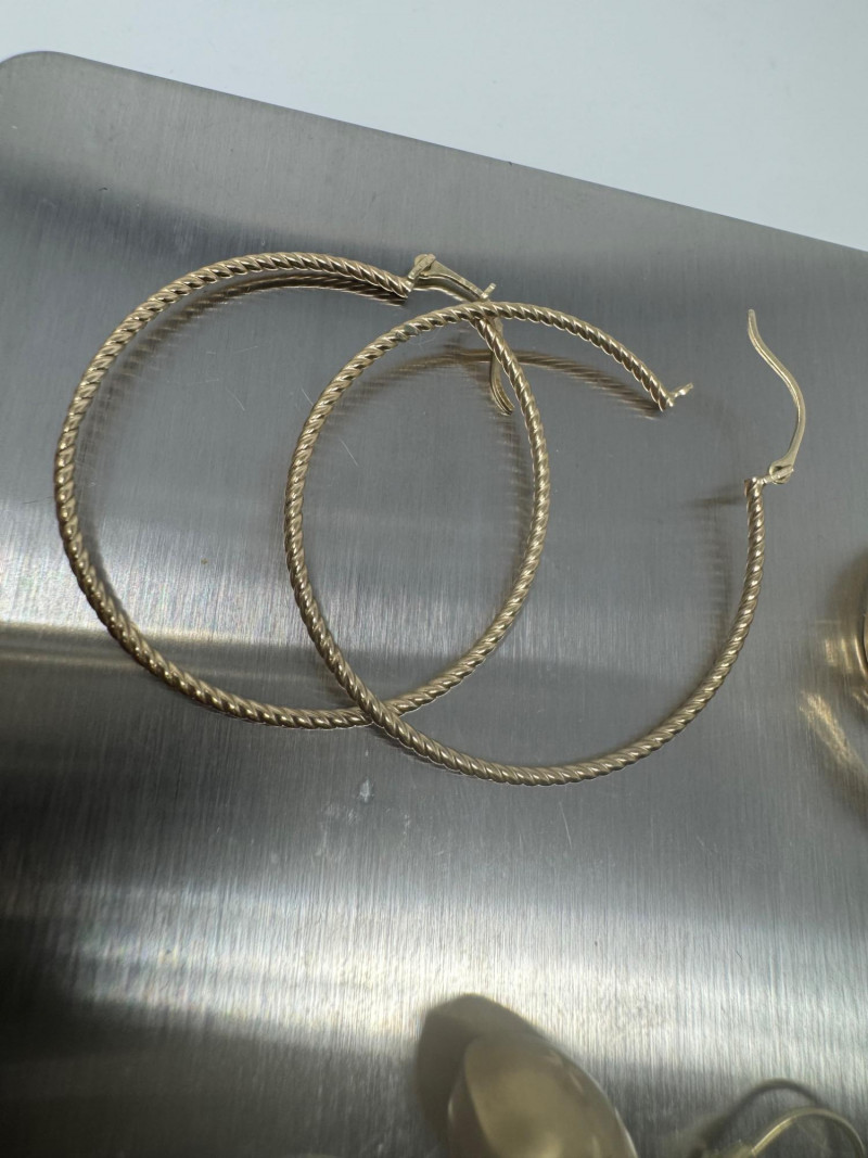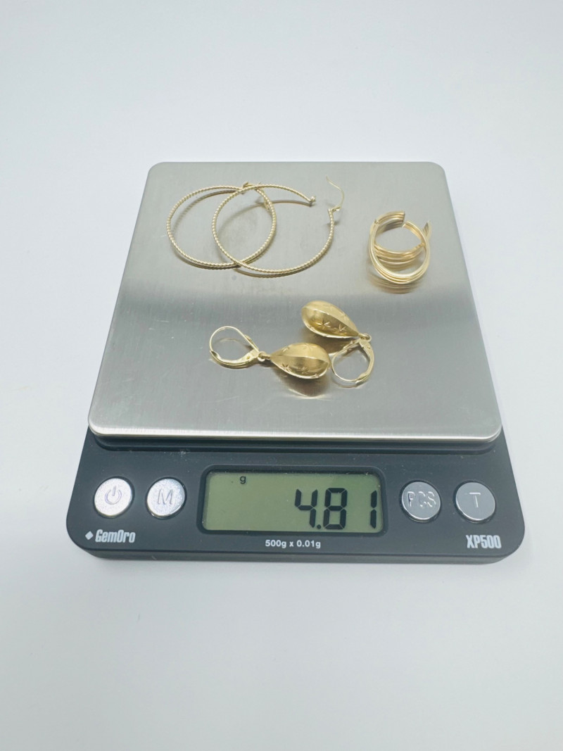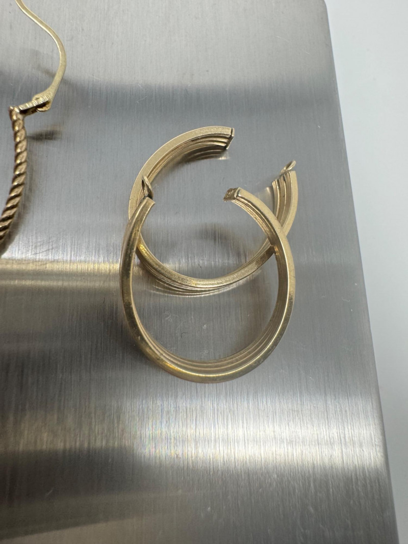 3 Pairs 14K Gold Earrings Teardrop & Hoops Design, 4.81g Total Weight. Disclaimer: Both hoop earrings are missing the in-ear wires/posts. Items included in this auction lot has not been tested by jewelers. By placing a bid, you acknowledge and agree to purchase the item "as is" without any guarantees regarding metal quality, content, or purity. Refunds will not be issued based on these factors.