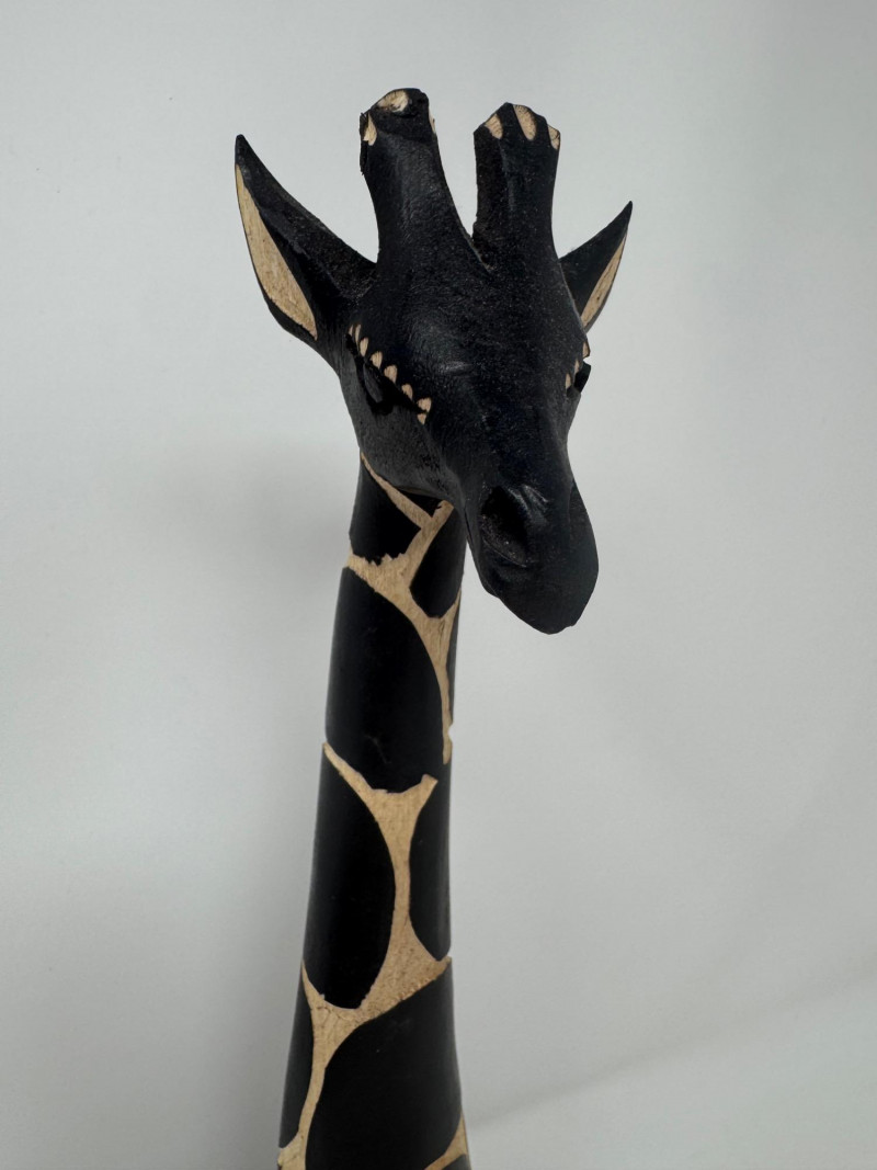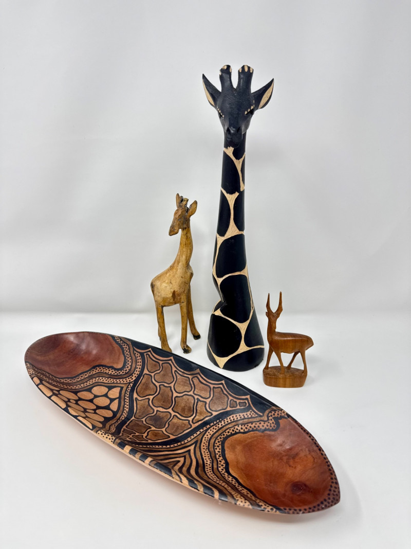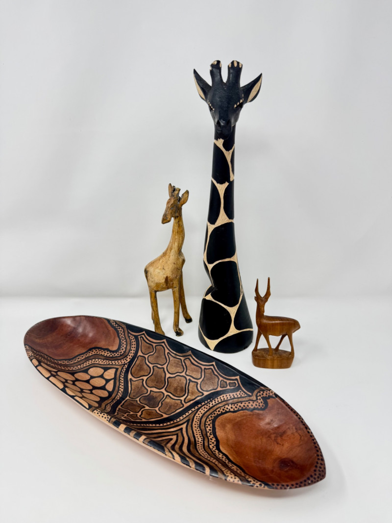 African Carved Giraffe Figures & Handpainted Wood Bowl Giraffes 13” Tallest Bowl 14”