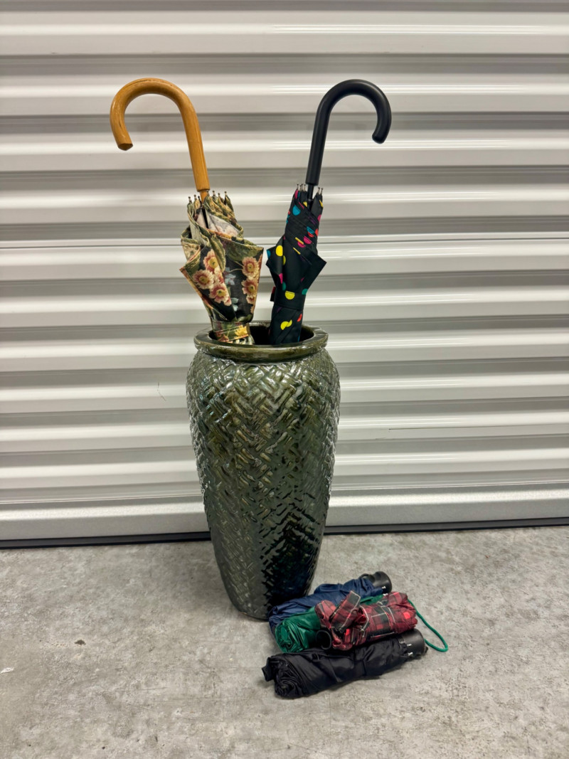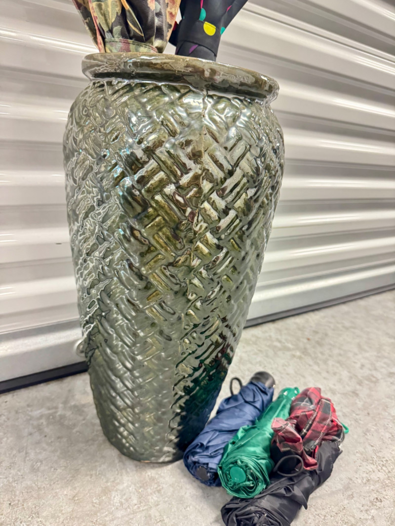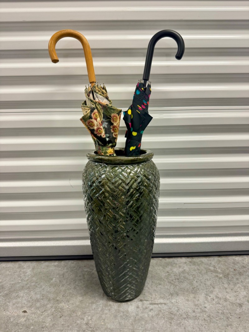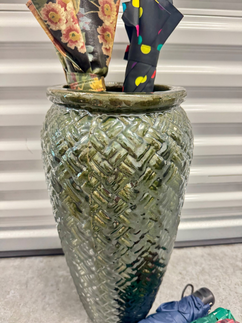 Heavy Textured Green Pottery Vase w/ 6 Extra Umbrellas. 19” Tall 9” Wide