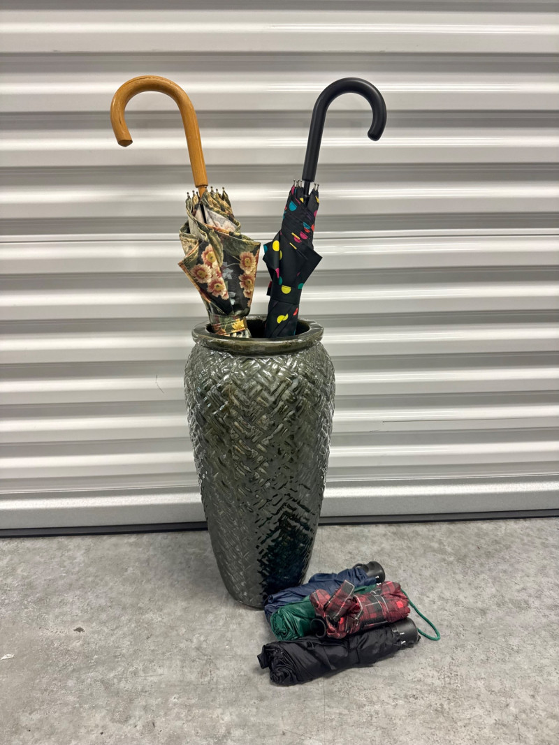 Lot # 25 - Heavy Textured Green Pottery Vase w/ 6 Extra Umbrellas