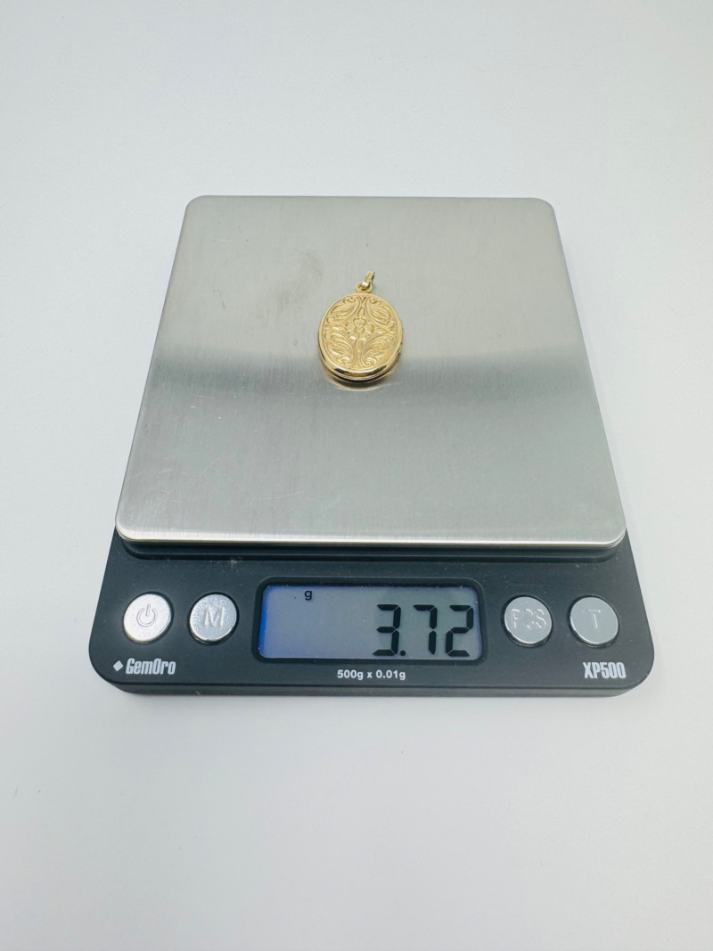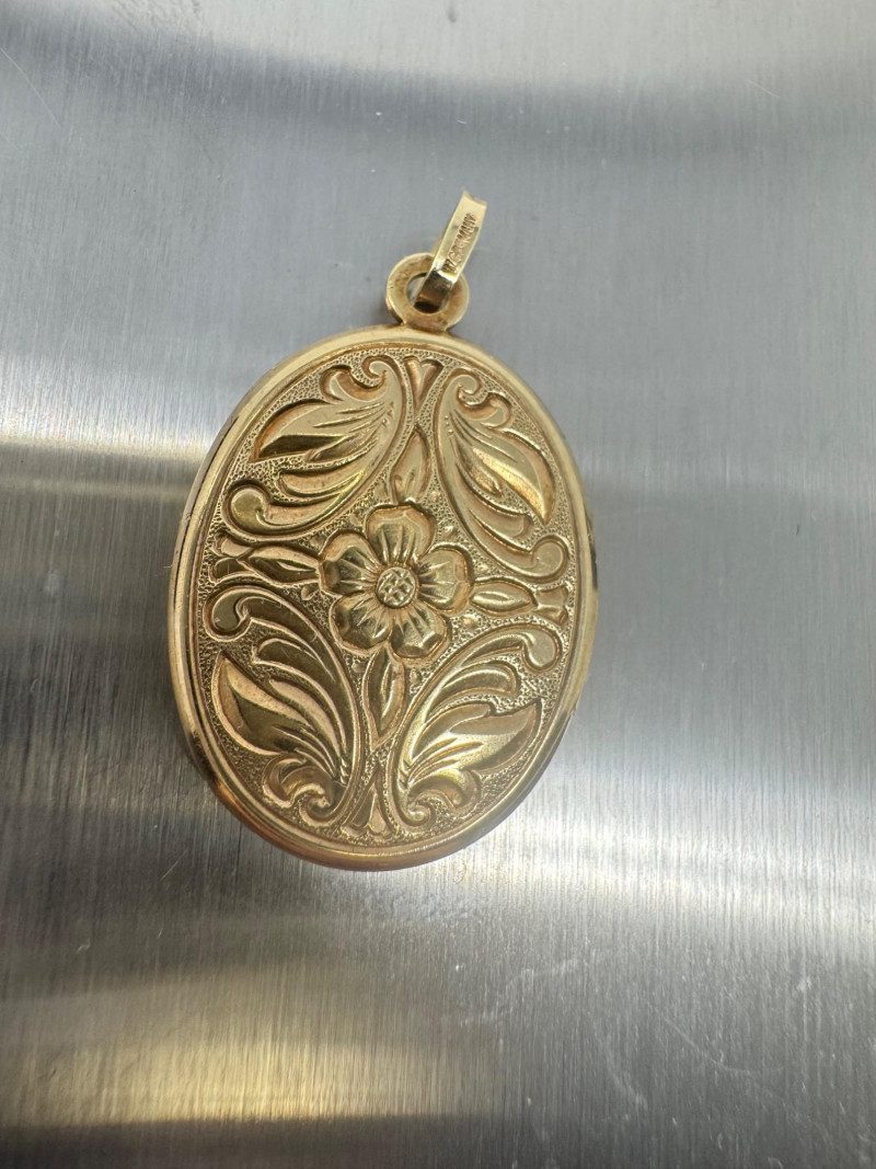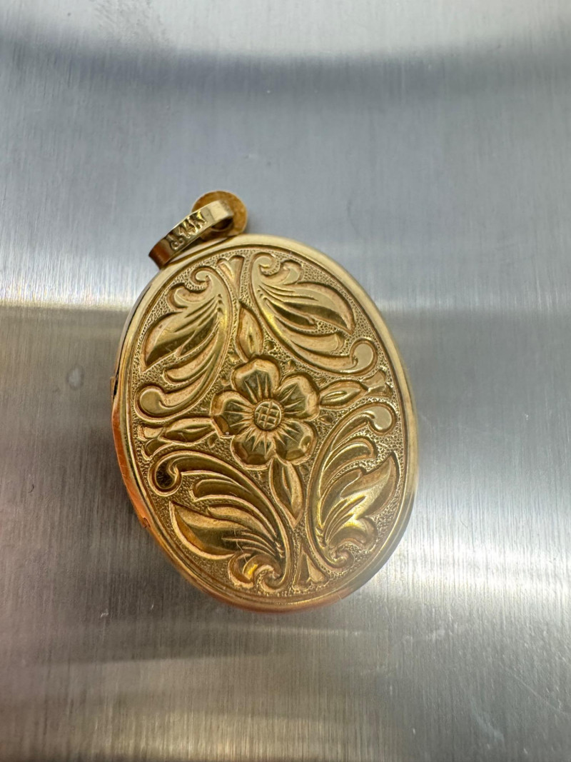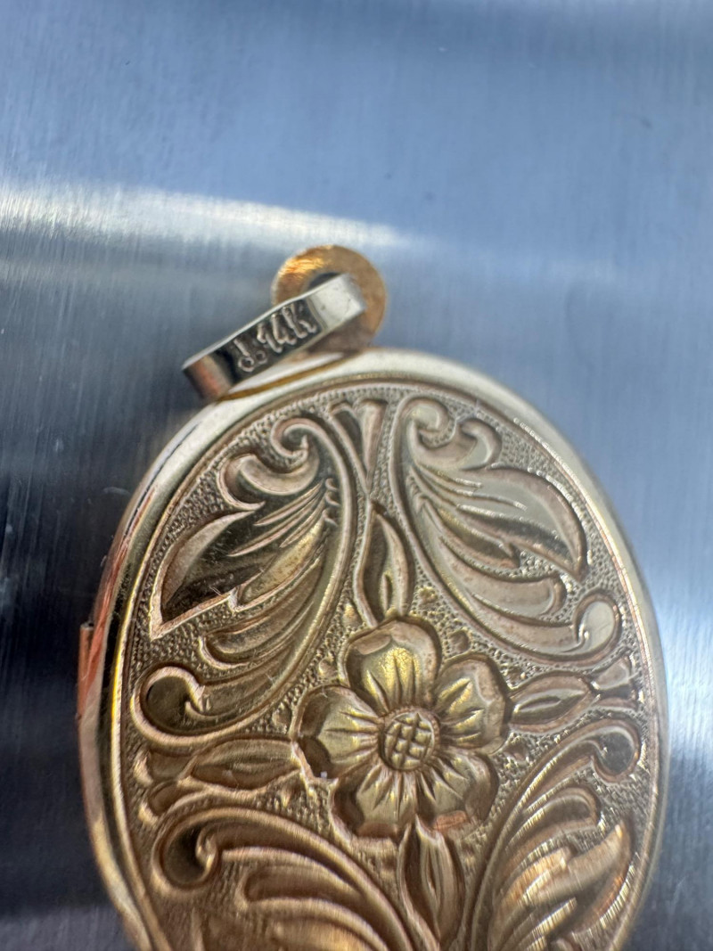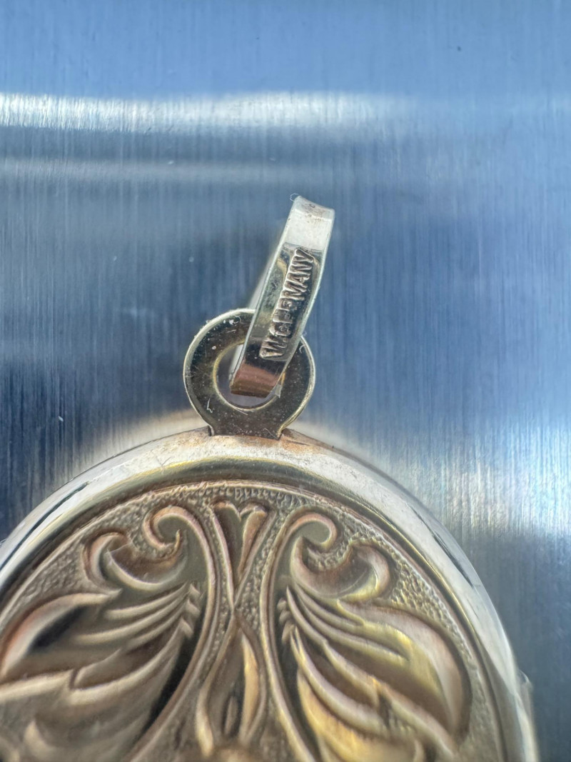 14K Gold Engraved Oval Locket Pendant – West Germany, 3.72g. Disclaimer: The jewelry included in this auction lot has not been tested by jewelers. By placing a bid, you acknowledge and agree to purchase the item "as is" without any guarantees regarding metal quality, content, or purity. Refunds will not be issued based on these factors.