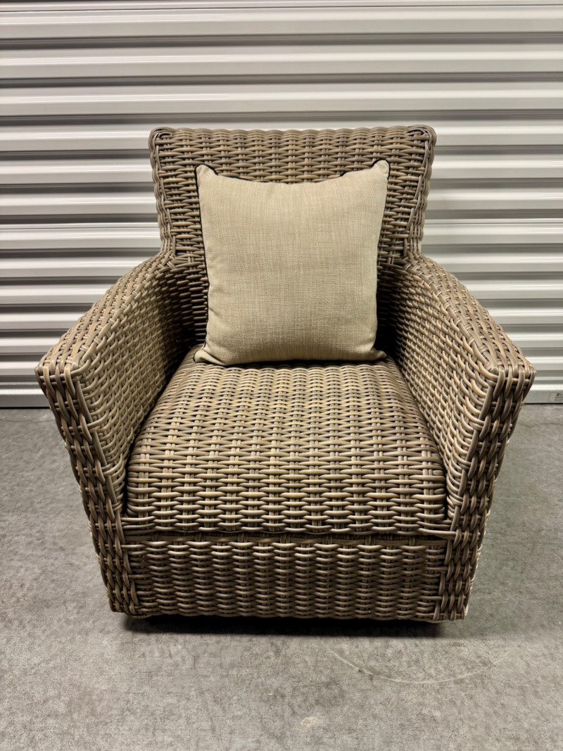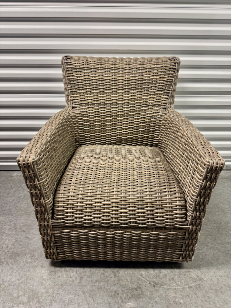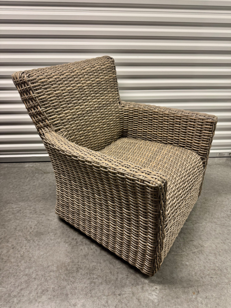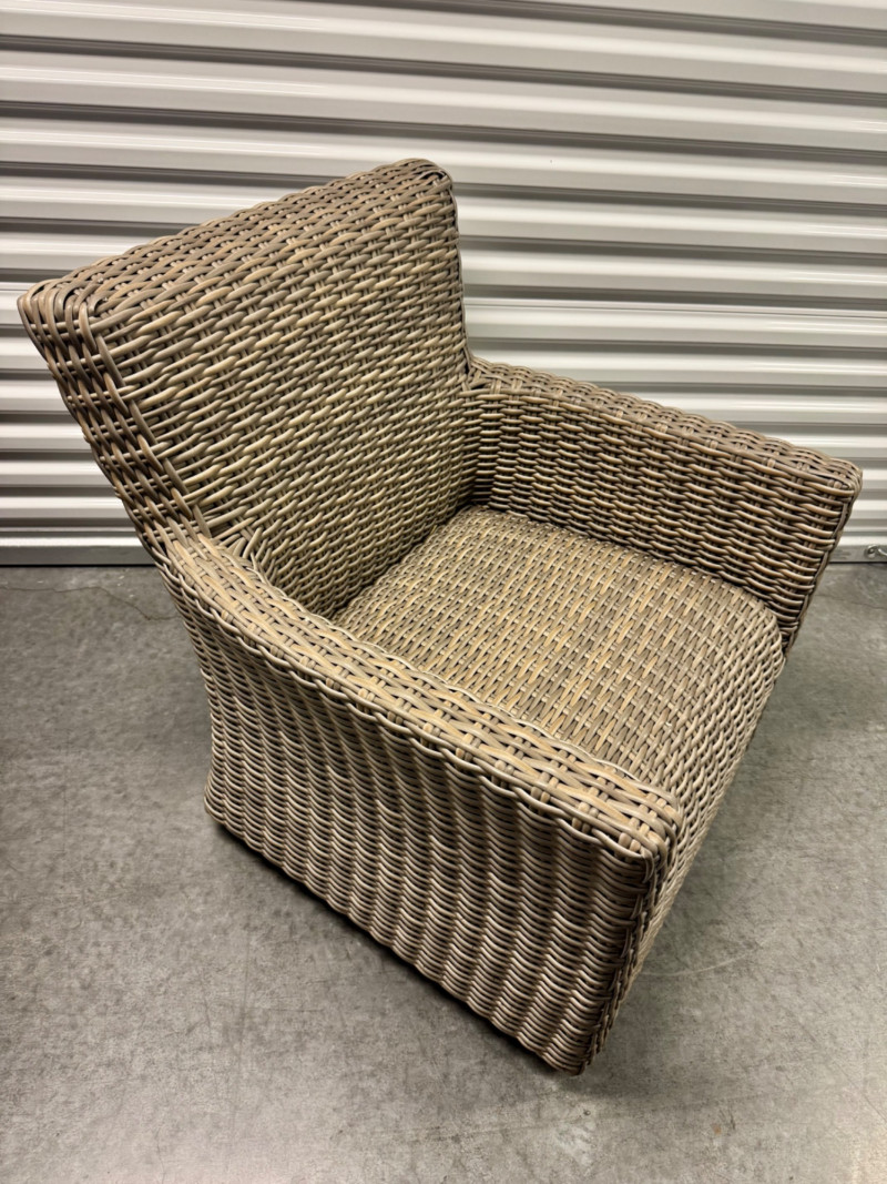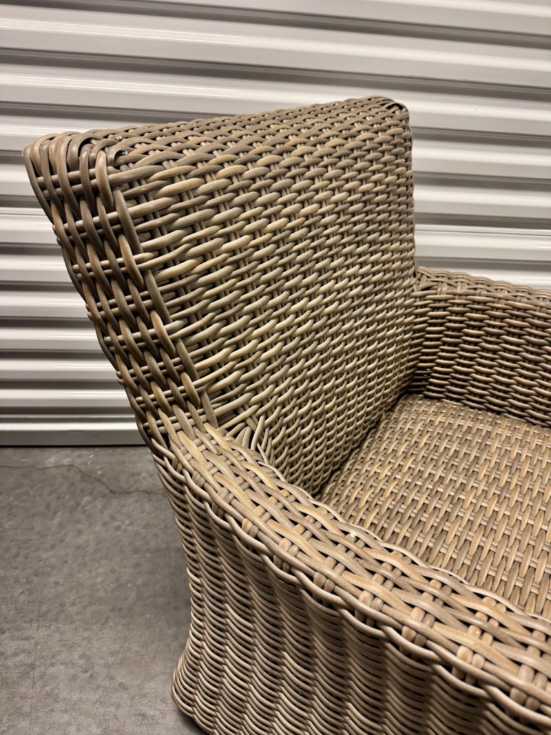 Wicker-Style Outdoor Armchair w/ Cushion – Curved Back Design. Bidding on this lot is an agreement that: (1.) You will have at least 2 capable, able bodied persons to lift and load at a minimum. (2.) You will bring a hand truck and/or any other tools needed to remove this item. If these steps are not followed your item will be forfeit and no refund given.