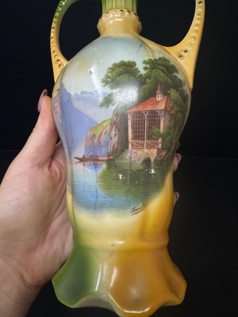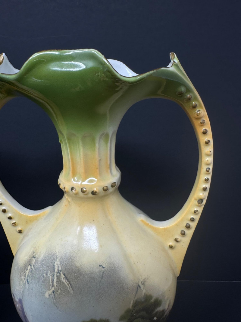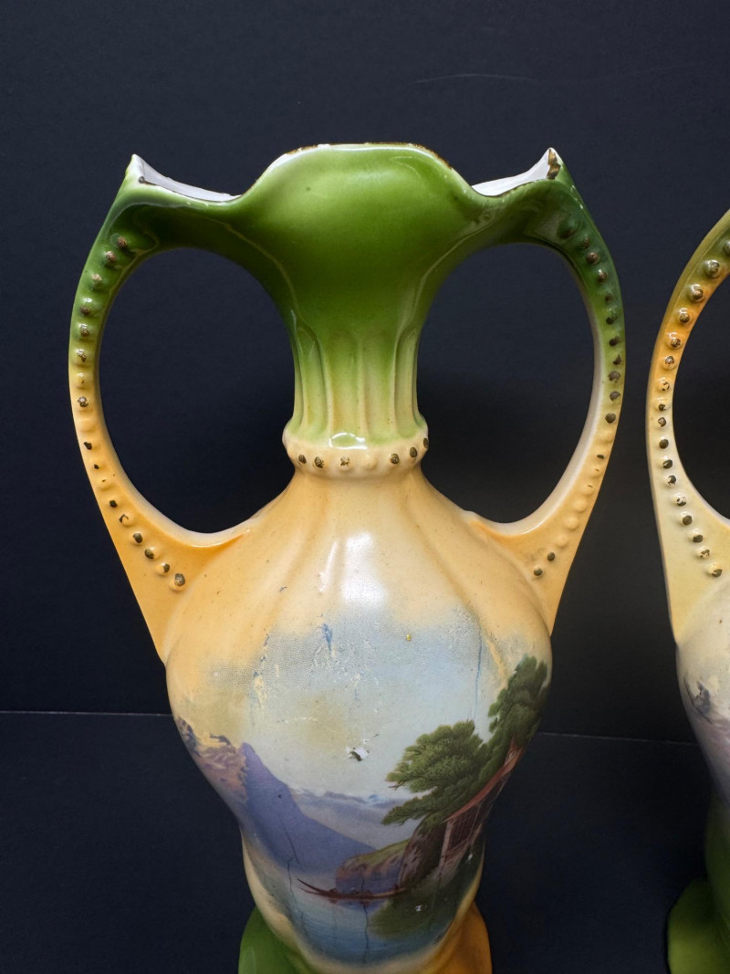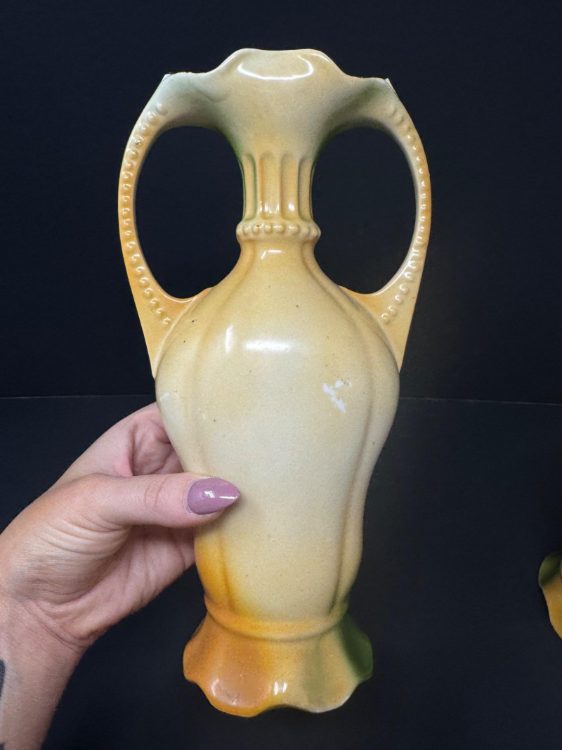 Vintage Danilo Green Double-Handled Vases – Hand Painted, Germany. 10" Tall