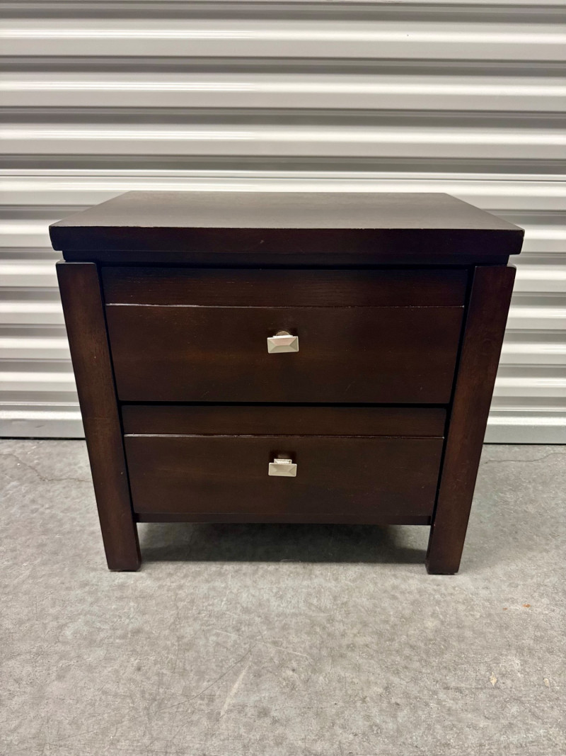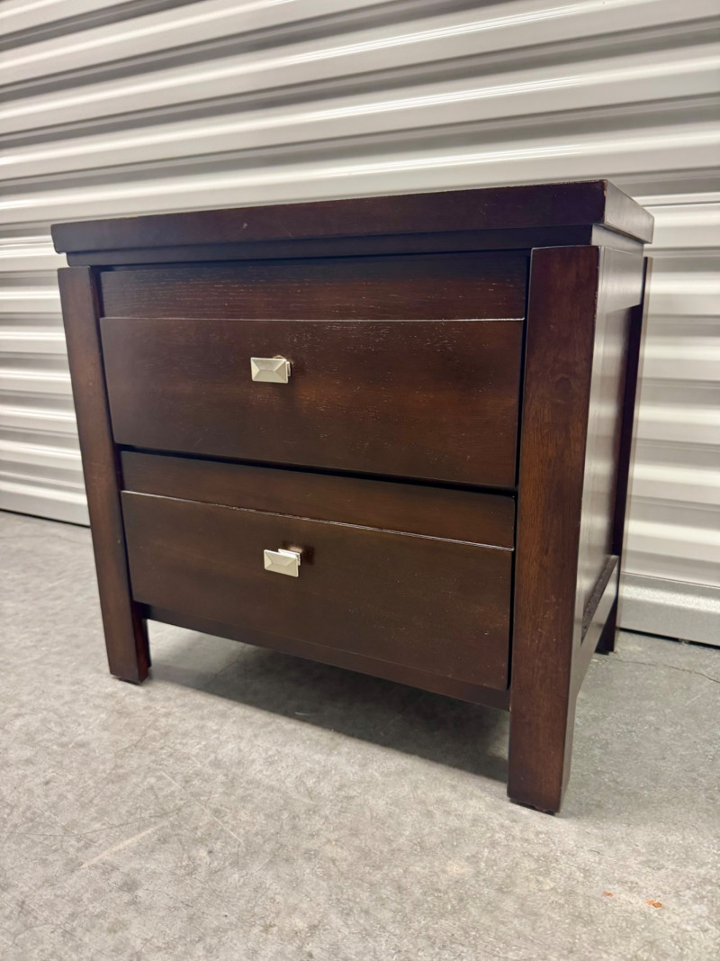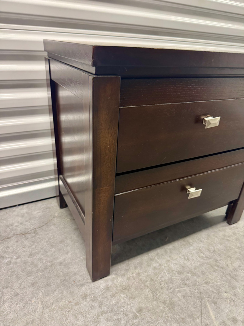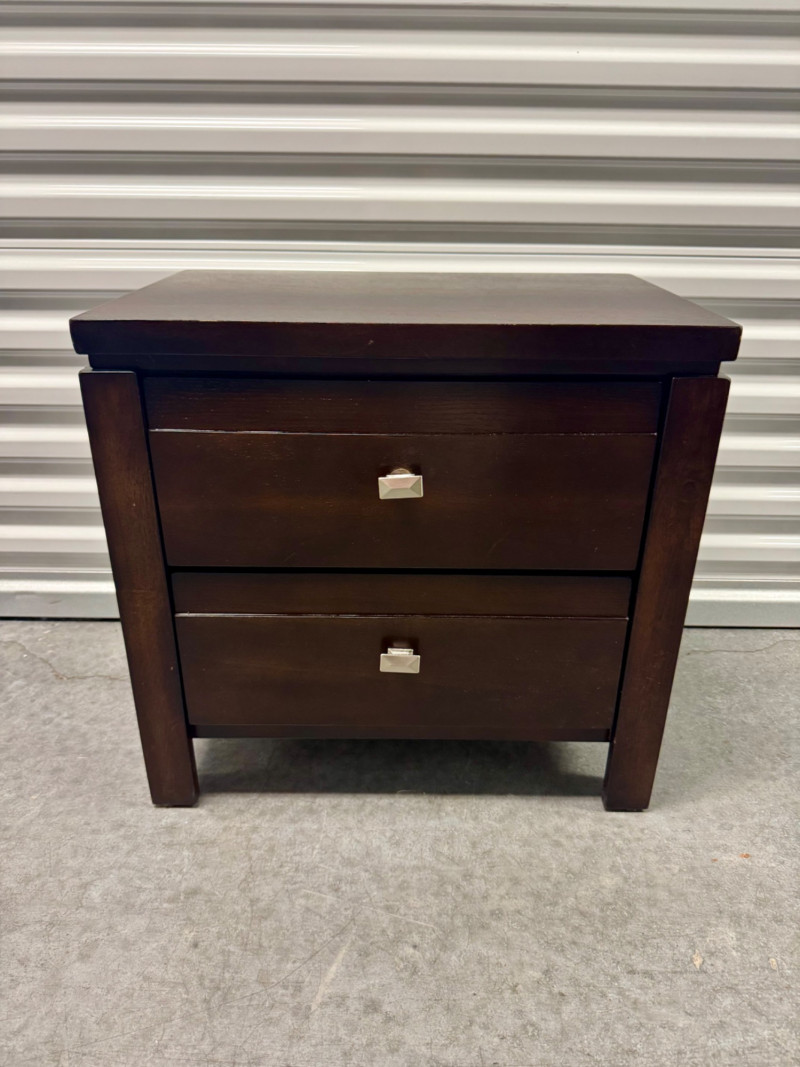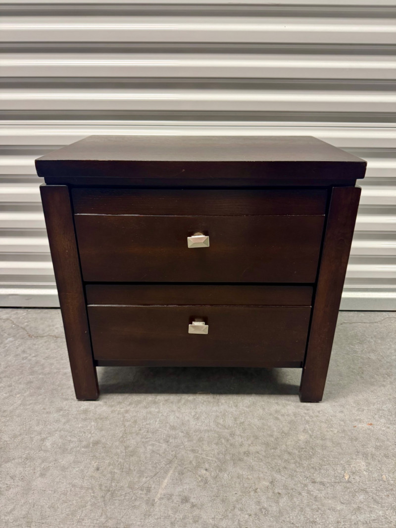 Cameron-Style 2-Drawer Side Table – Dark Wood & Metal Pulls.