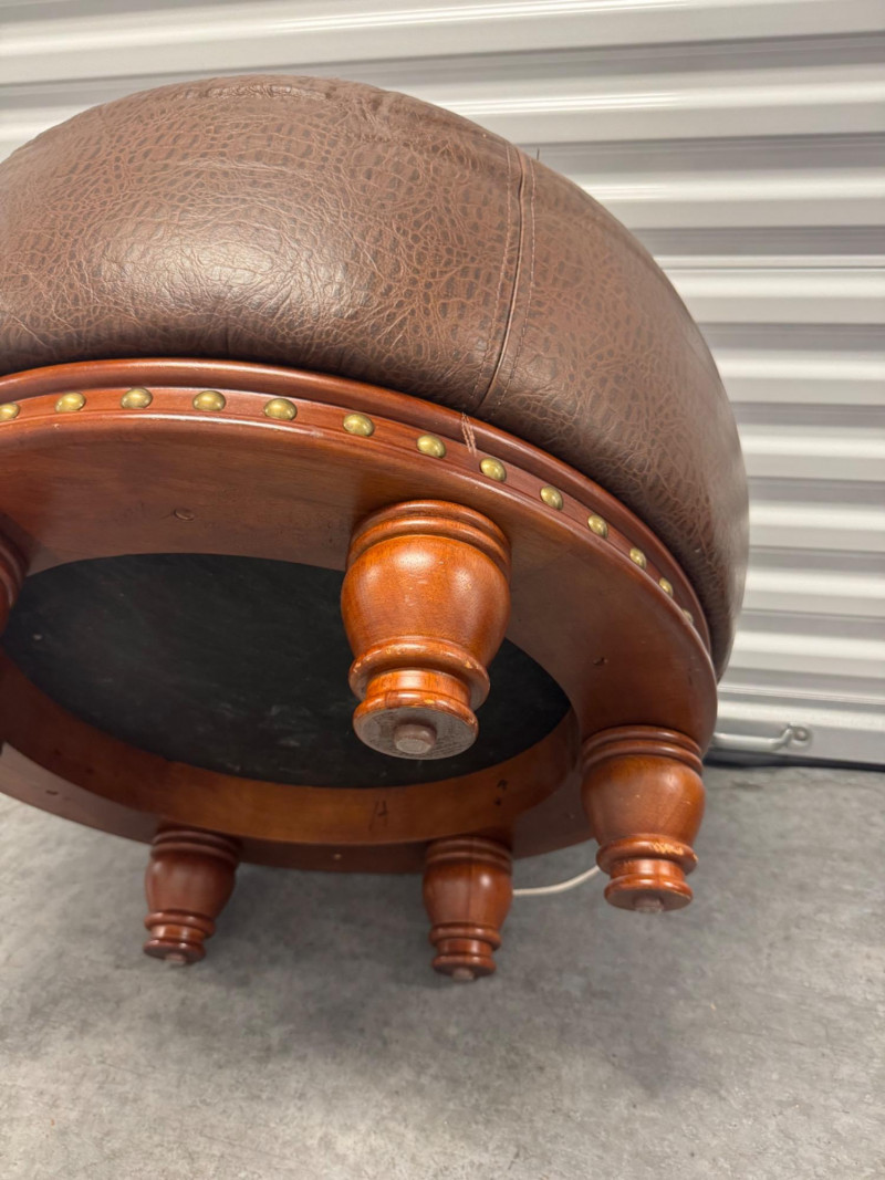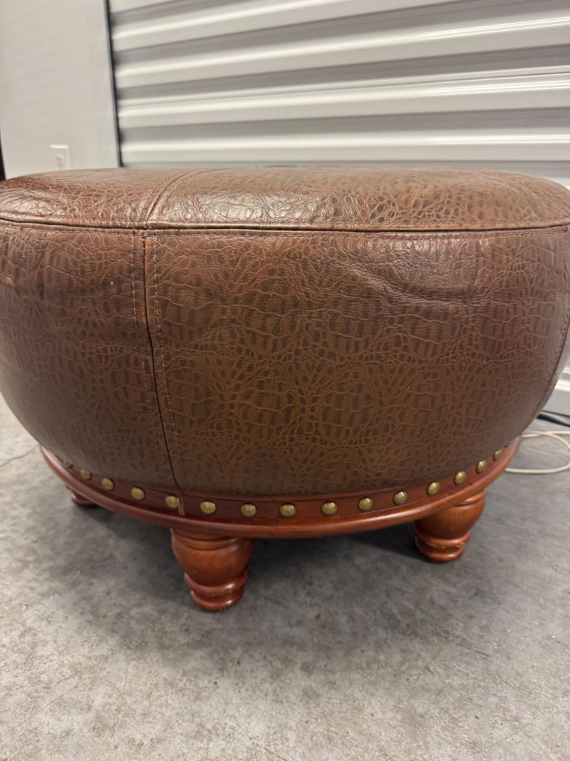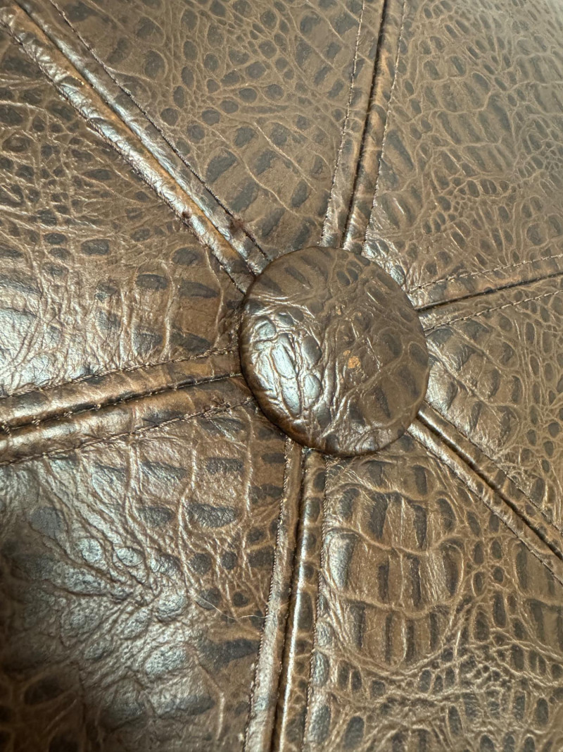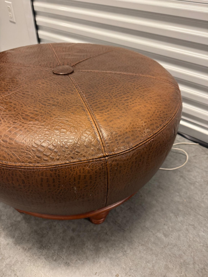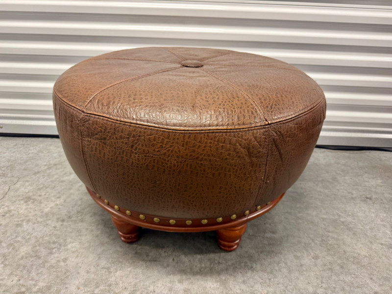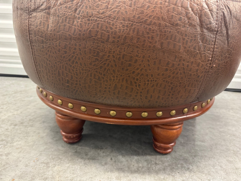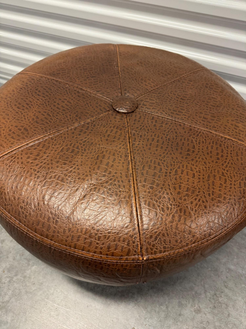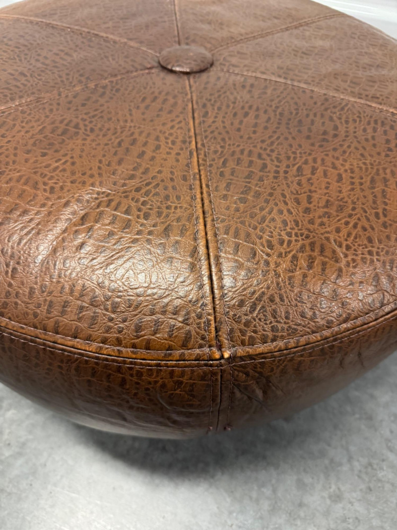 Round Faux Leather Croc-Texture Ottoman w/ Button Center. Upholstered in a brown croc-style textured material (believed to be faux leather). 29”D x 17”H Note: Some fading/discoloration to surface.