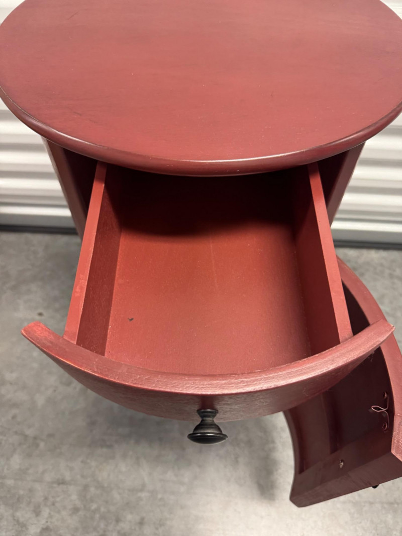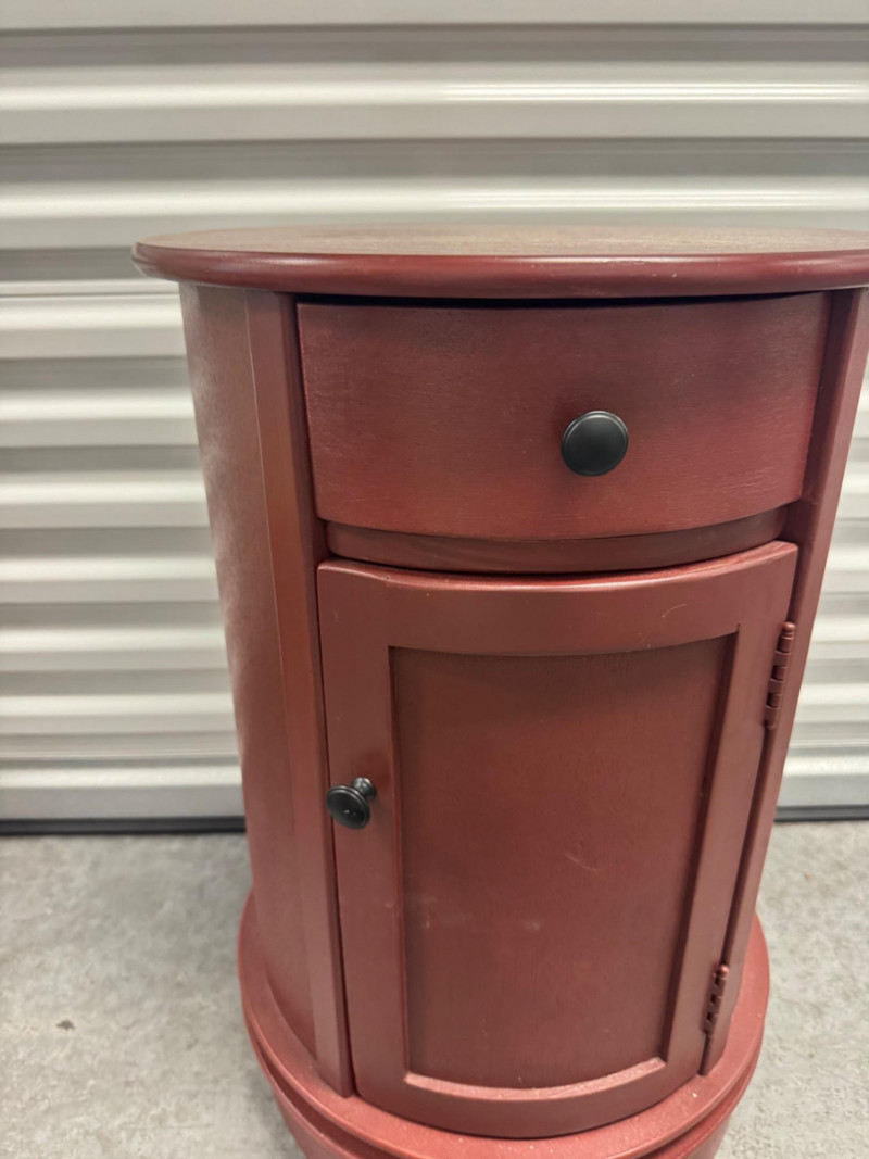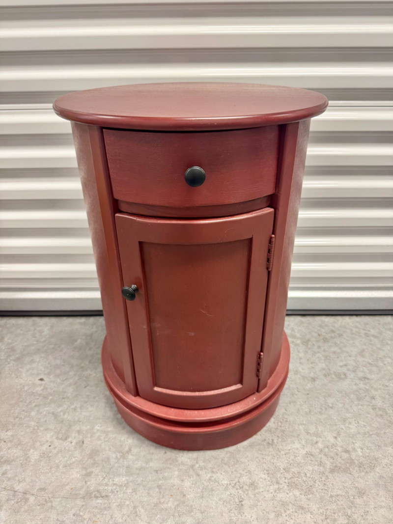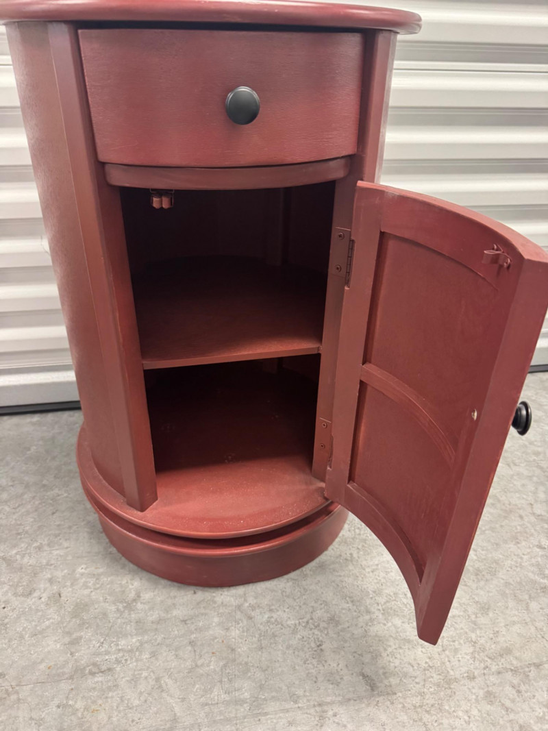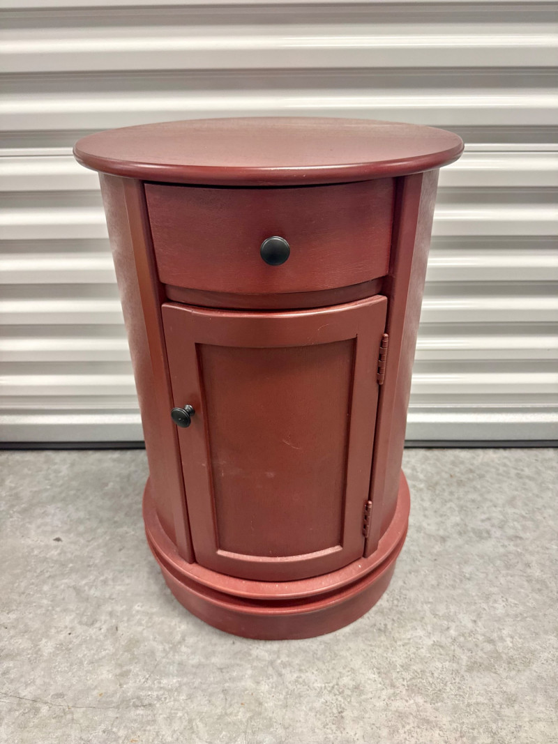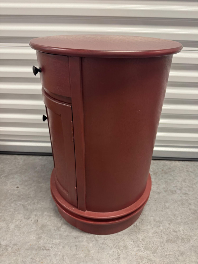 Barrel-Style Burgundy Side Table w/ Drawer & Cabinet Storage. 17” Diameter 26” Tall