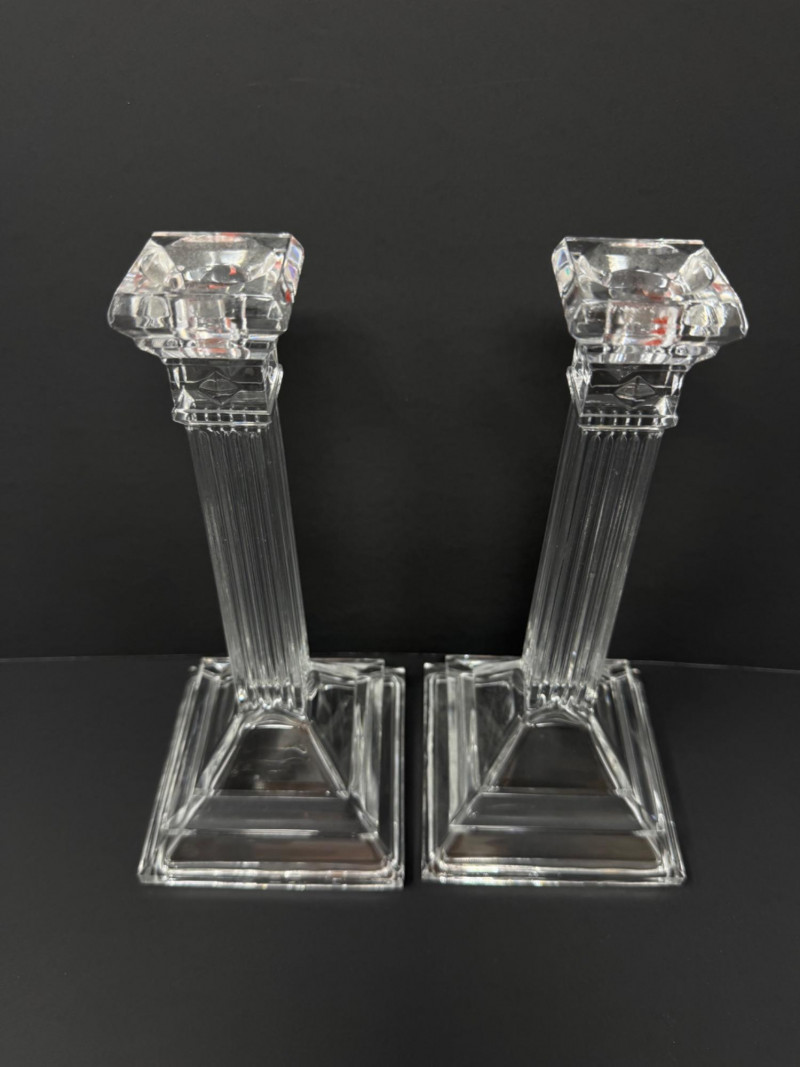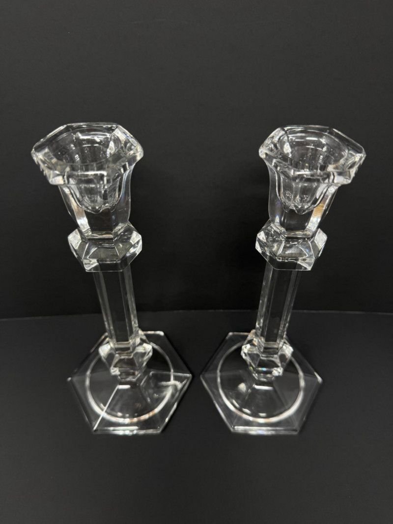 Greek-Style & Hexagon Crystal Candlesticks + Seal Paperweight. 10” Candlesticks