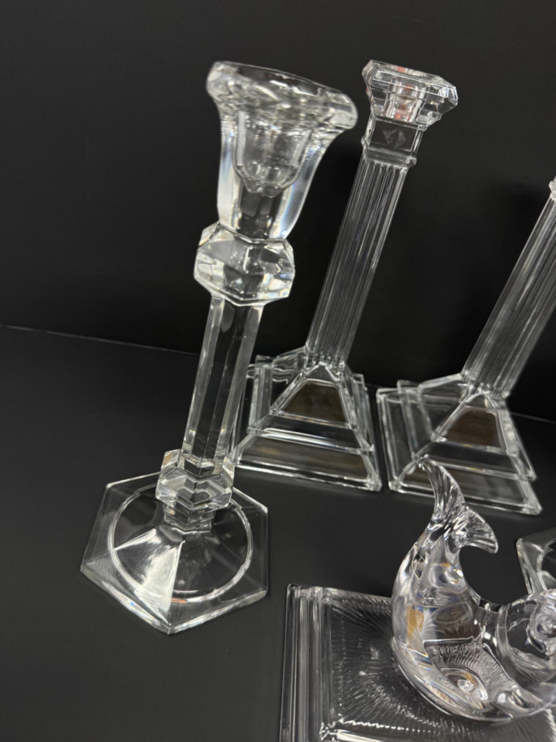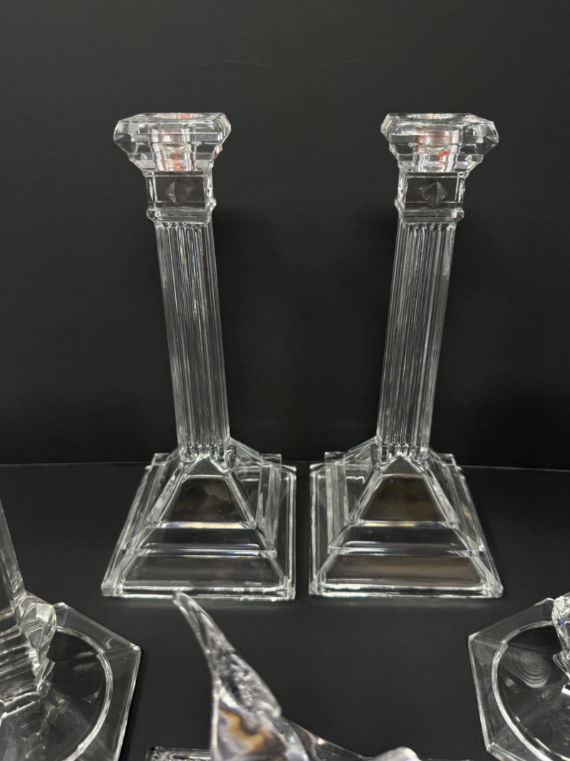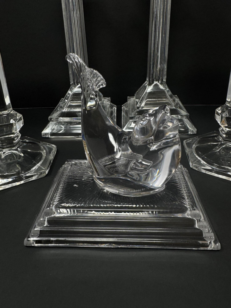 Lot # 58 - Greek-Style & Hexagon Crystal Candlesticks + Seal Paperweight