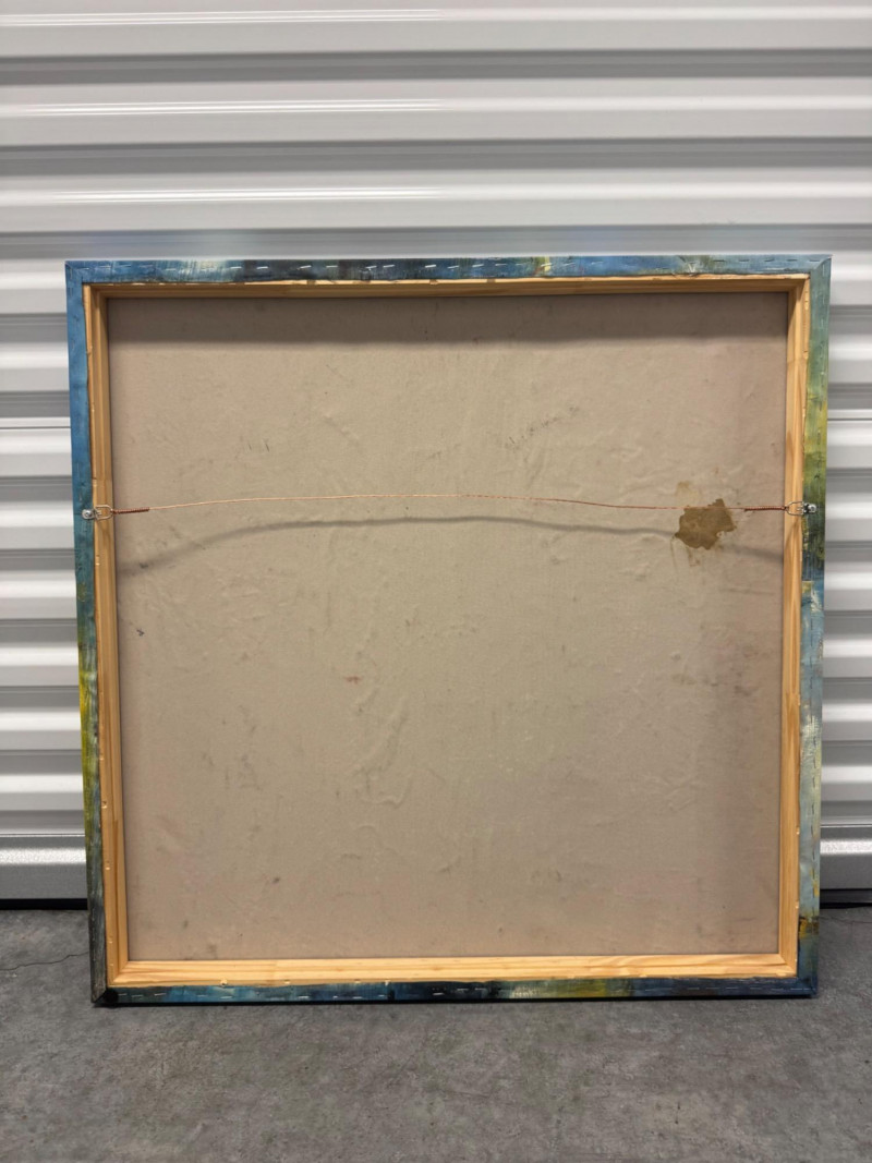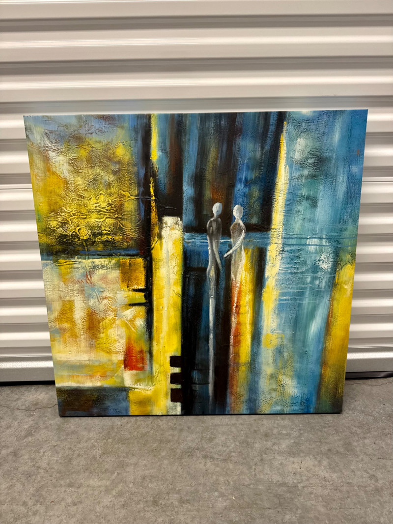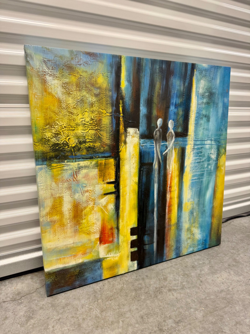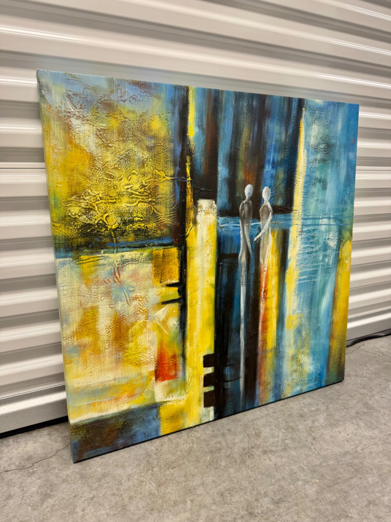 Abstract Painting on Canvas w/ Textured Blue-Yellow & Silhouettes. 31x31