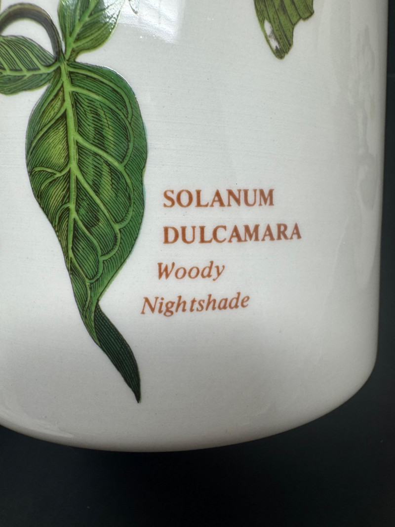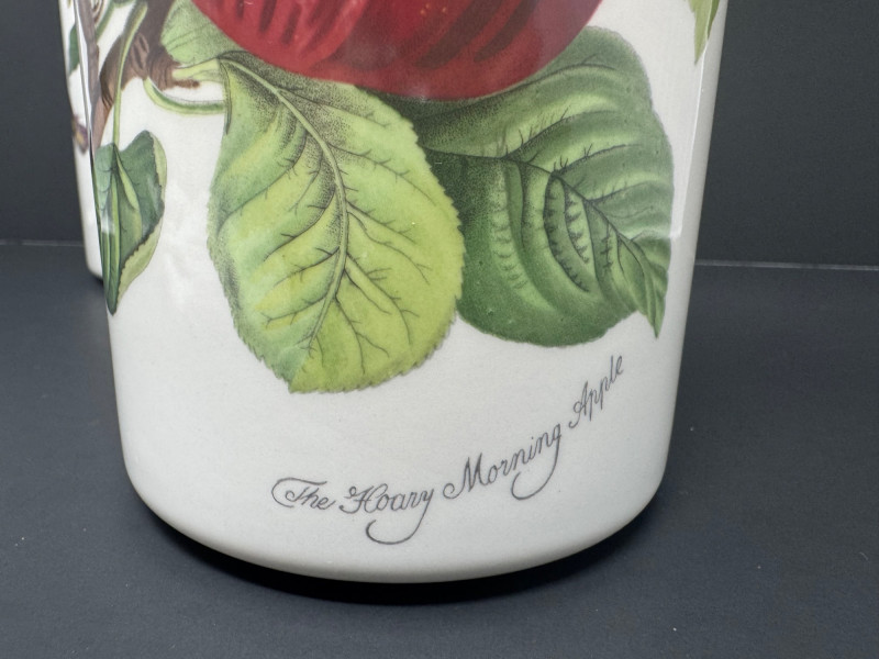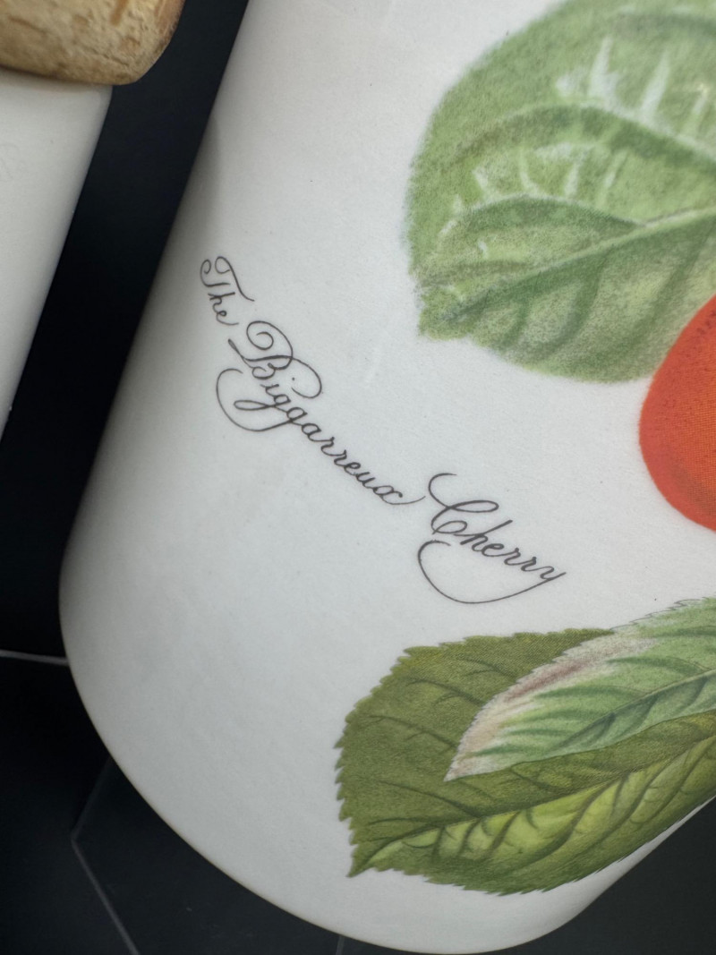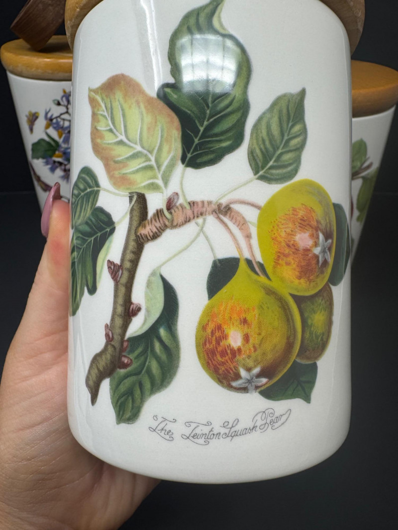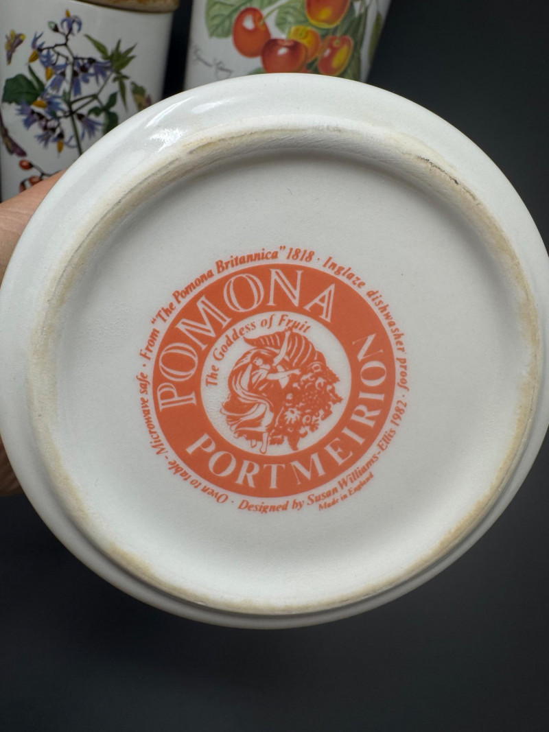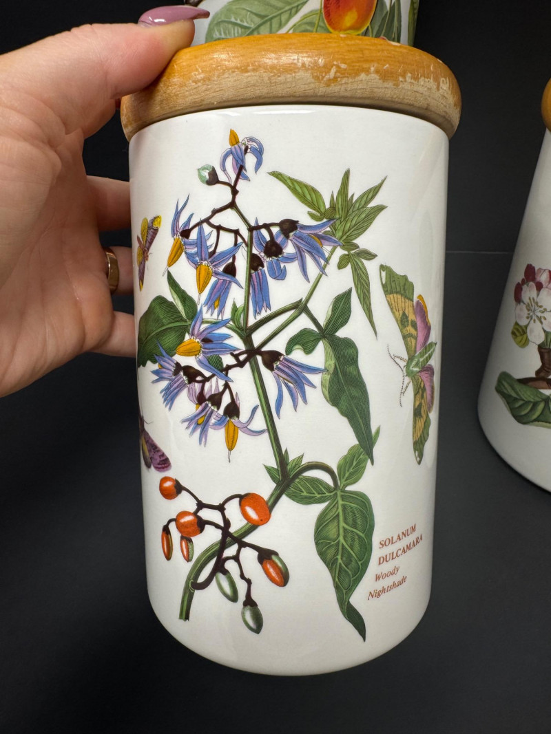 4pc Vintage Portmeirion Canister Set – Pomona & Botanic Garden. Vintage Portmeirion Botanic Garden Canister – Woody Nightshade by Susan Williams-Ellis Vintage Portmeirion Pomona Canister – Red Cherry Design, Made in England Vintage Portmeirion Pomona Canister – Hoary Morning Apple Vintage 1980s Portmeirion Pomona Spice Jar – Teinton Squash Pear Approx. 5.5”- 8” Tall