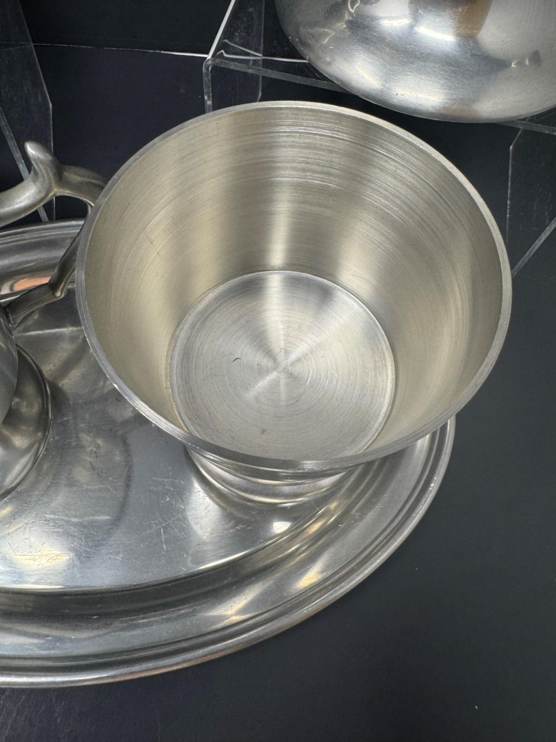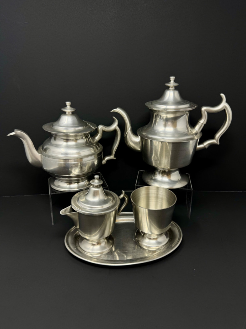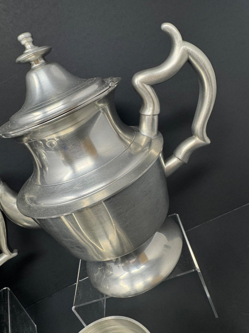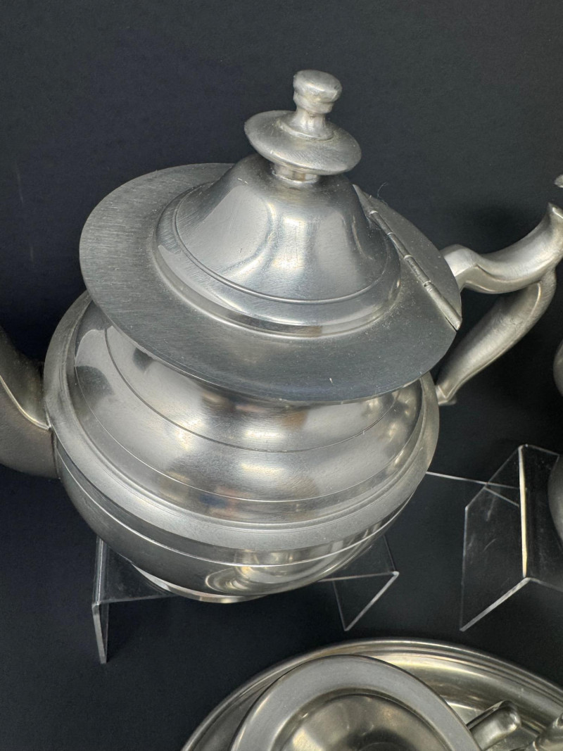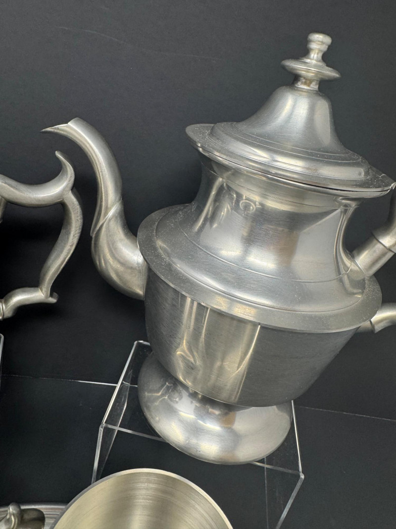 Woodbury Pewter Tea Set – Tray, Teapots, Sugar & Creamer.