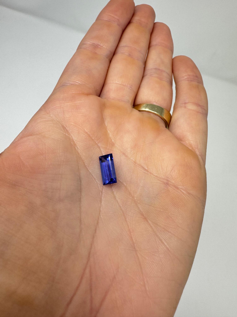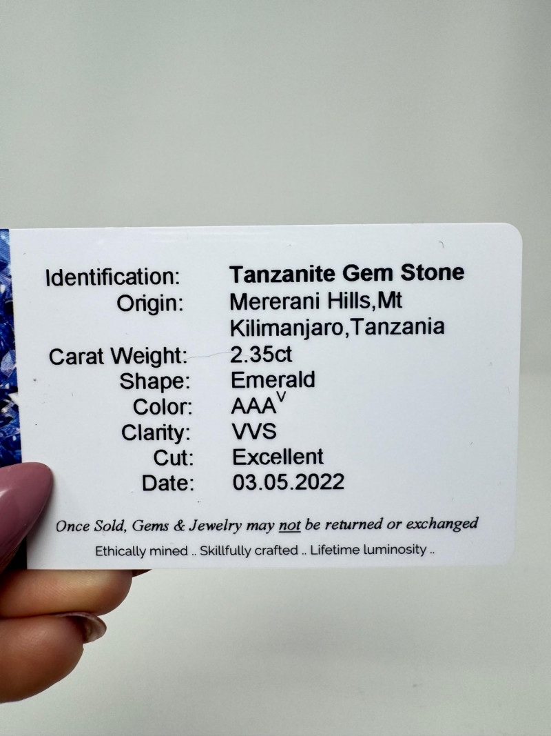 Tanzanite 2.35ct, Kilimanjaro Origin – AAA VVS Cut, $1,395 w/Cert. Faceted natural Tanzanite gemstone with certificate from African Galleria. Weight: 2.35 carats Shape: Emerald cut Color: AAA Clarity: VVS Cut: Excellent Origin: Mererani Hills, Mt. Kilimanjaro, Tanzania Purchase price: $1,395 (receipt included) Dated: 03.05.2022 Includes certificate and original receipt from African Galleria.