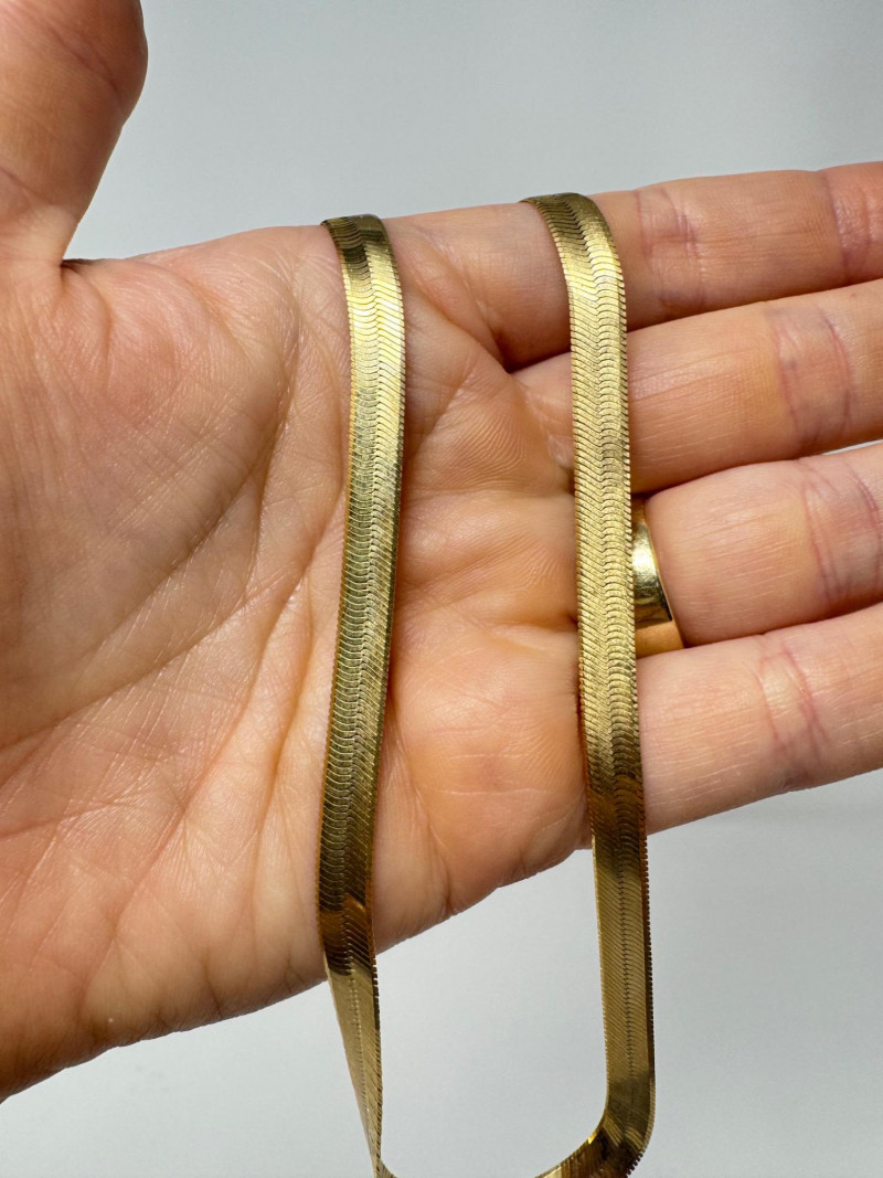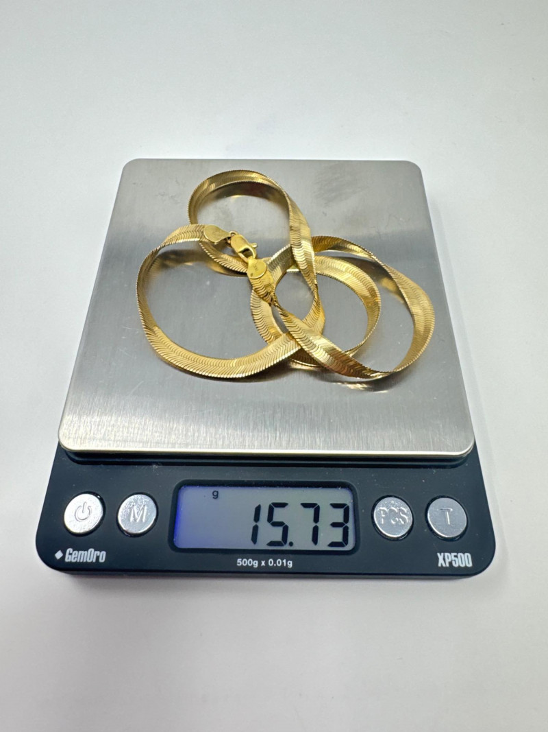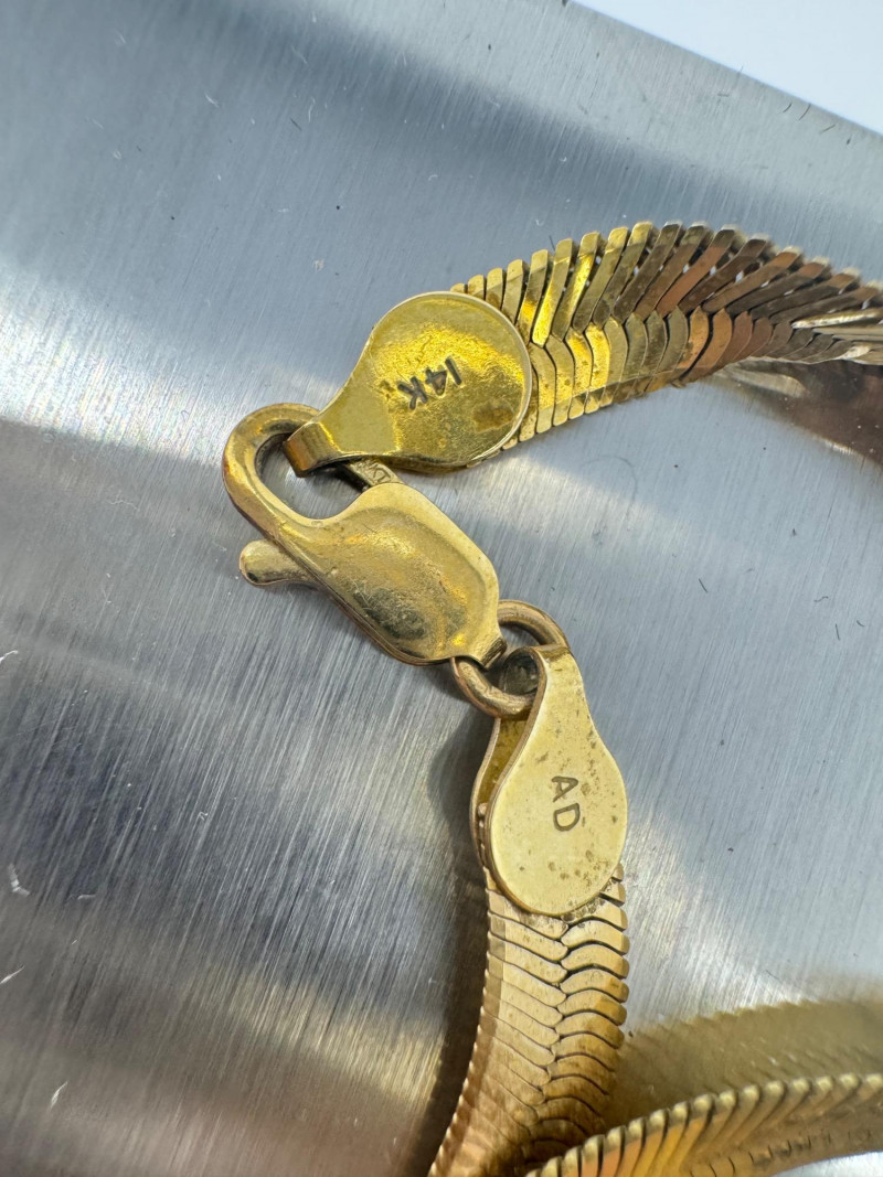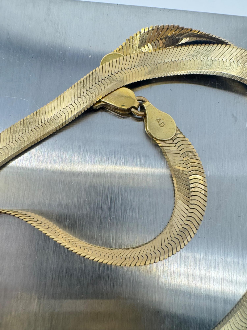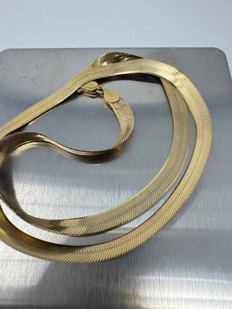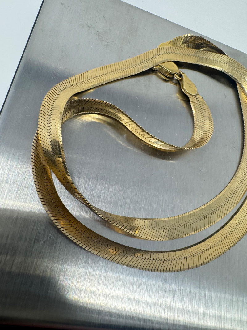 14K Gold Herringbone 17" Chunky Necklace – Approx. 15.73g. Disclaimer: Necklace is in excellent condition but it has not been tested by jewelers. By placing a bid, you acknowledge and agree to purchase the item "as is" without any guarantees regarding metal quality, content, or purity. Refunds will not be issued based on these factors.