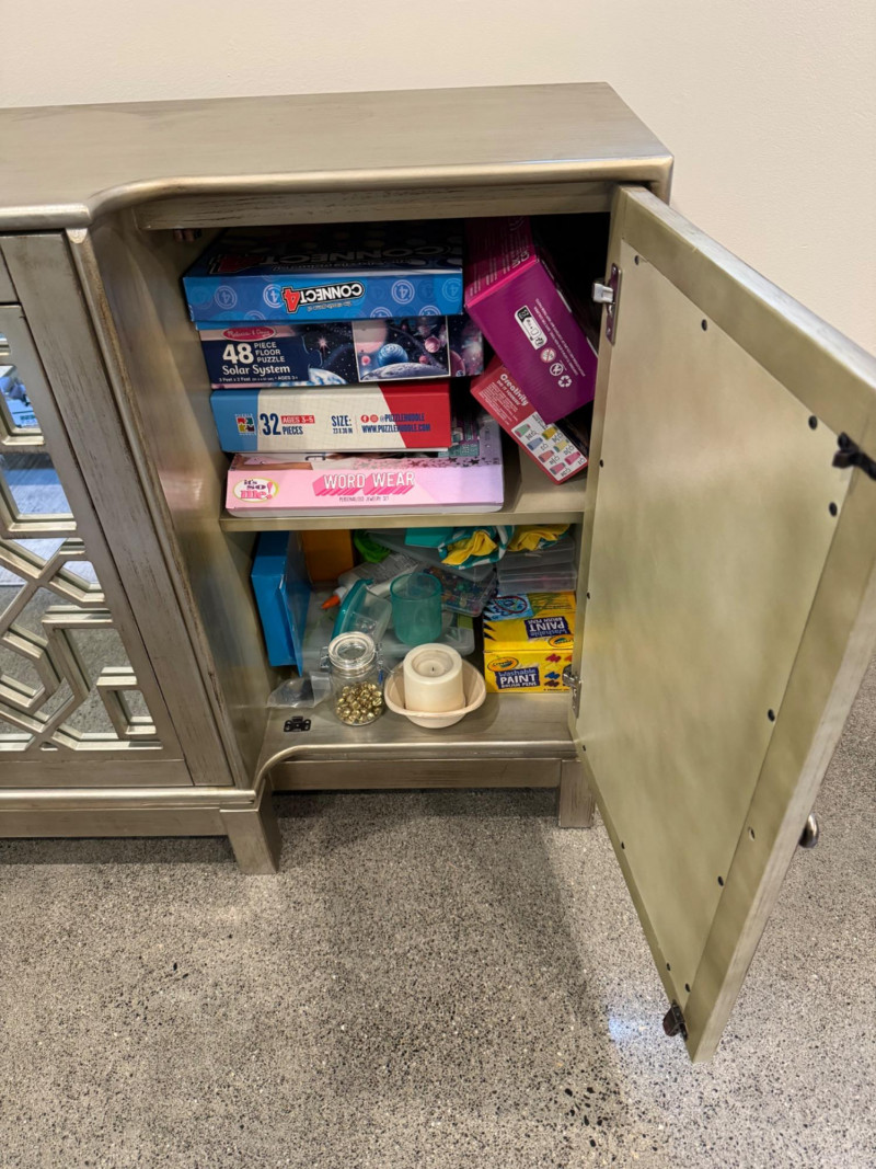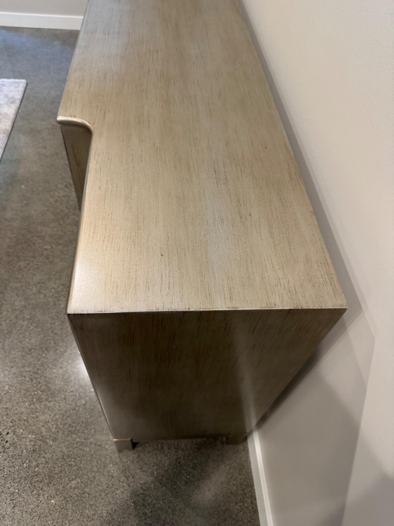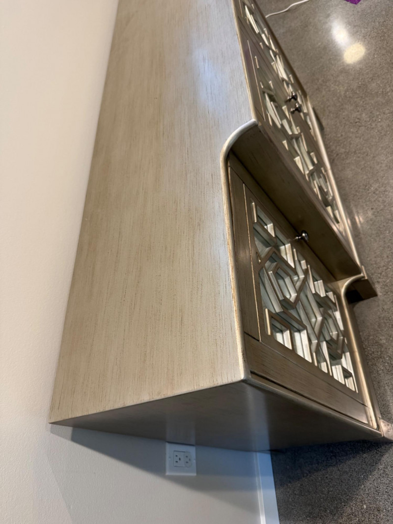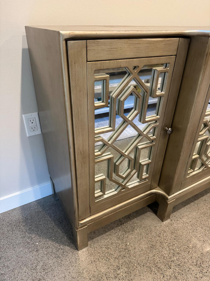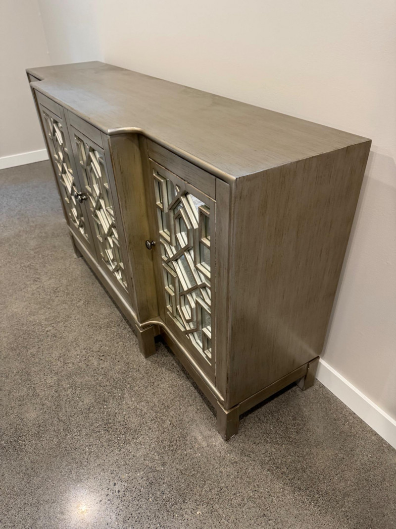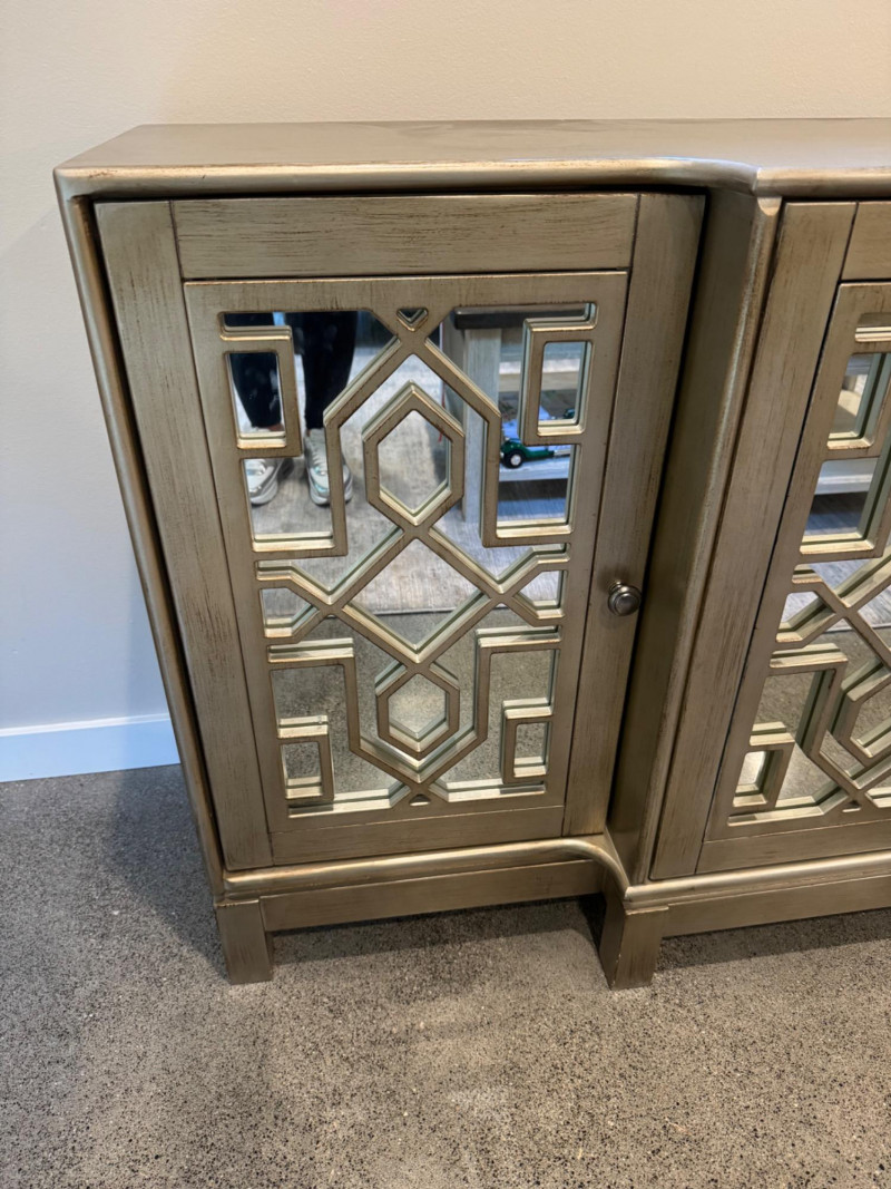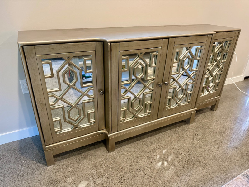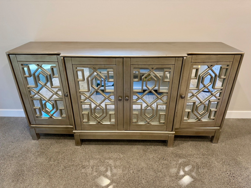 Mirrored Buffet Cabinet w/ Geometric Style Doors. 70” Long 18” Deep 34” Tall 🚚 Auction Pickup Reminder: