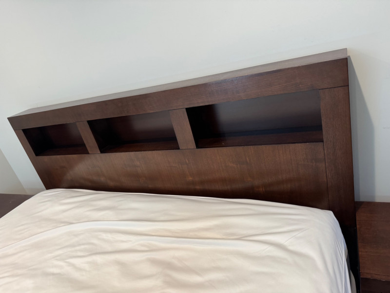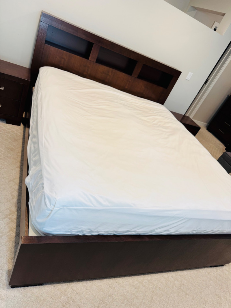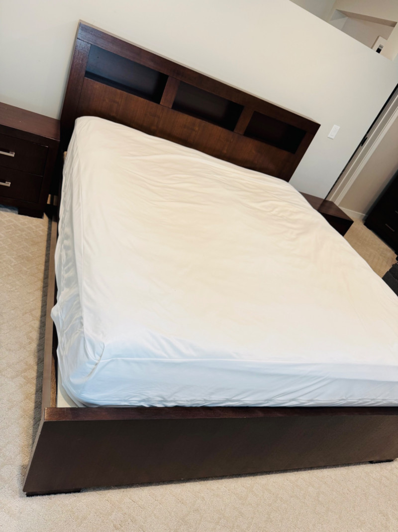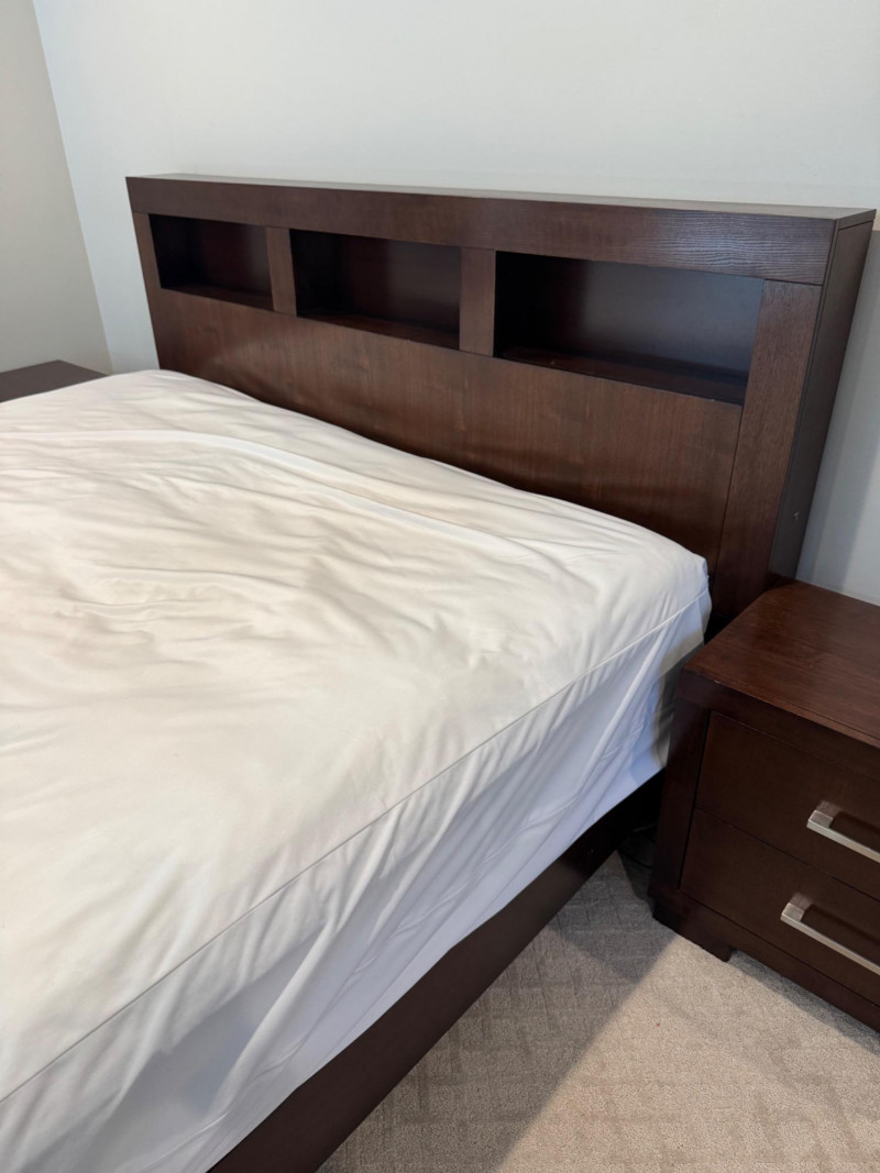 King Platform Bed w/ Storage Headboard + Serta iSeries Mattress. Dimensions: Bed frame: 76" wide x 93" long Headboard height: 47" tall Notes: Includes a Serta iSeries Hybrid mattress in great condition 🚚 Auction Pickup Reminder: