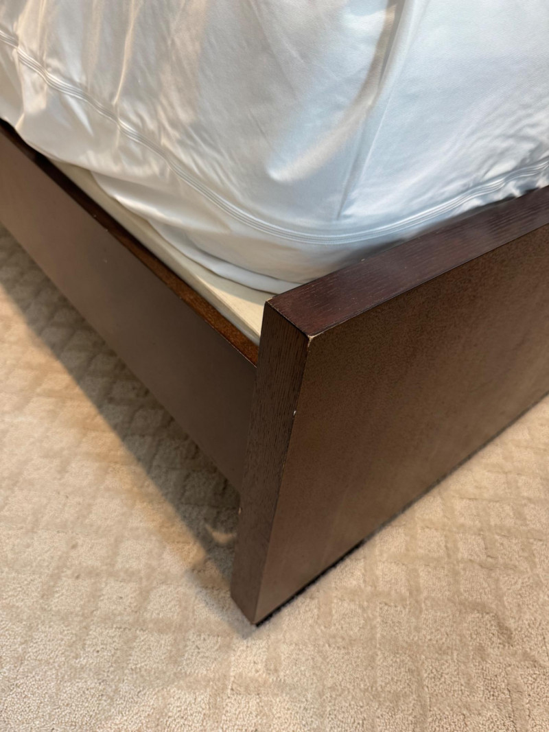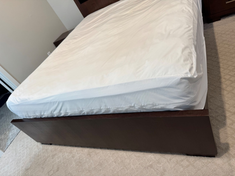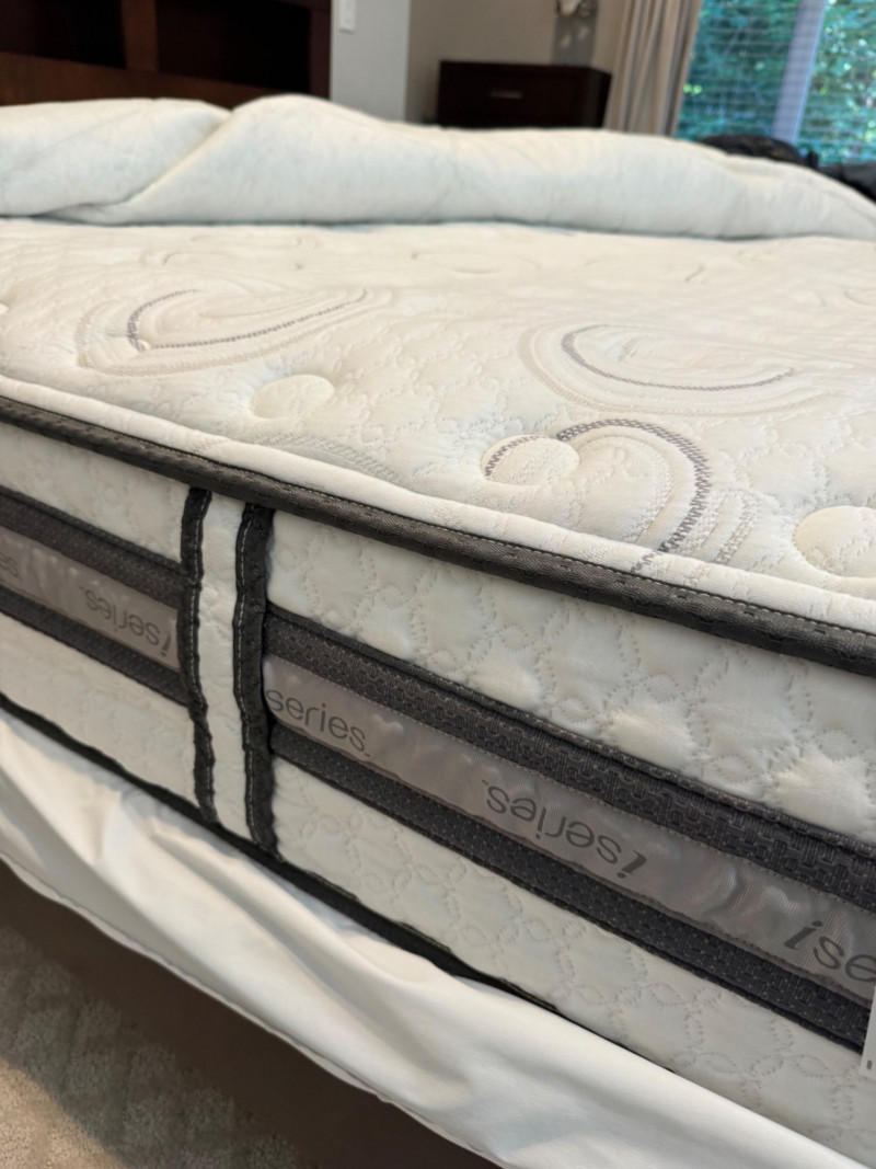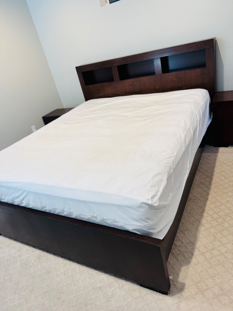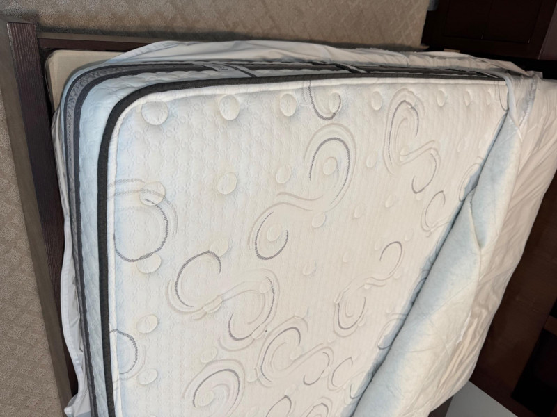 King Platform Bed w/ Storage Headboard + Serta iSeries Mattress. Dimensions: Bed frame: 76" wide x 93" long Headboard height: 47" tall Notes: Includes a Serta iSeries Hybrid mattress in great condition 🚚 Auction Pickup Reminder: