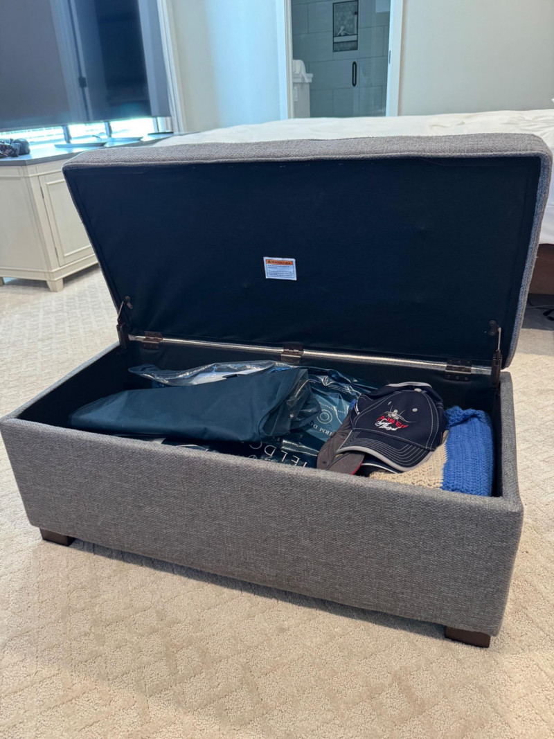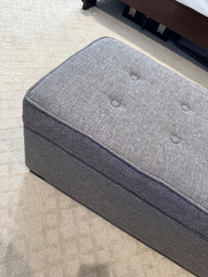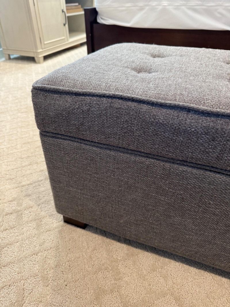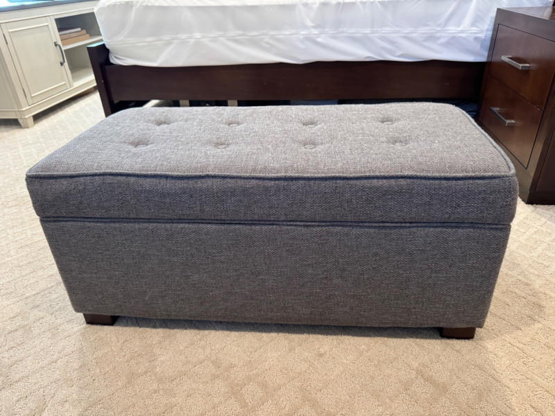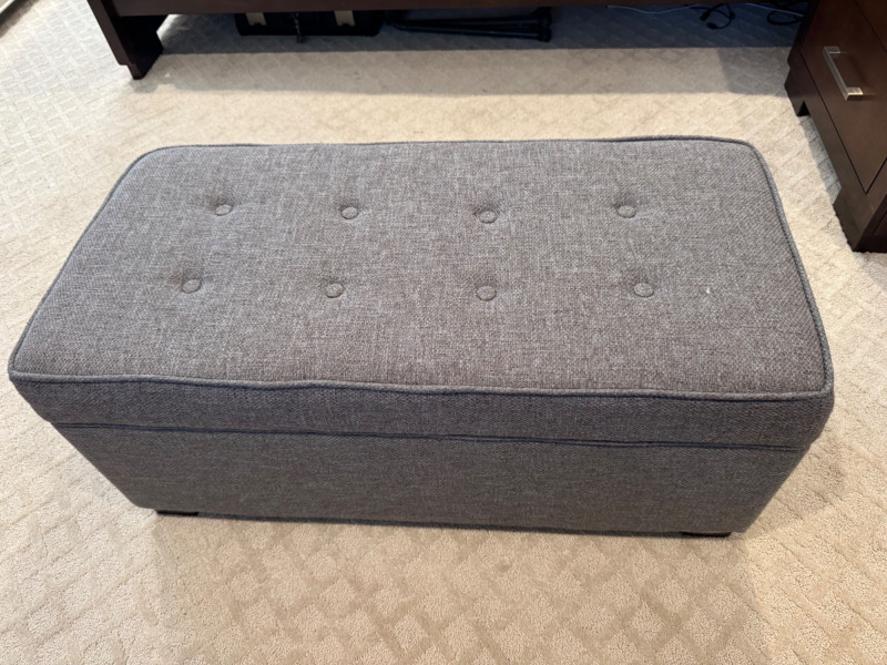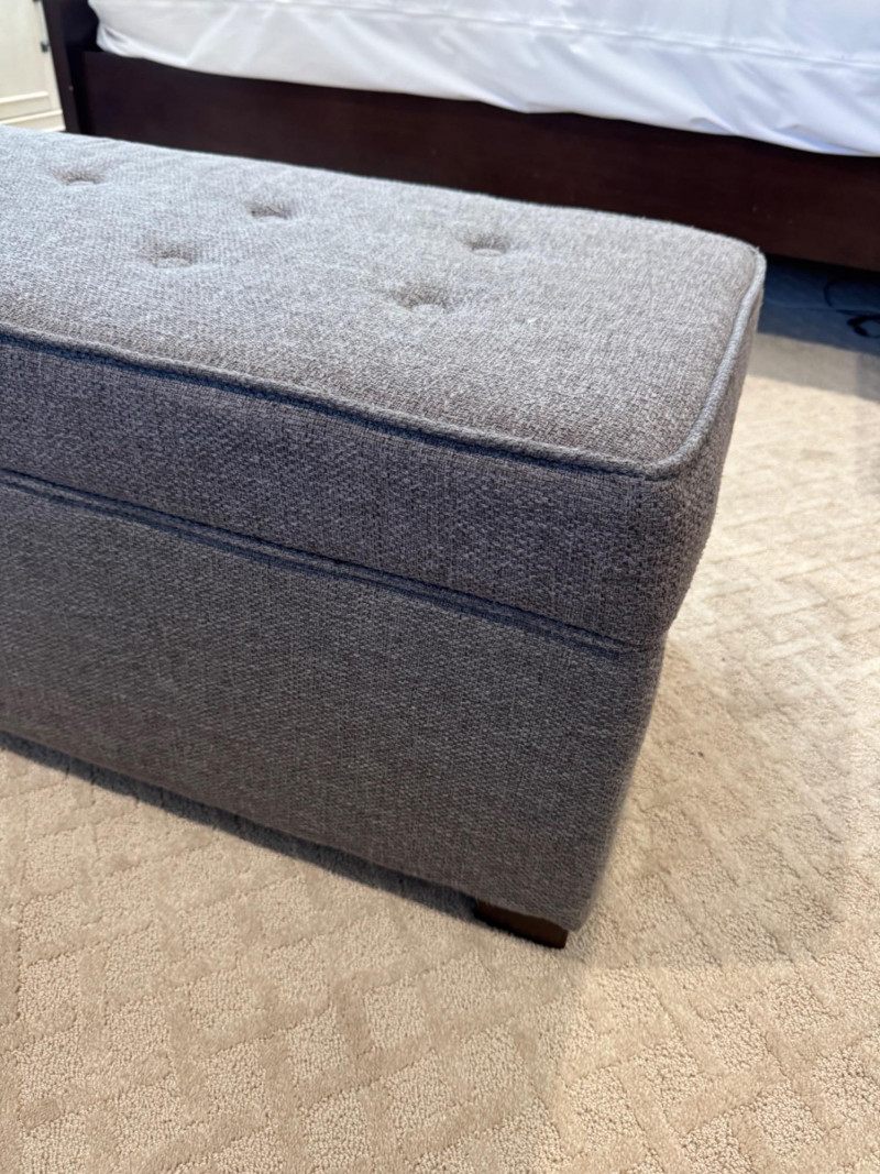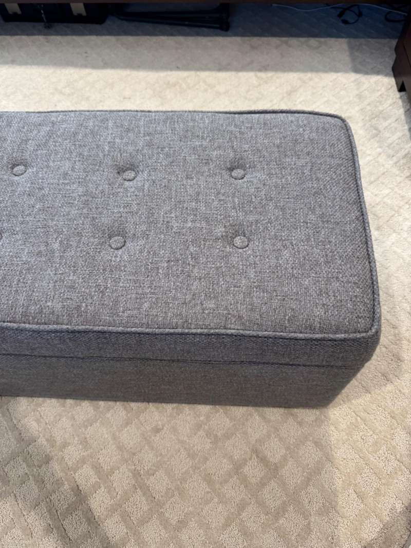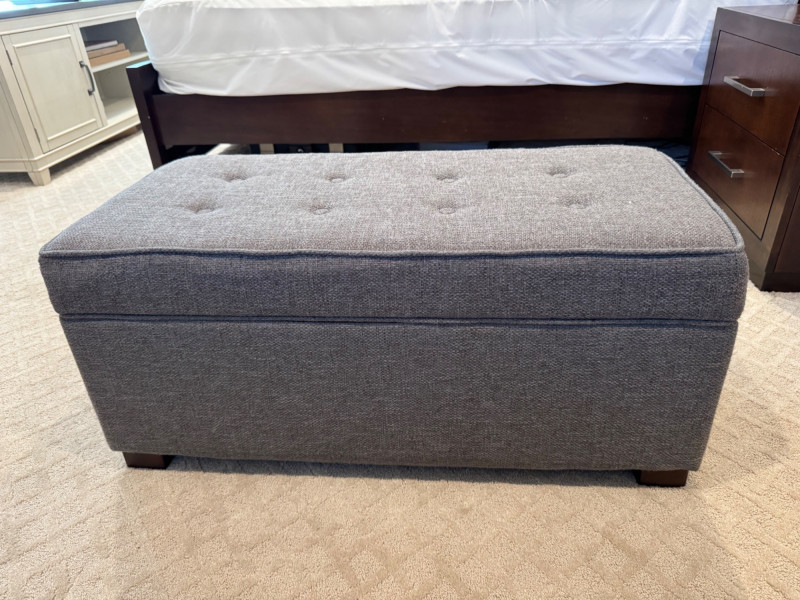 Grey Upholstered Storage Ottoman w/ Tufted Top. Dimensions: 37.5" long 17.5" deep 17" tall Disclaimer: Contents shown inside ottoman not included. 🚚 Auction Pickup Reminder: