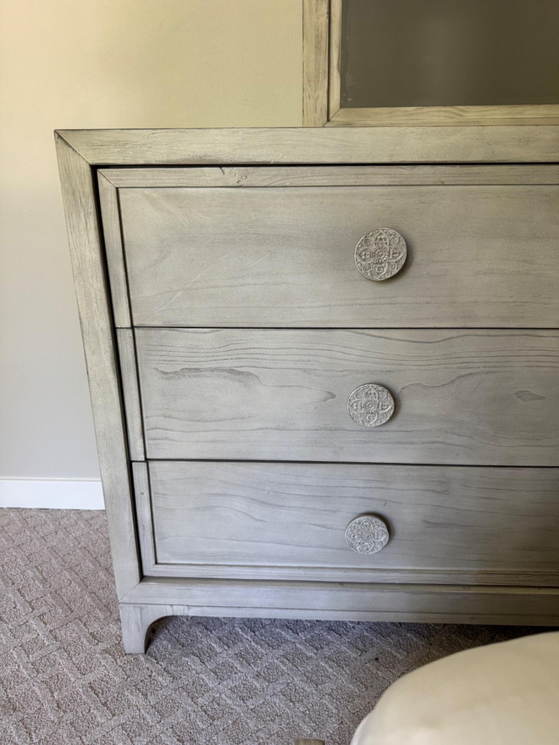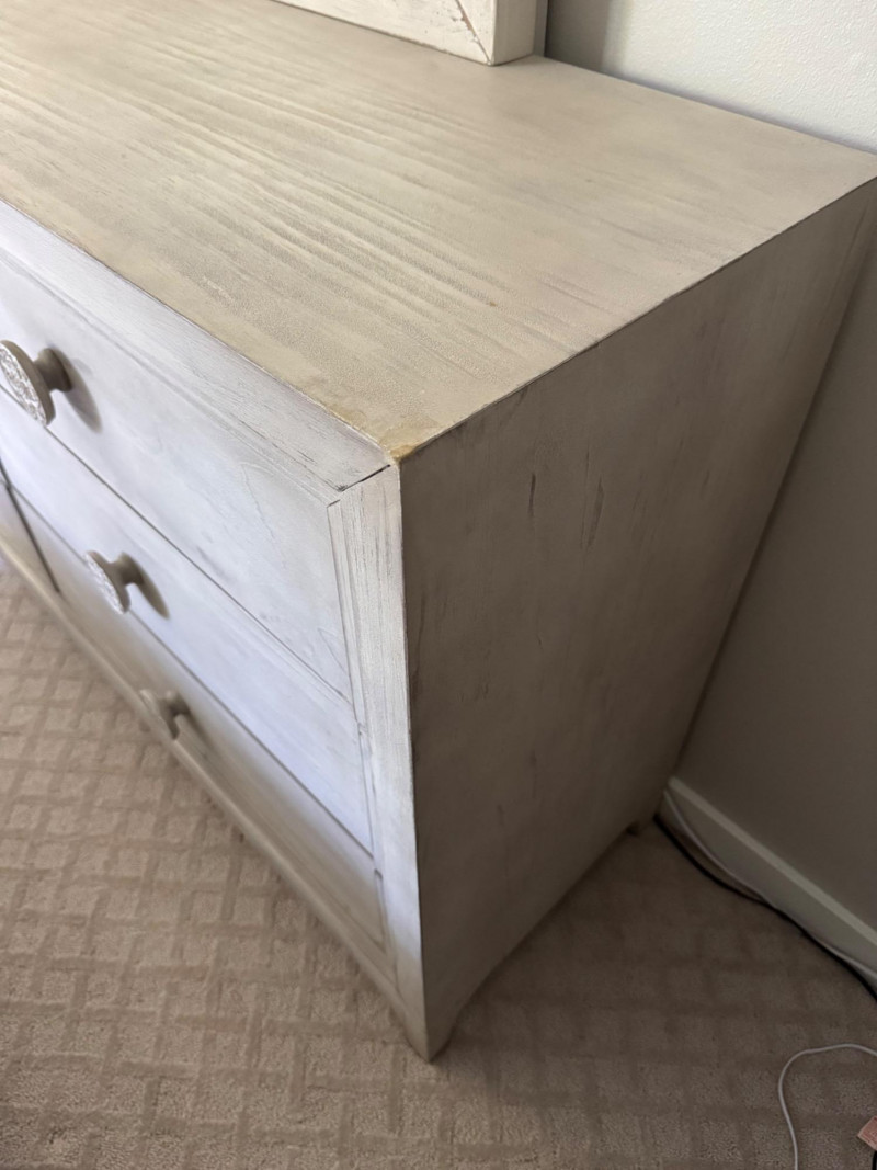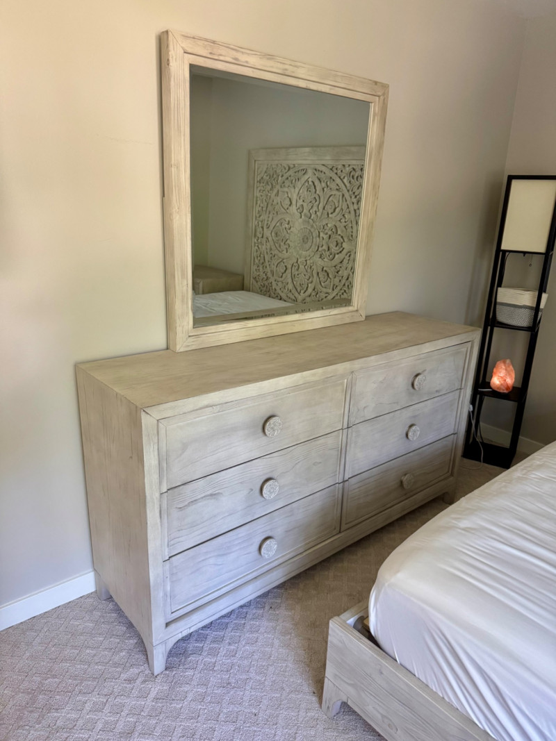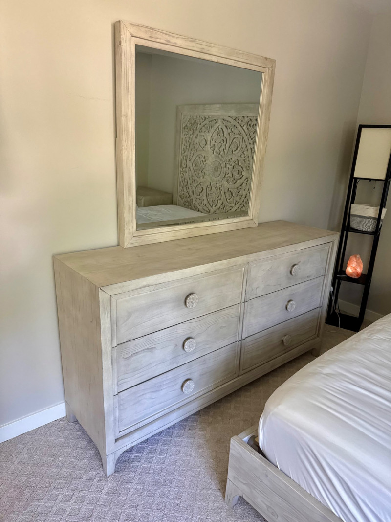 Lot # 28 - Whitewashed 6-Drawer Dresser w/ Carved Knob Detail & Framed Mirror