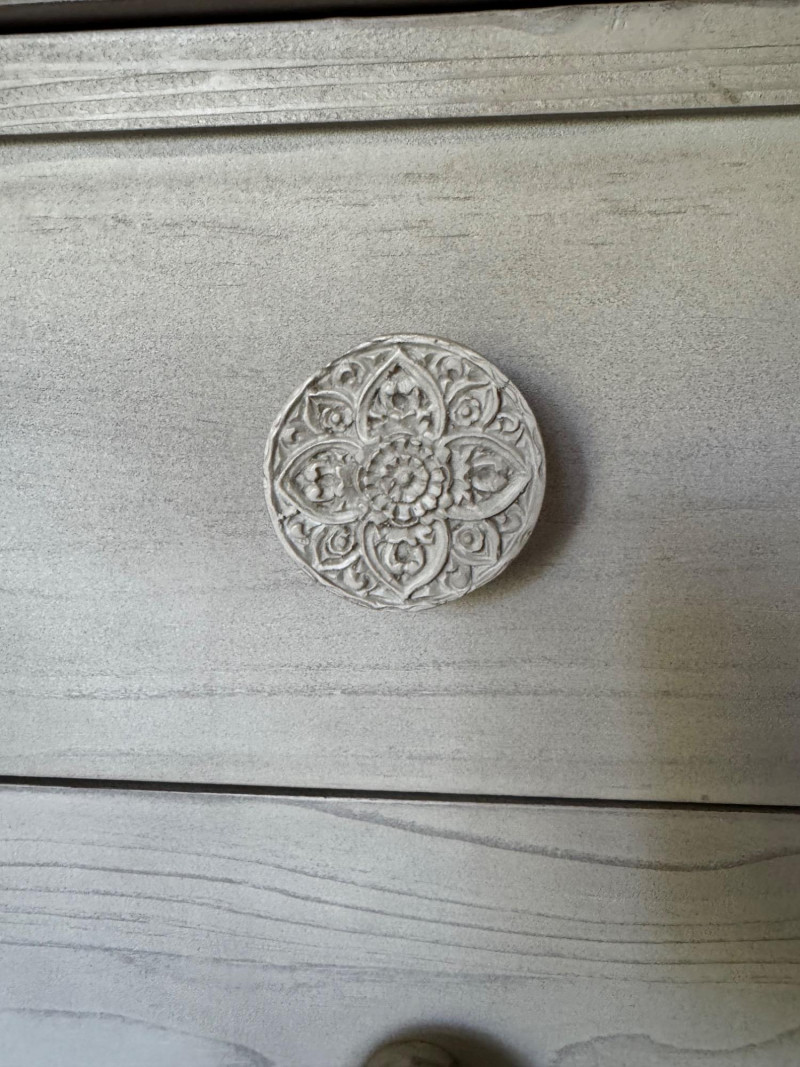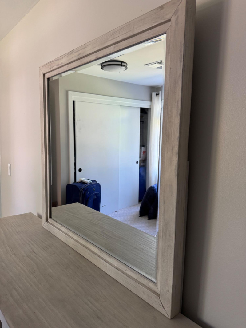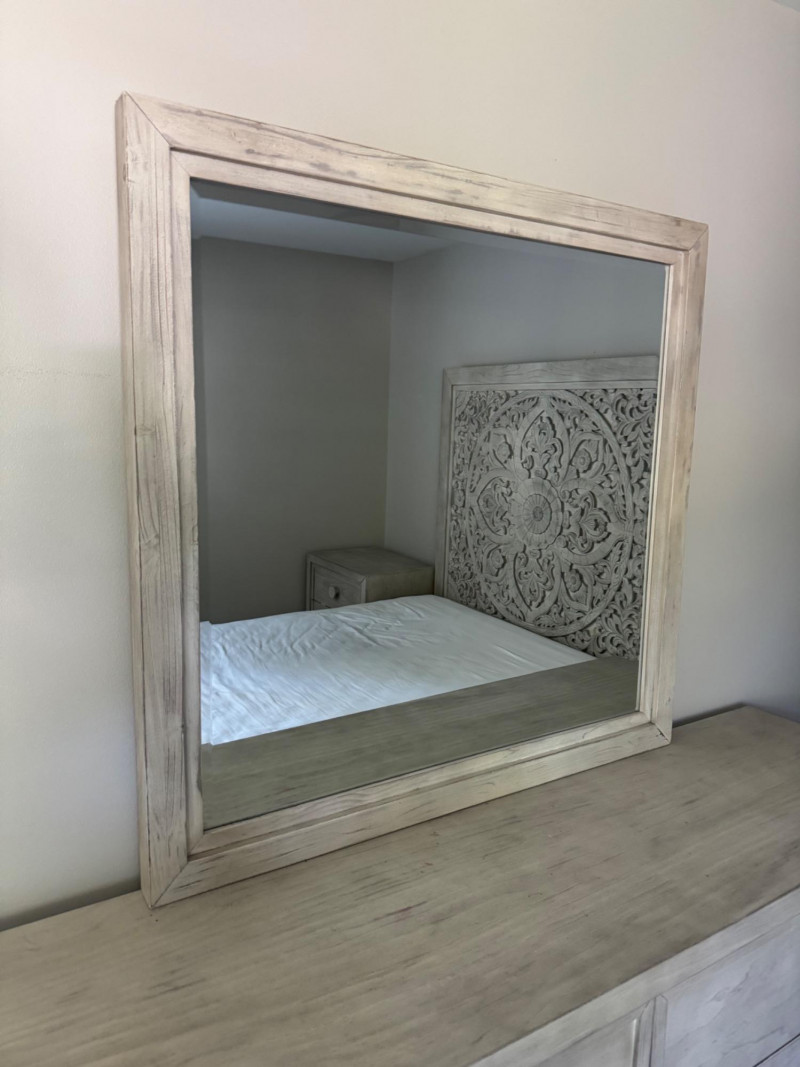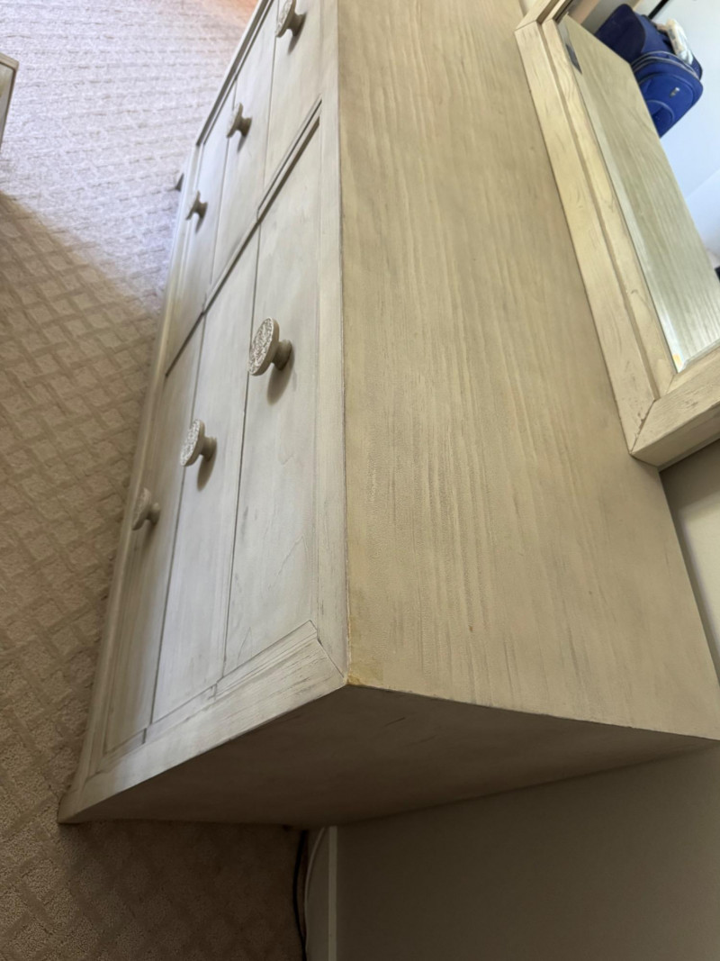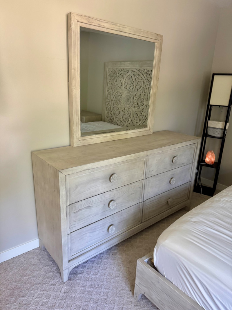 Lot # 28 - Whitewashed 6-Drawer Dresser w/ Carved Knob Detail & Framed Mirror