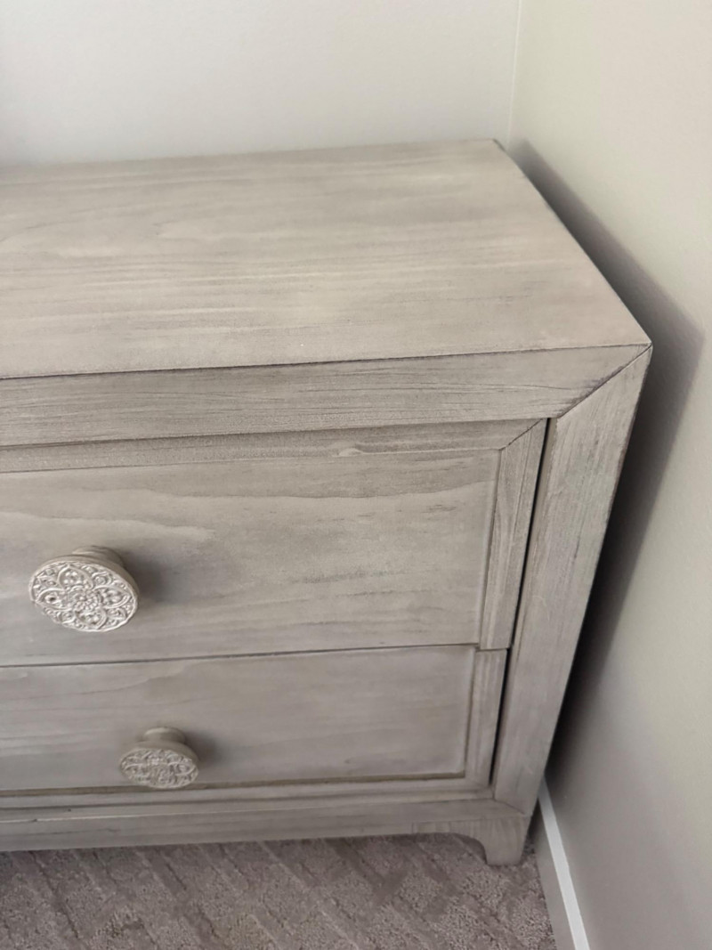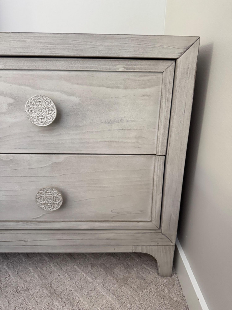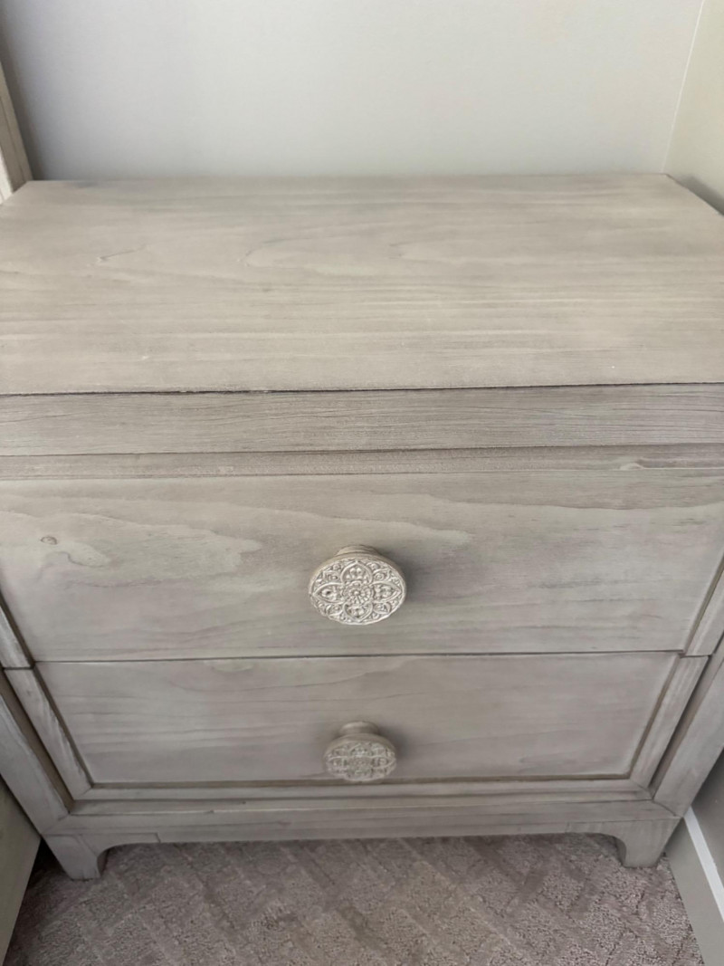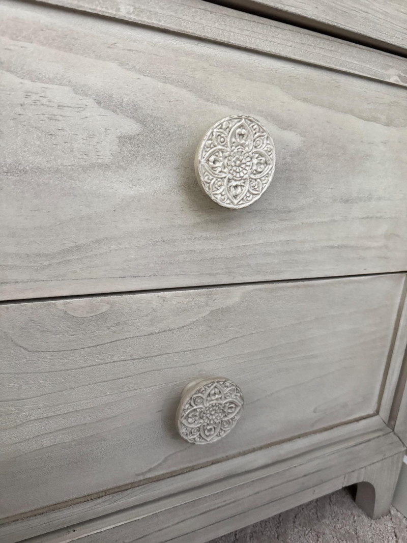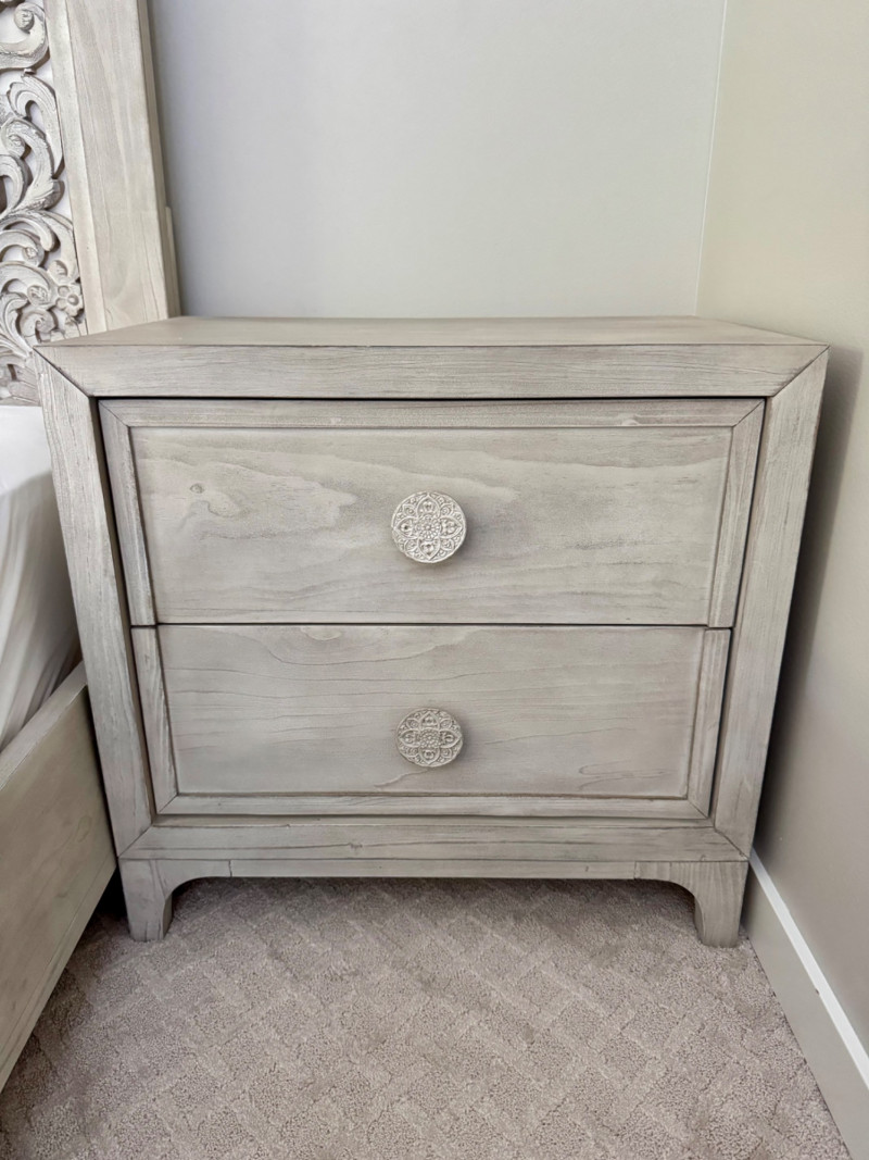 Whitewashed Nightstand w/ Round Boho-Inspired Knobs. Dimensions: 28" W x 18" D x 27" H