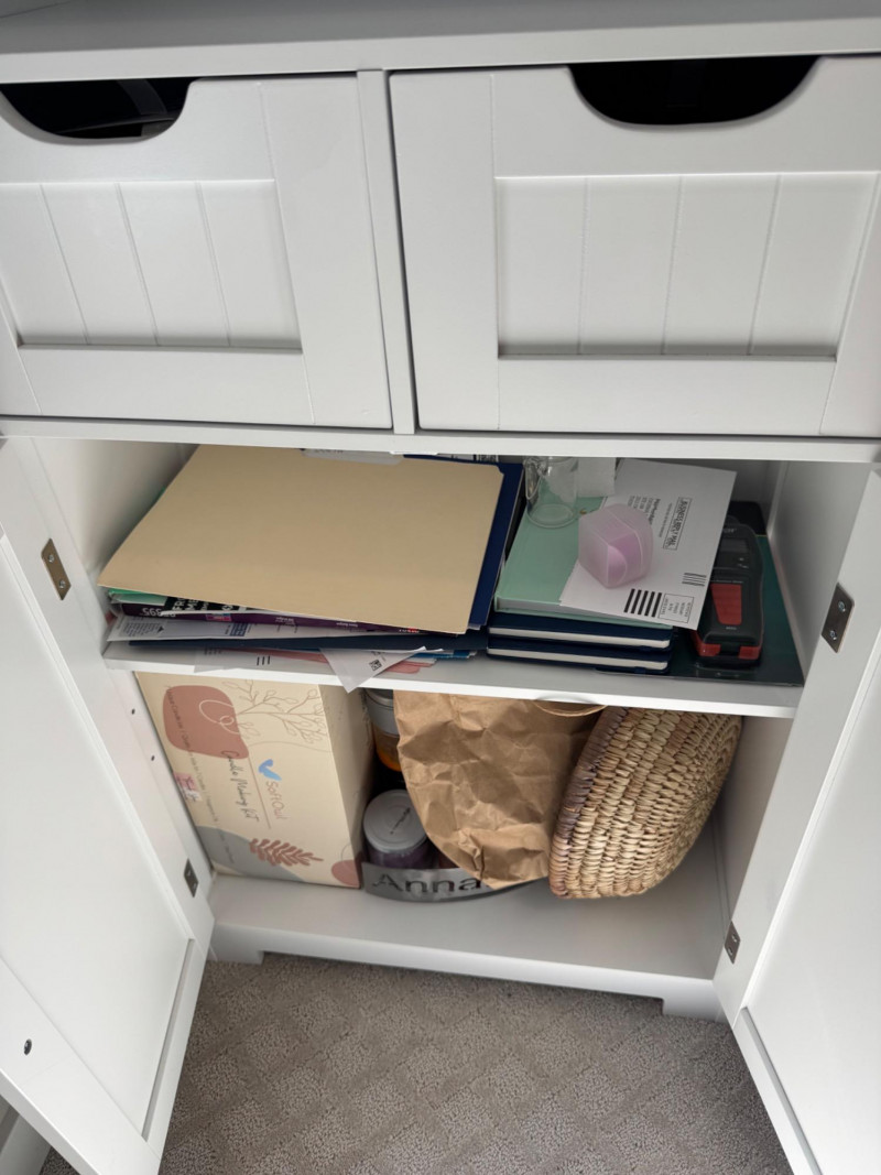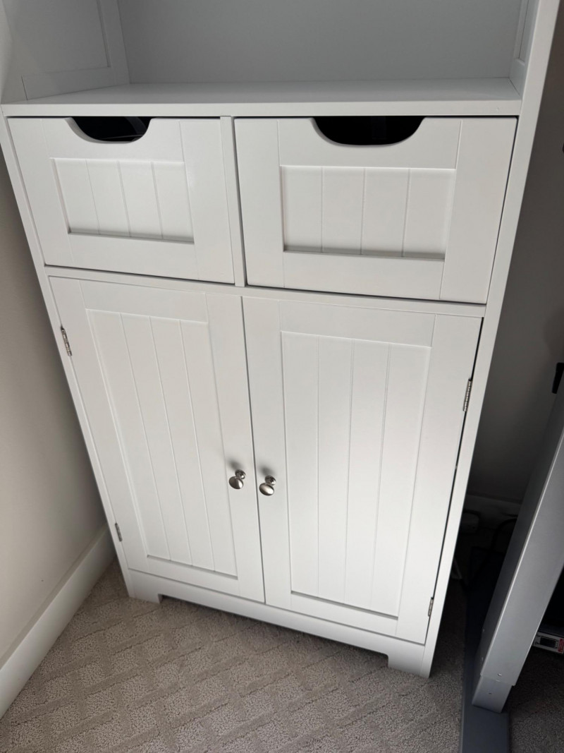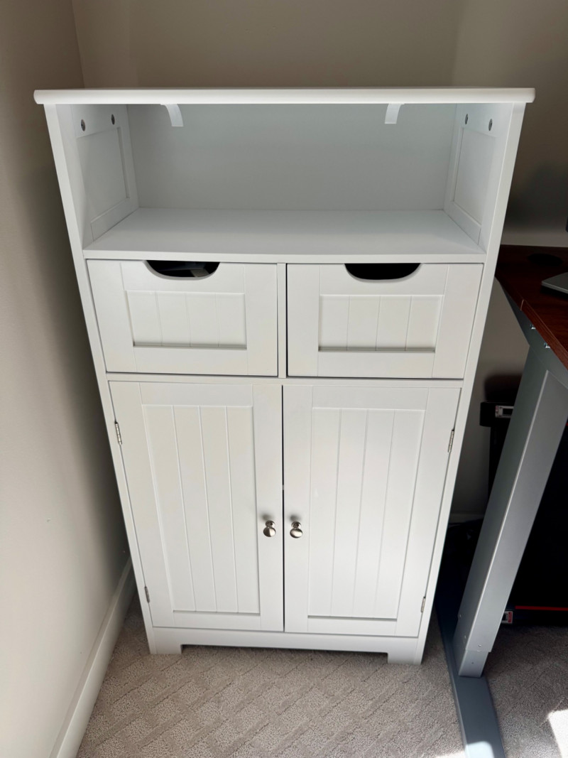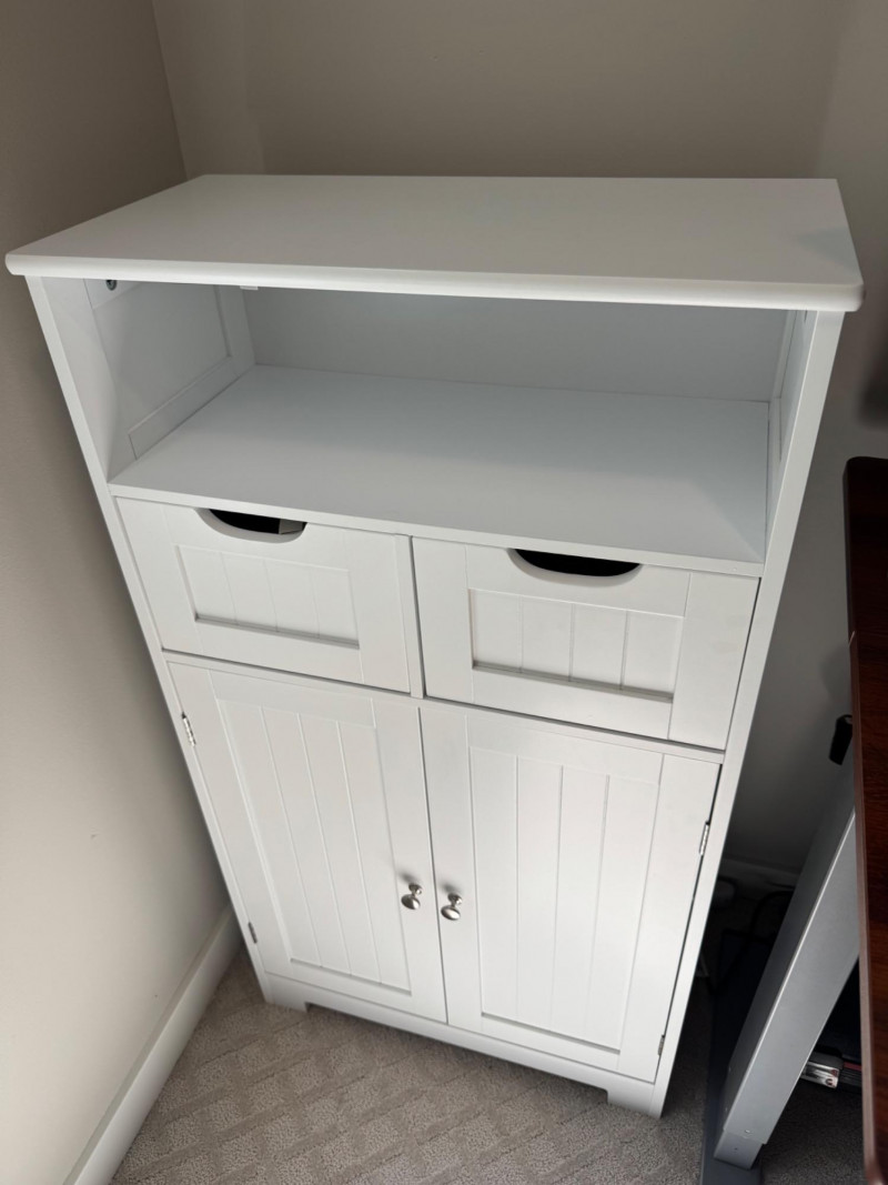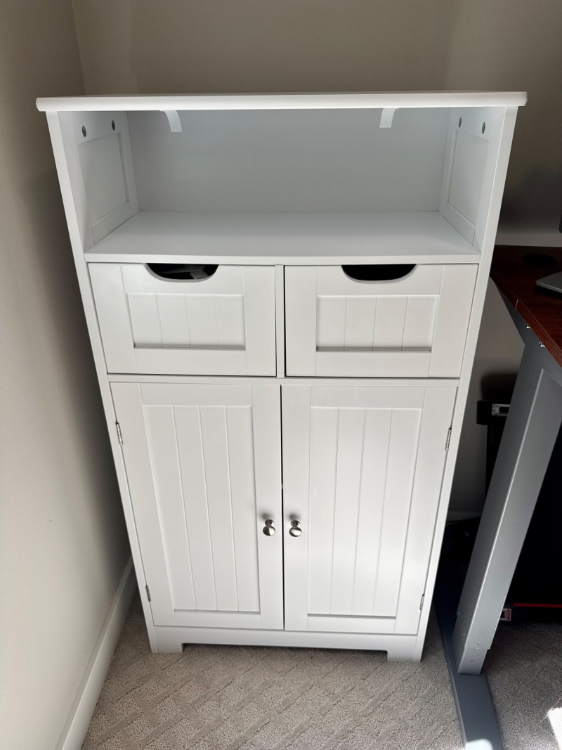 White 2-Drawer & 2-Door Storage Cabinet w/ Open Shelf. Dimensions: 23.5” wide 12” deep 42.5” tall Disclaimer: Contents not included. 🚚 Auction Pickup Reminder: