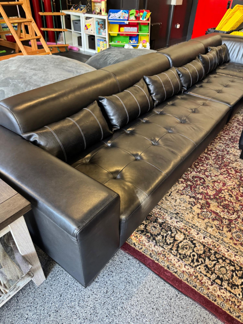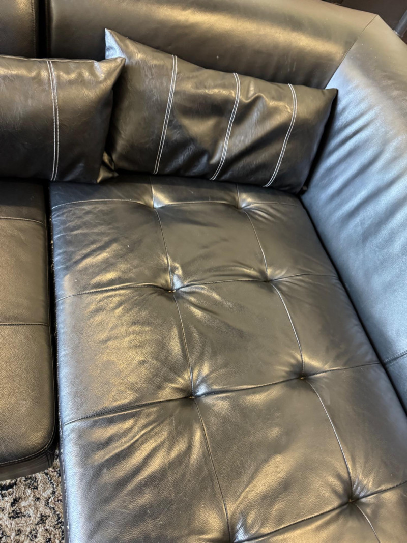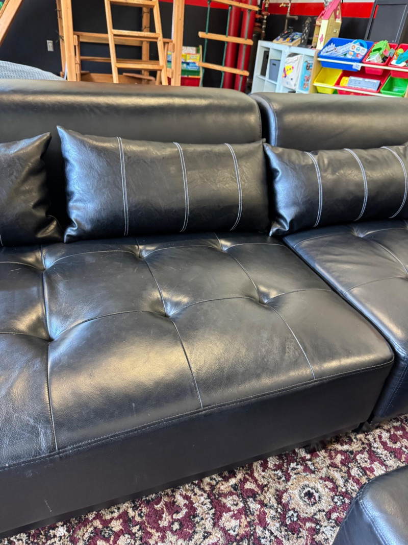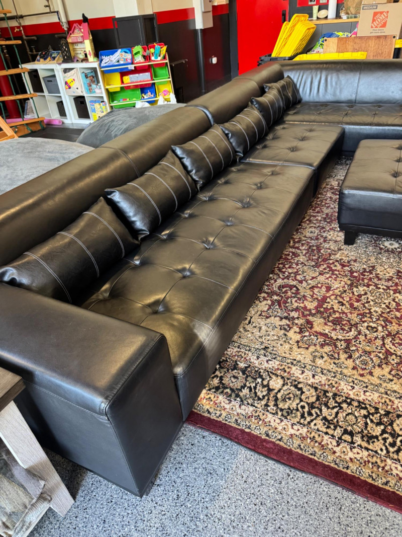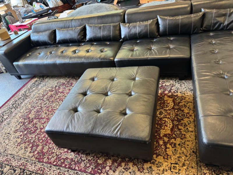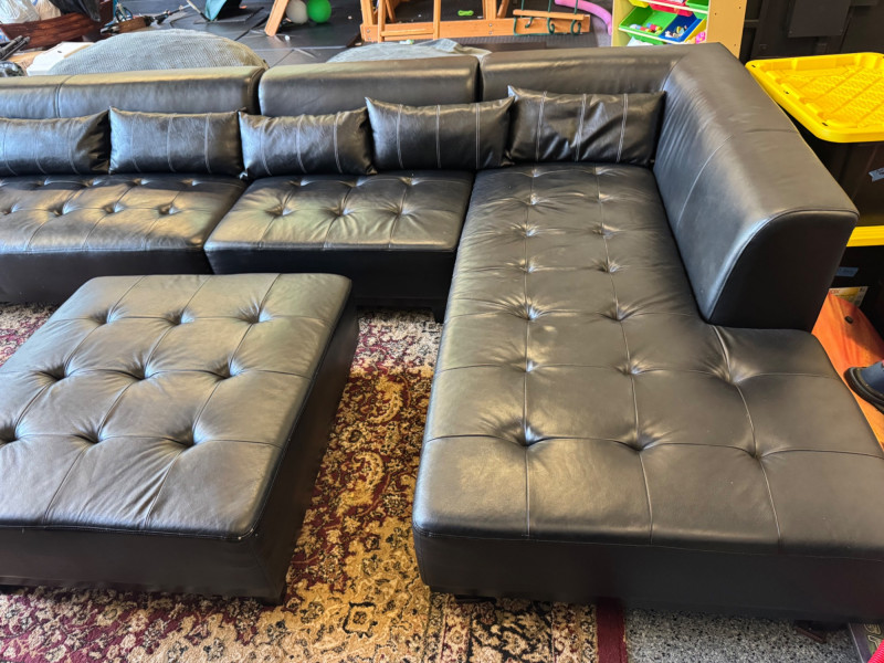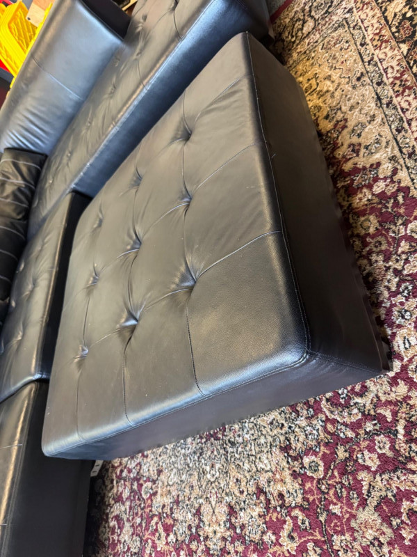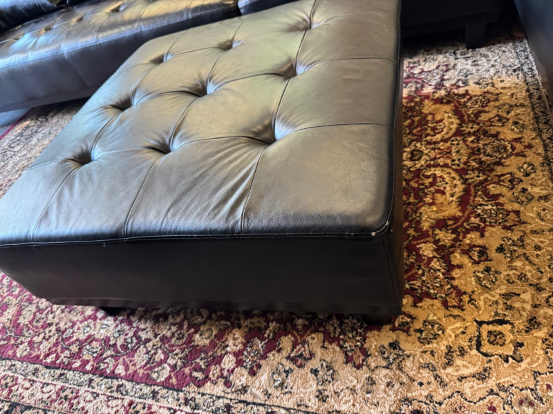 XL Tufted Black Leather Sectional Sofa w/ Ottoman. Dimensions: Sofa Total Length: 159 inches (long side) x 80 inches (short side) Seat Height: 15 inches tall Seat Back Height: 28.5 inches tall Ottoman: 36 inches x 38 inches (top dimensions), 15 inches tall Condition: Leather is worn on one section of the sofa. One leg shows wear/chipping. Refer to images for specific condition details. Bidding on this lot is an agreement that: (1.) You will have at least 2 capable, able bodied persons to lift and load at a minimum. (2.) You will bring a hand truck and/or any other tools needed to remove this item. If these steps are not followed your item will be forfeit and no refund given. 🚚 Auction Pickup Reminder: