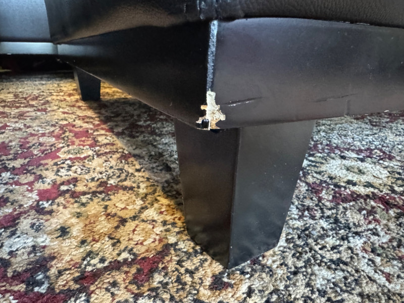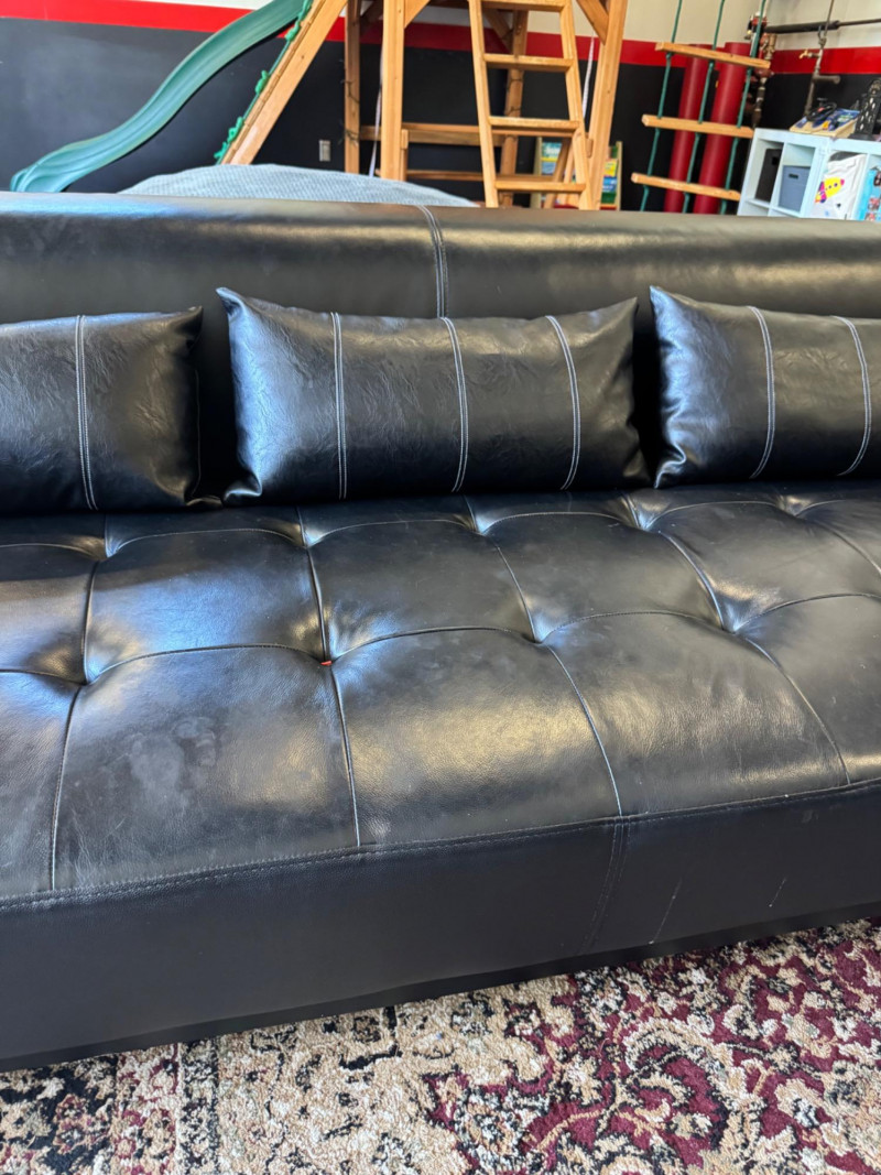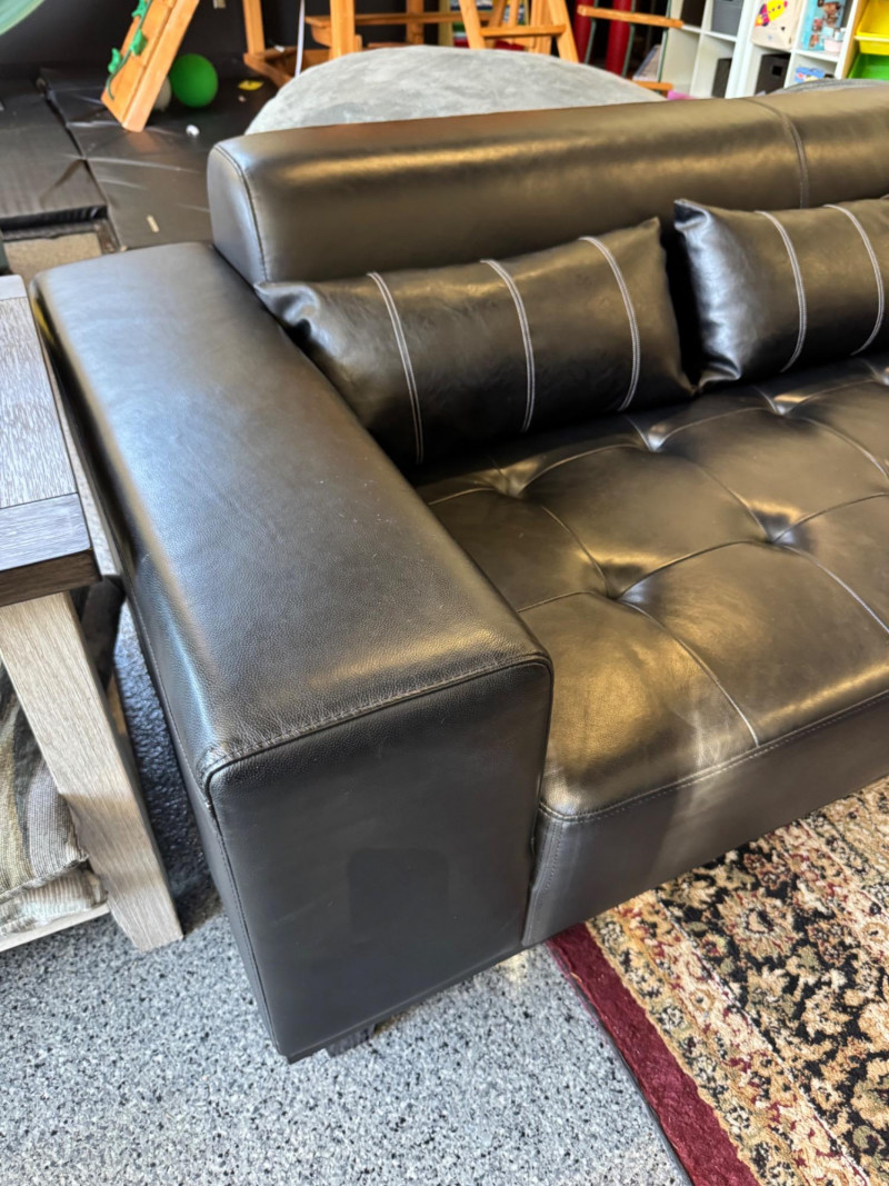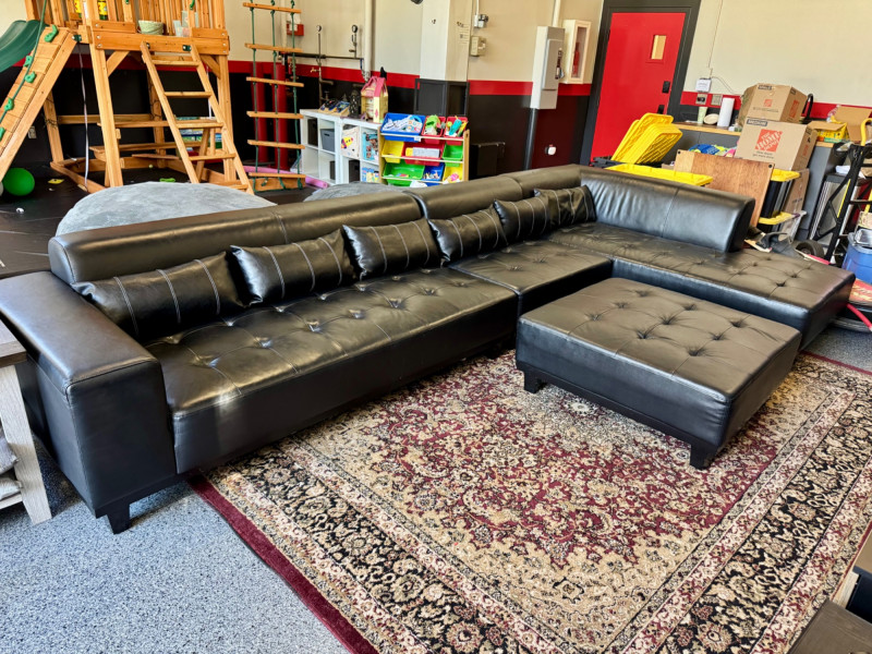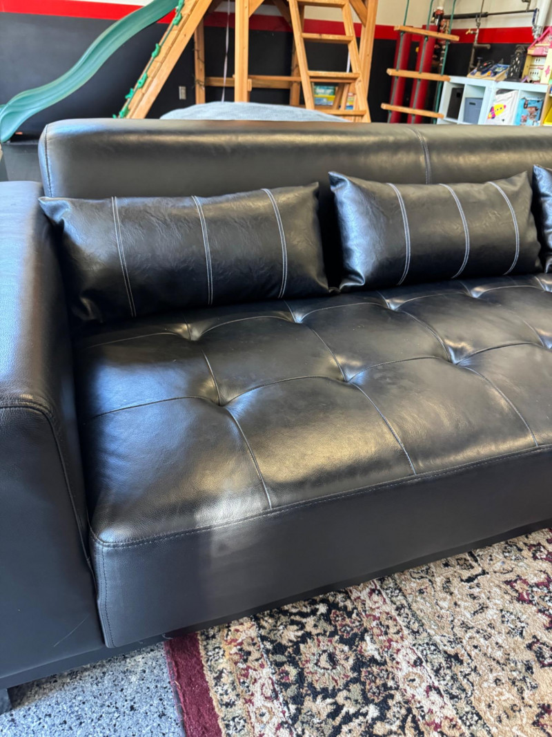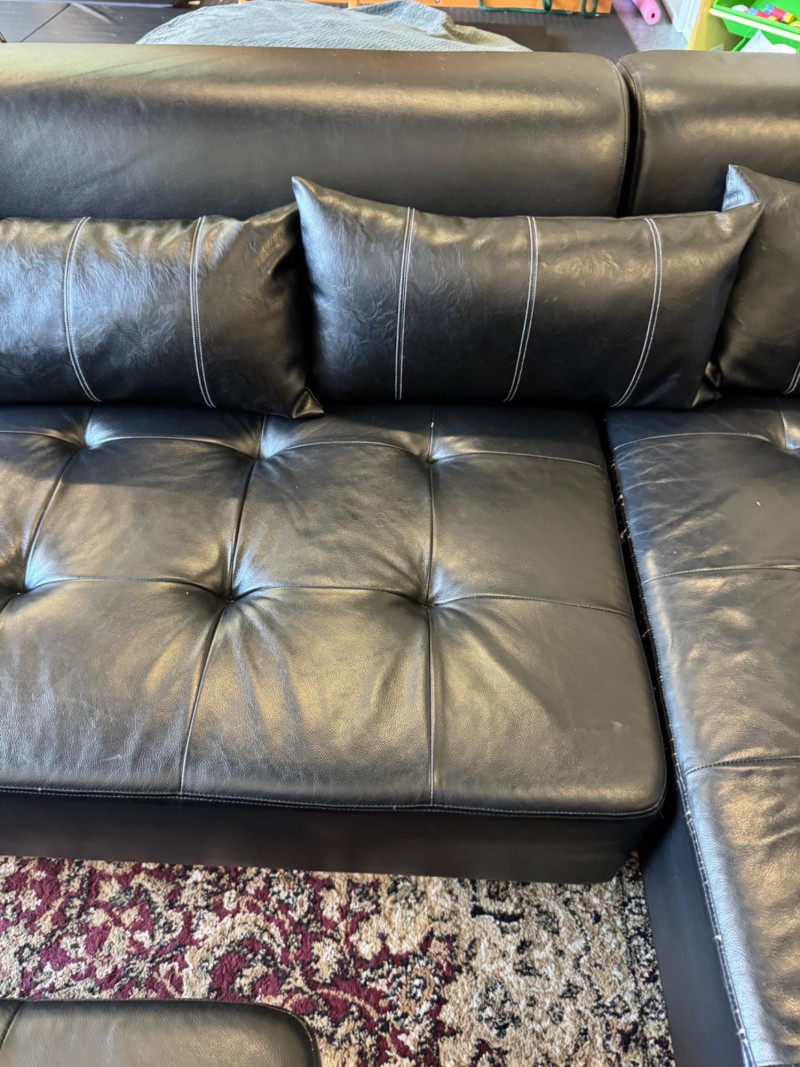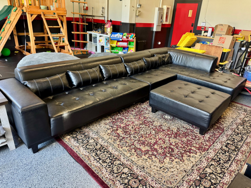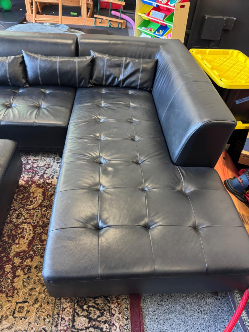 XL Tufted Black Leather Sectional Sofa w/ Ottoman. Dimensions: Sofa Total Length: 159 inches (long side) x 80 inches (short side) Seat Height: 15 inches tall Seat Back Height: 28.5 inches tall Ottoman: 36 inches x 38 inches (top dimensions), 15 inches tall Condition: Leather is worn on one section of the sofa. One leg shows wear/chipping. Refer to images for specific condition details. Bidding on this lot is an agreement that: (1.) You will have at least 2 capable, able bodied persons to lift and load at a minimum. (2.) You will bring a hand truck and/or any other tools needed to remove this item. If these steps are not followed your item will be forfeit and no refund given. 🚚 Auction Pickup Reminder: