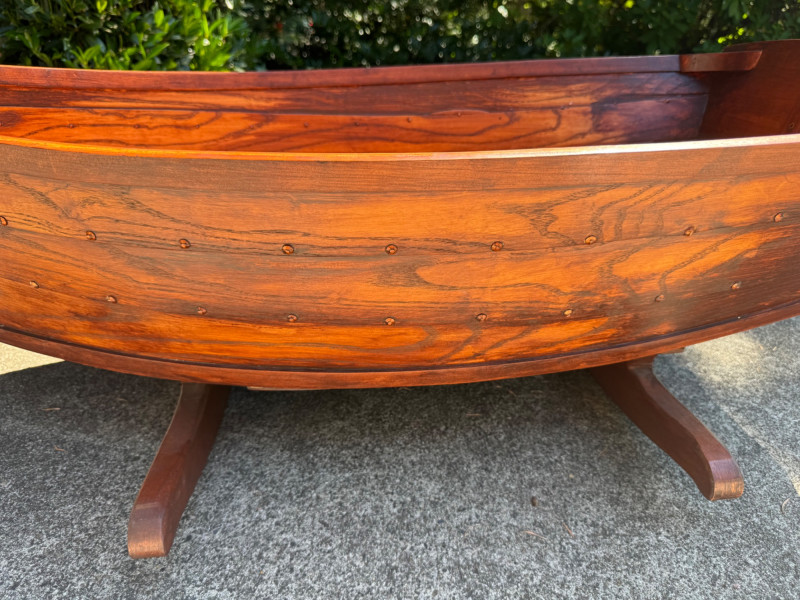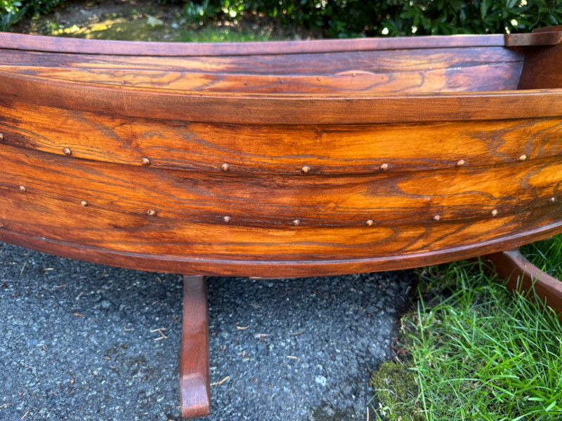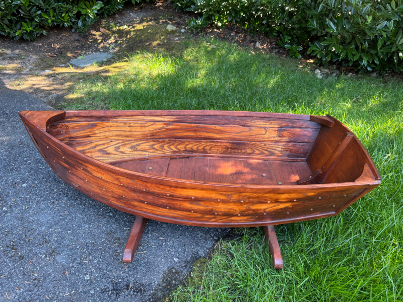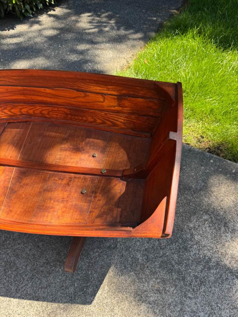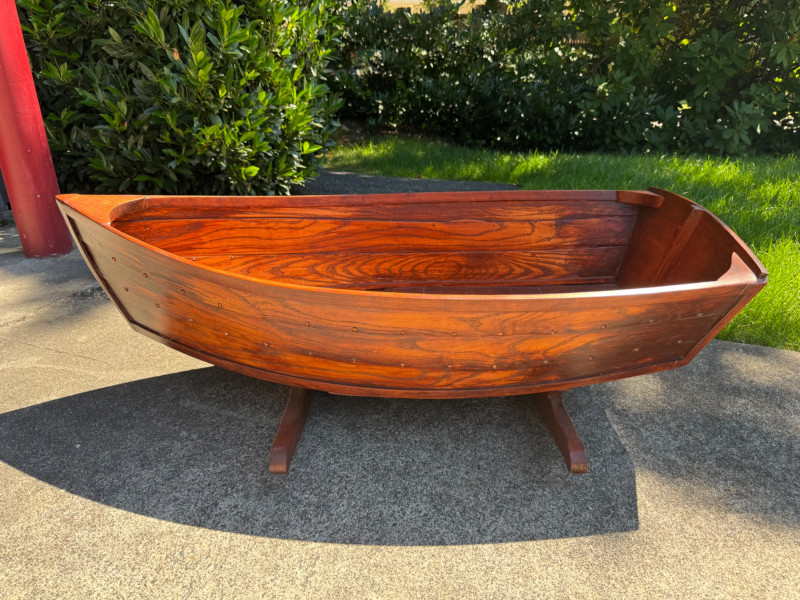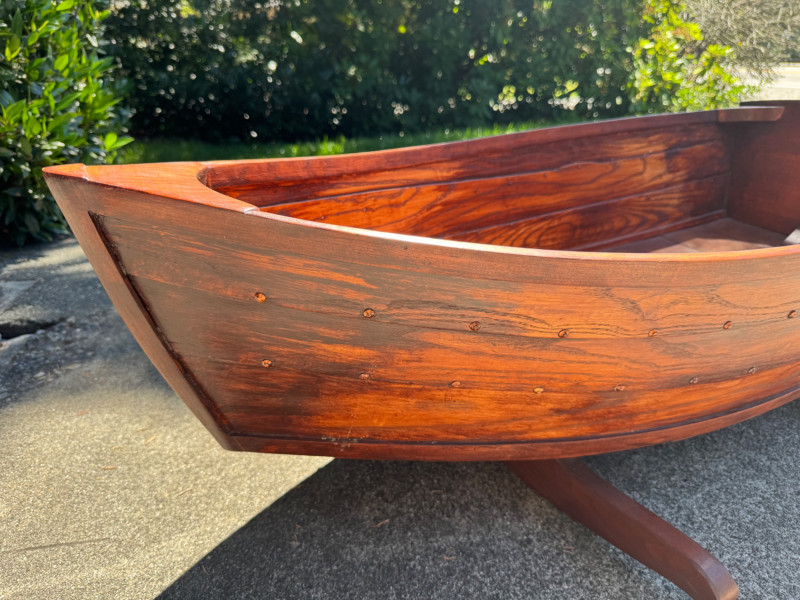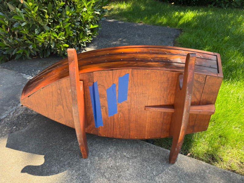 Small Wooden Decorative Boat, Natural Wood & Stained Finish. Dimensions: Length: 46 inches Width: 18.5 inches Height: 16 inches (including stand, approximate) Condition: Needs repair. Two boards require attention: one is cracked, and another needs to be re-nailed. Refer to images (areas marked with blue tape) for specific condition. Sold as-is. 🚚 Auction Pickup Reminder: