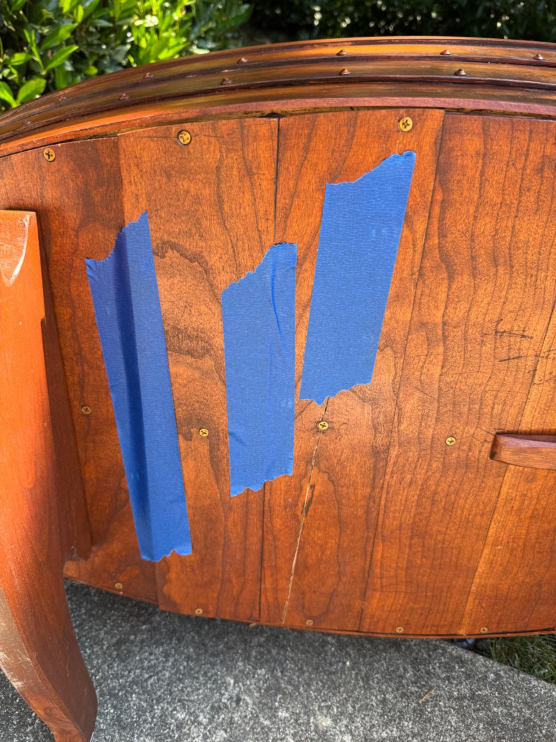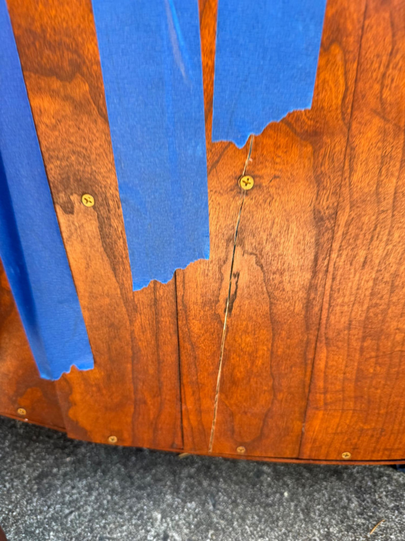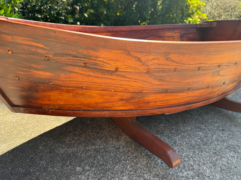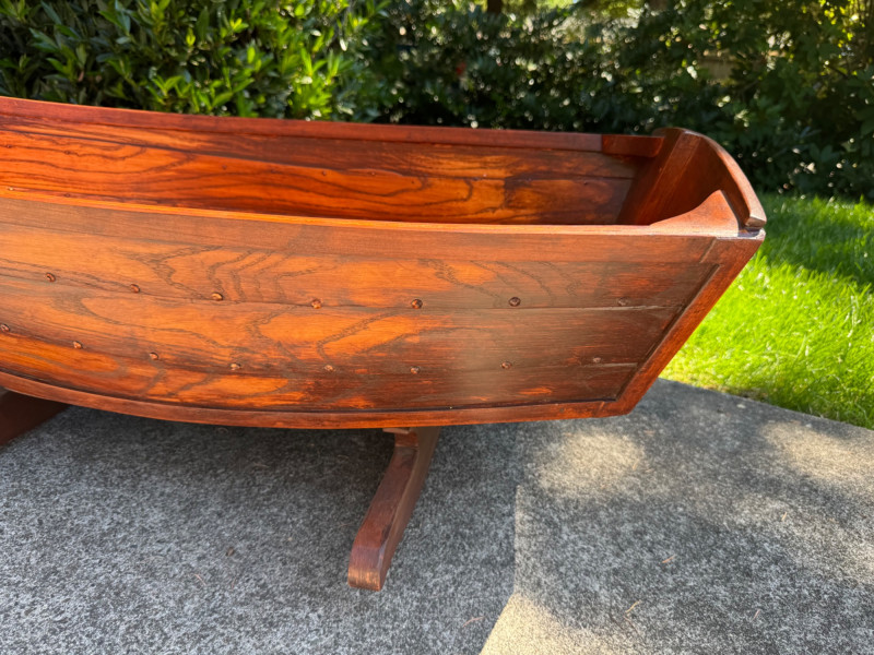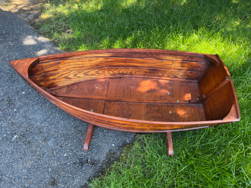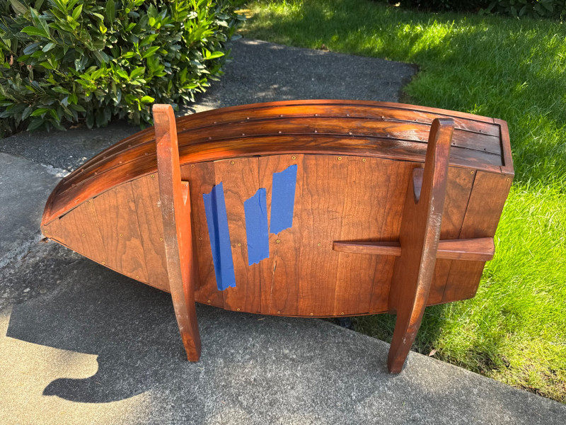 Small Wooden Decorative Boat, Natural Wood & Stained Finish. Dimensions: Length: 46 inches Width: 18.5 inches Height: 16 inches (including stand, approximate) Condition: Needs repair. Two boards require attention: one is cracked, and another needs to be re-nailed. Refer to images (areas marked with blue tape) for specific condition. Sold as-is. 🚚 Auction Pickup Reminder: