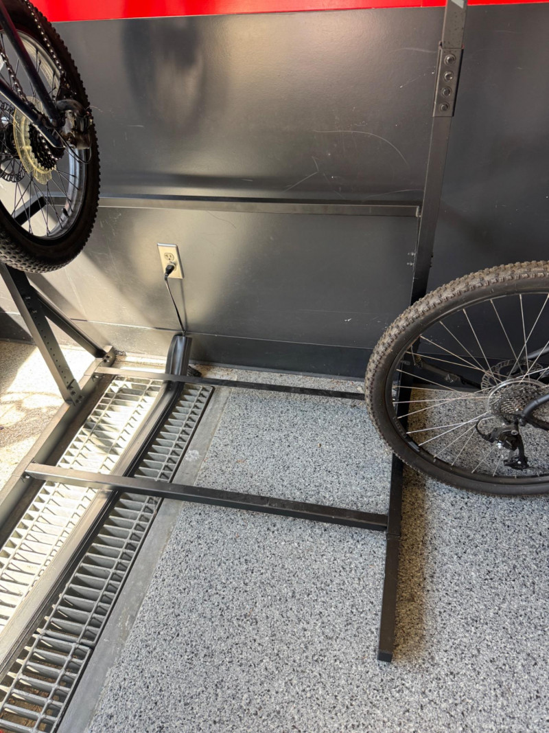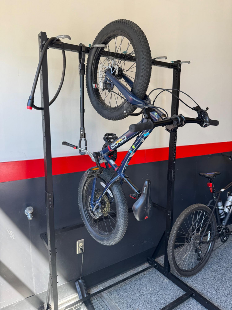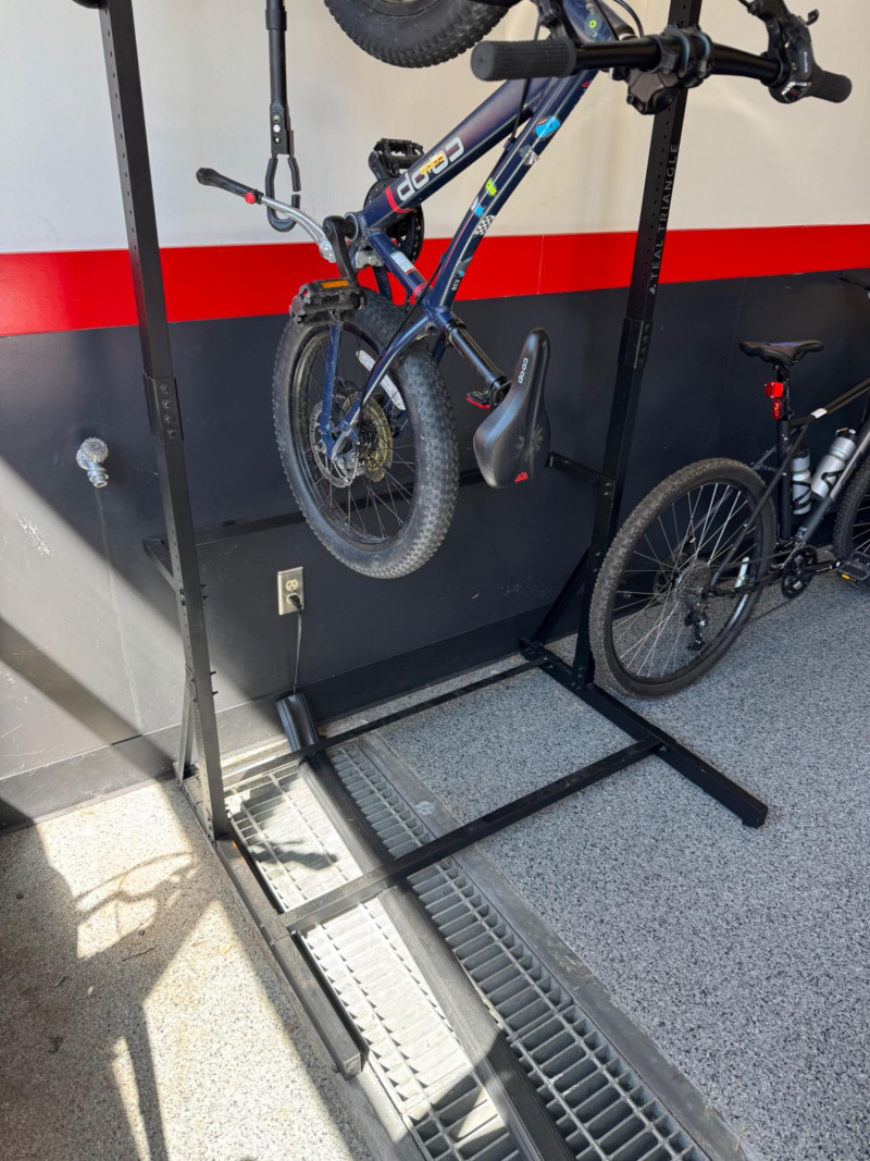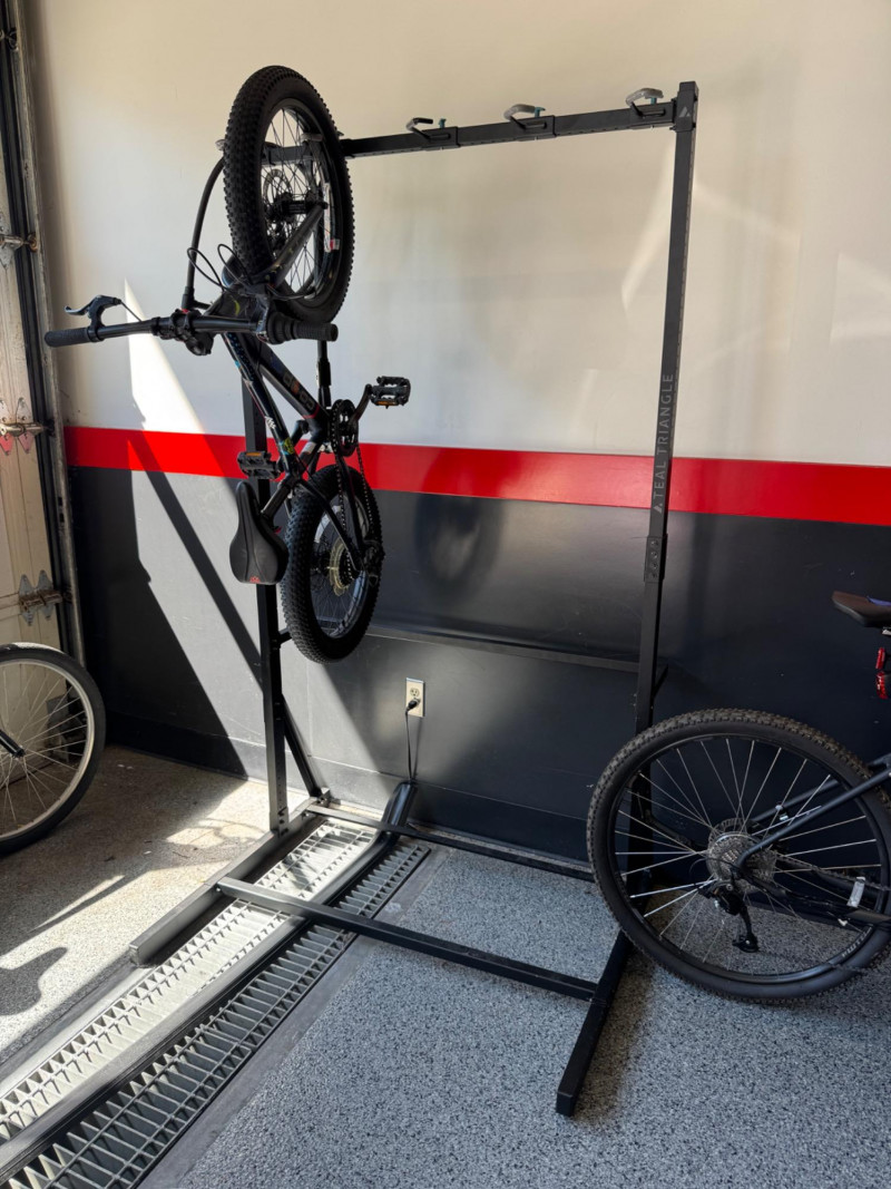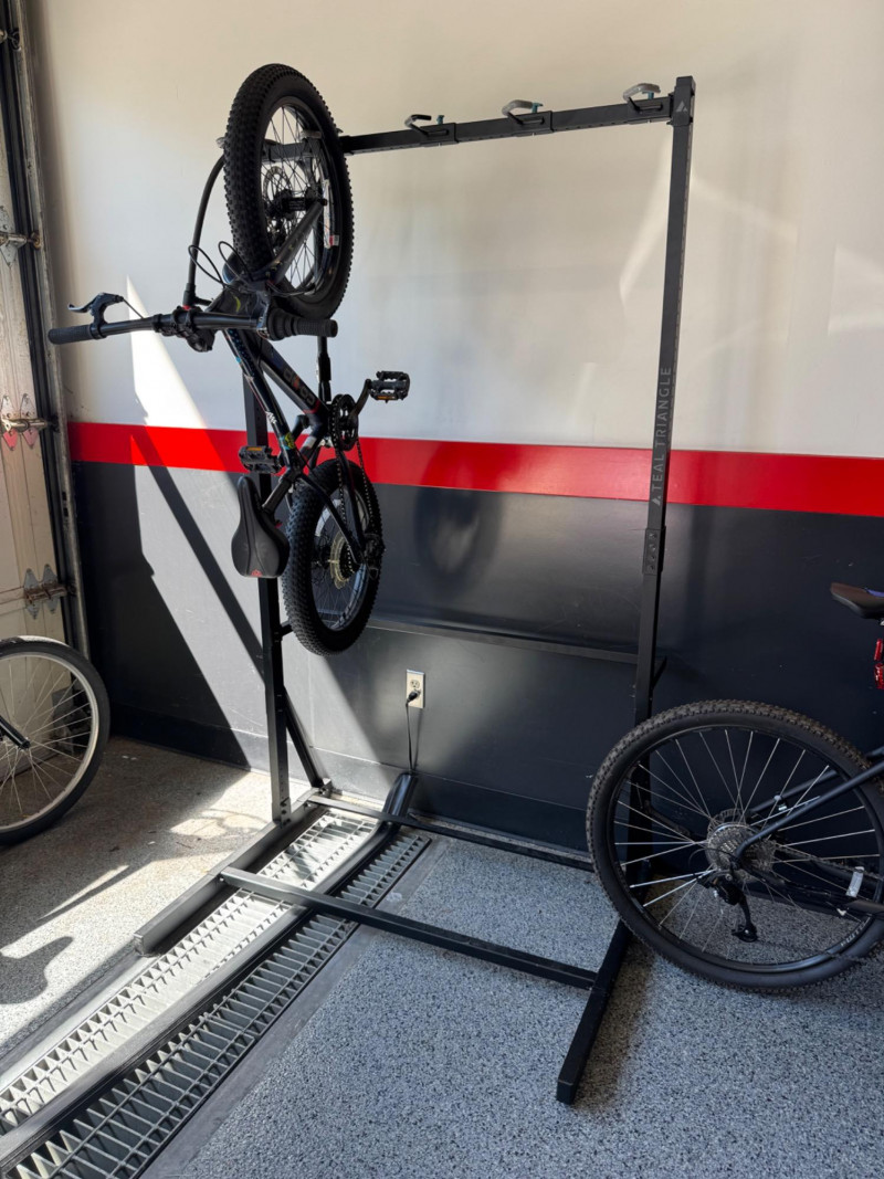 Teal Triangle Vertical Multi-Bike Storage Rack. Note: Bikes shown in images are for demonstration purposes only and are NOT included in this auction. 🚚 Auction Pickup Reminder: