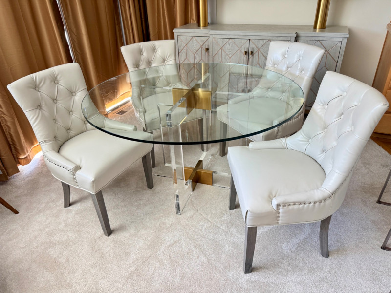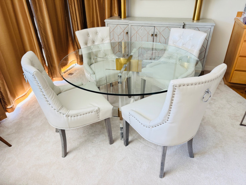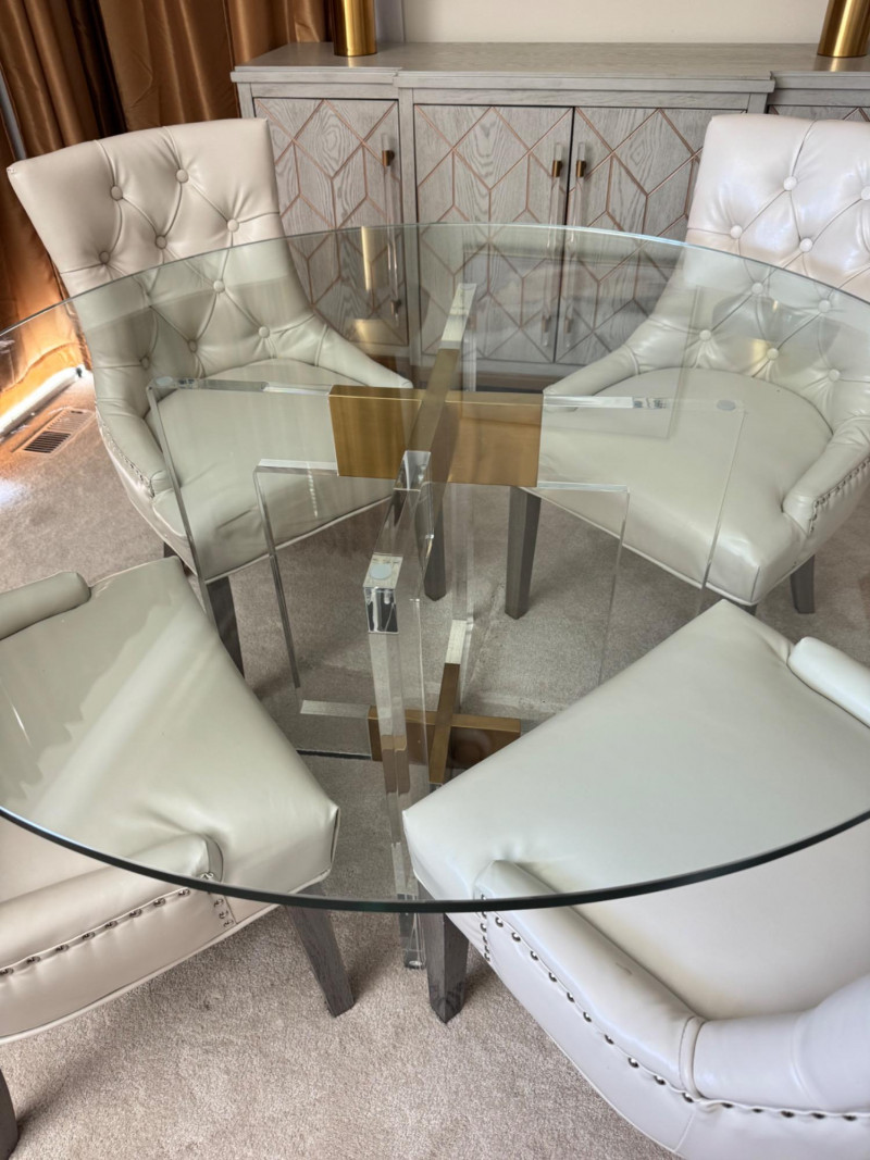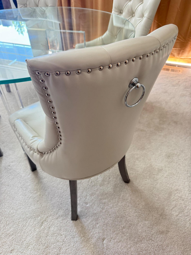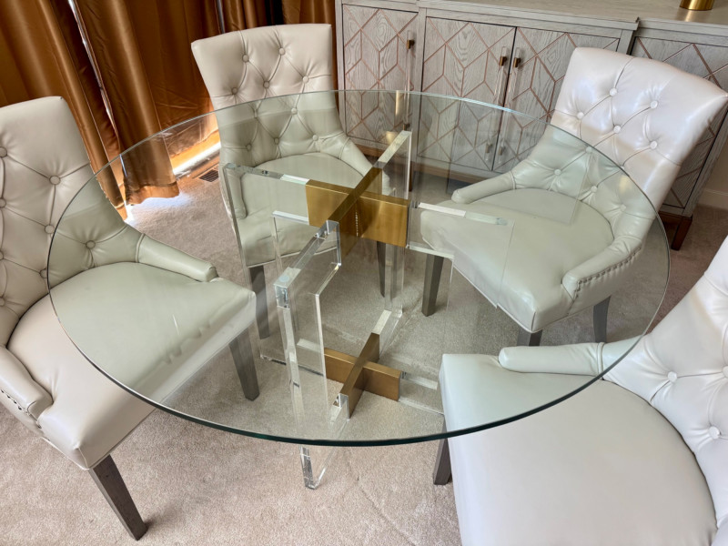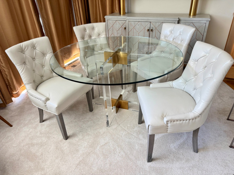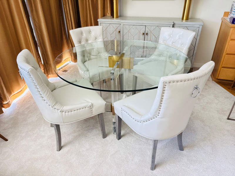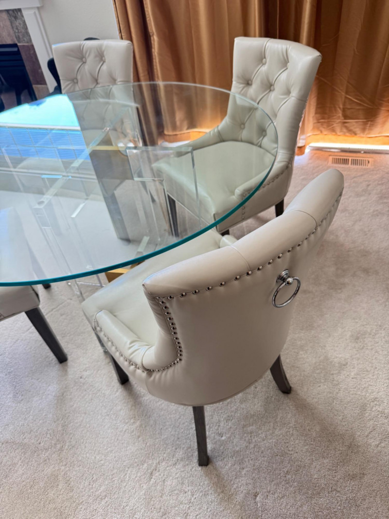 Glass Round Dining Table w/ 4 White Tufted Vinyl Chairs. Table Dimensions: Diameter: 53" Height: 30" Chair Dimensions (each): Width: 22" Depth: 20" Seat Height: 18" Back Height: 36" Disclaimer: Bidding on this lot is an agreement that: (1.) You will have at least 2 capable, able bodied persons to lift and load at a minimum. (2.) You will bring a hand truck and/or any other tools needed to remove this item. If these steps are not followed your item will be forfeit and no refund given. 🚚 Auction Pickup Reminder: